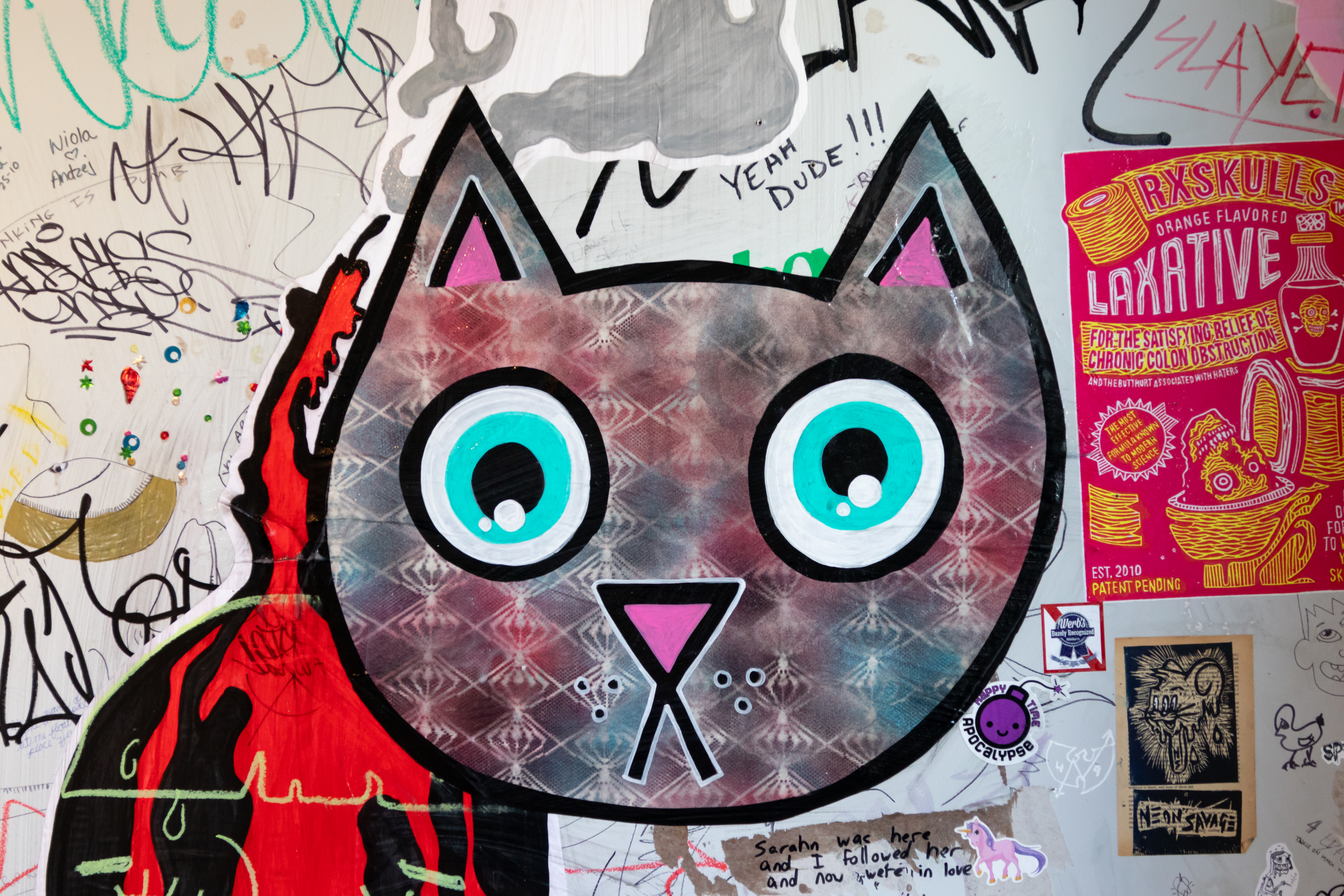 FF: I’ve always been into art, and then once I found street art… It’s something that I love, and it makes me feel so happy, and it’s just part of who I am now, and I feel like I will always do it. But I also really like the fine art world. I like bringing joy to people’s living spaces; I like making the bathroom at Love City Brewing more fun to look at. Blank walls are boring, whether they’re on the streets or in your house. Who wants to stare at a white wall? It’s just two different methods used to fill the wall. And it’s more fun sometimes to do shit you’re not really allowed to do. And it also is cool because you can reach such a huge audience! There’s millions of people in the city! The fine art thing is more serious, making money to support my family a little bit here and there.