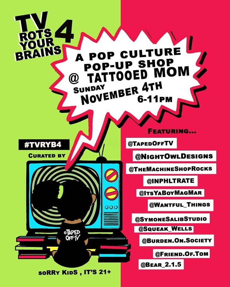 And on Sunday, November 4 from 6pm–11pm (21+) don’t miss the 4th installment of TV Rots Your Brains 4: Pop Culture Pop Up Shop at Tattooed Mom curated by TapedOffTV (the artist formerly known as Rainbow Alternative) and featuring some of Philly’s favorite street artists and creative makers. Come hungry, come thirsty, come ready to shop!