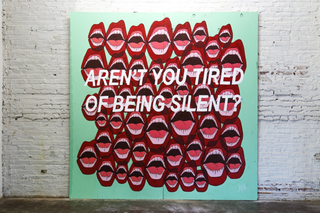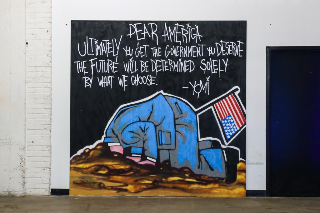 I’ve admired street art for as long as I can remember. Walking down the street became like walking through a museum—ever-inspiring, ever-changing, ever-accessible. After a lifetime of creating art that stayed in my room or hung in galleries, I dove into street art during a time that my health plummeted in ways I never imagined. For months, I quite literally could not speak, my words a sea of vowels. But a fire inside me ignited during that time—I had so much I wanted and needed to say. I demanded to be heard. In this current political wildfire, I believe that demanding to be heard is both rebellious and patriotic. I intended this piece to convey the urgency of action; the need for a fulcrum shift. I hope this inspires and moves whoever sees it to feel like I did after I was able to speak again—full of fire and direction.