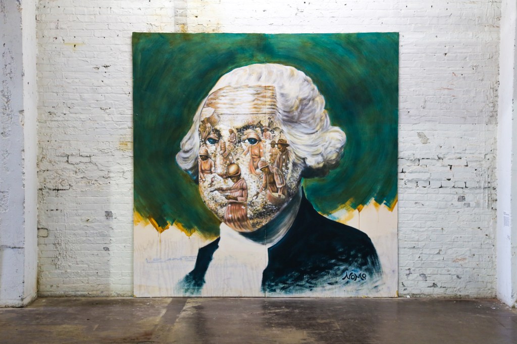 In this vivid image, the countenance of George Washington—this country’s first president—gives way to reveal the leagues of enslaved Africans conscripted to a life of violent labor. Washington, Portrait of an American President is a depiction of the intimate connection between the origins of American wealth and the horrors of American slavery.
