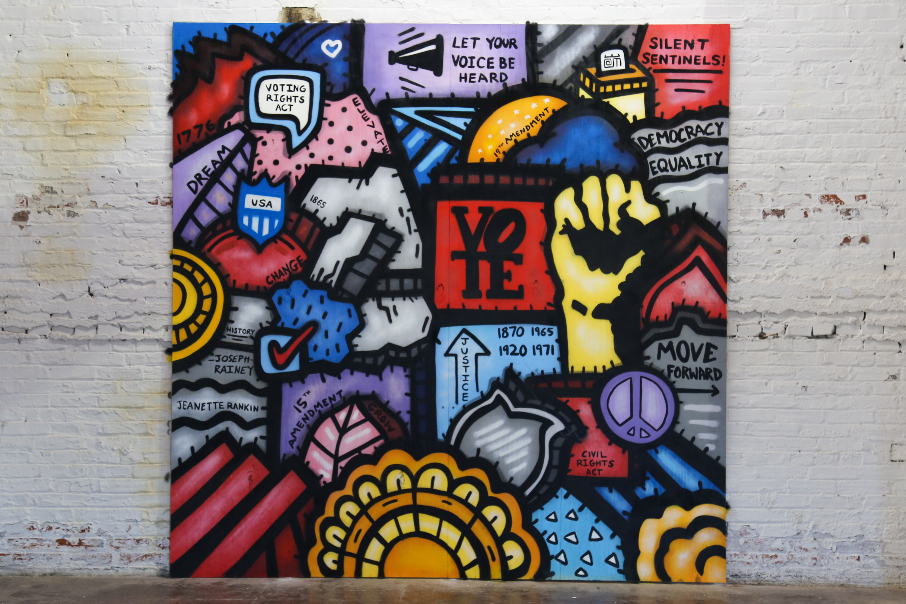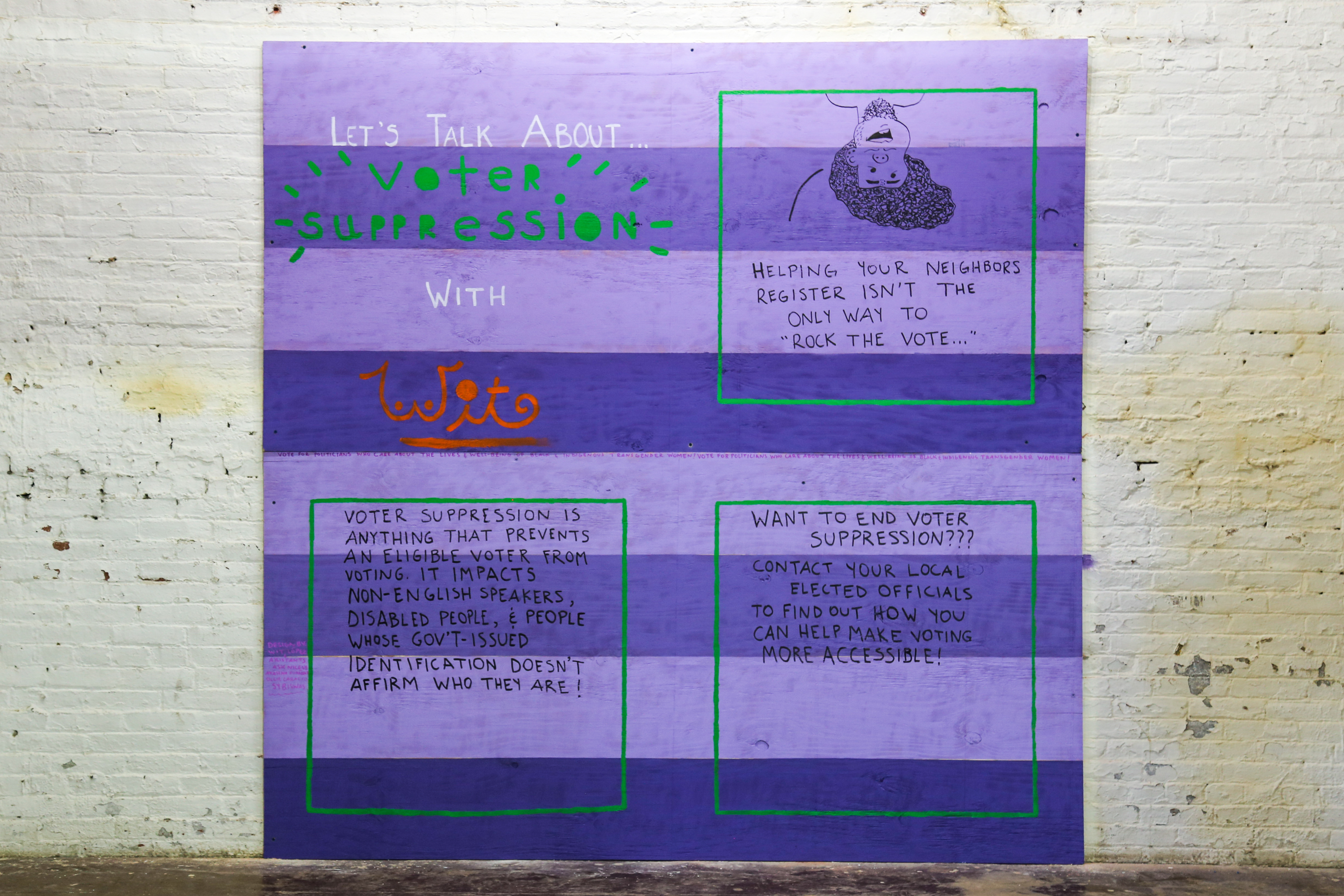 This mural serves as an infographic on top of an infographic on top of an infographic. It is intended to highlight the multi-layered issue of voter suppression, and how it can hinder people of voting age from registering and registered voters from voting.