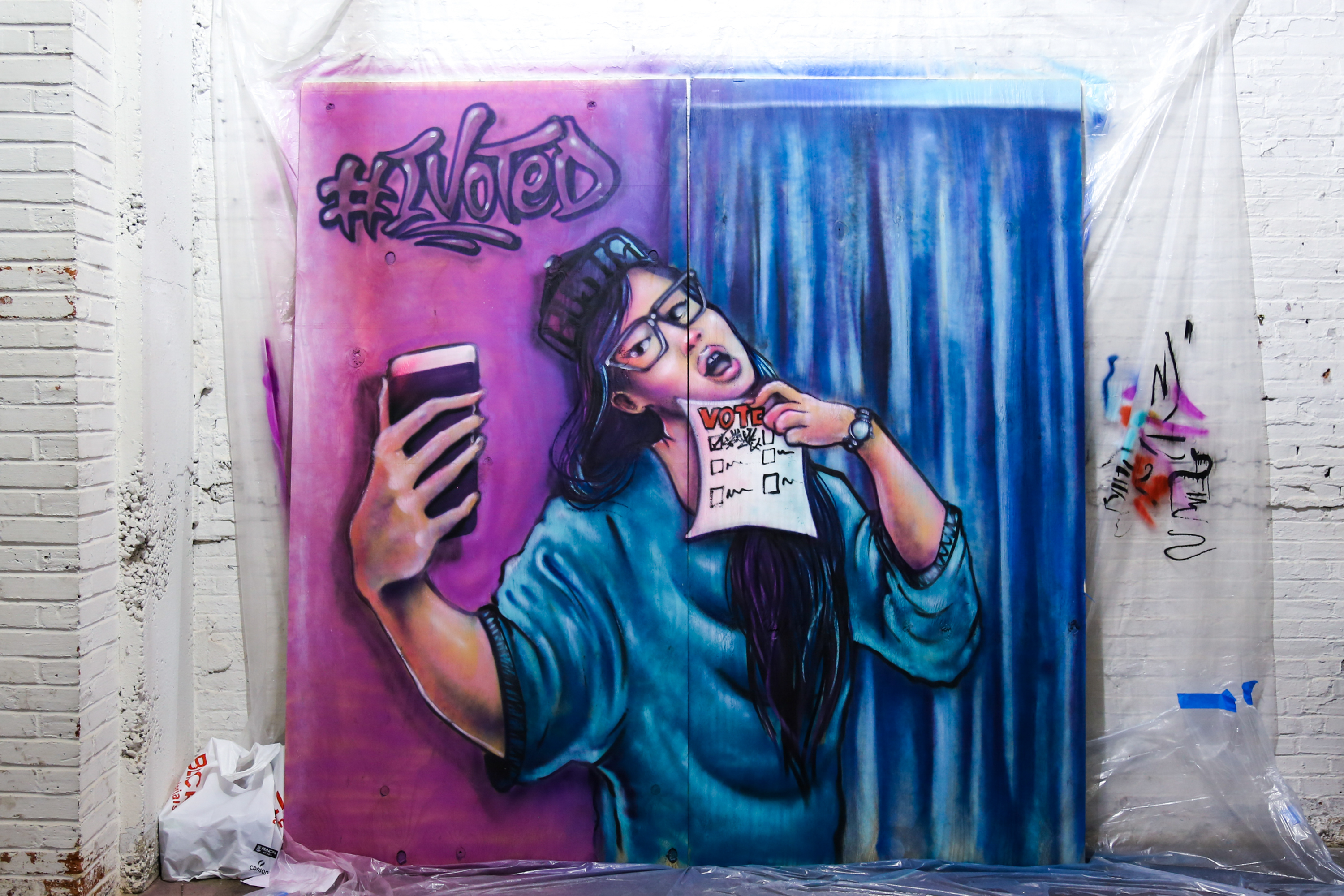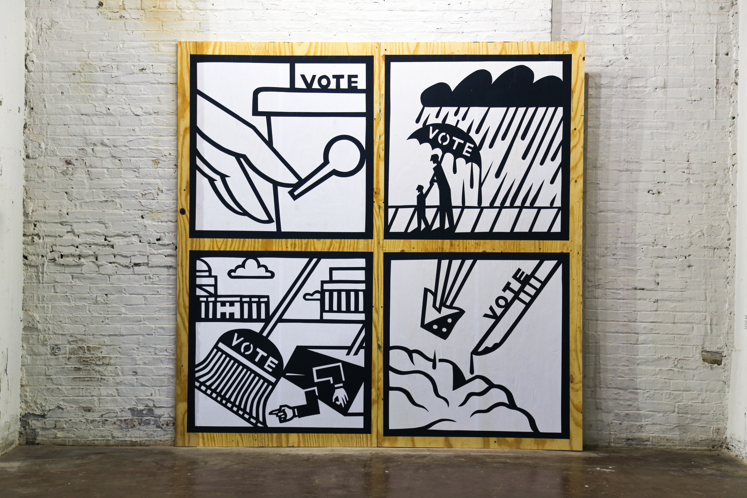 To the Polls was a mural exhibition that took place at 448 N. 10th Street in Philadelphia’s Spring Arts neighborhood from from September 26, 2018 through October 3, 2018. Organized and curated by Streets Dept’s Conrad Benner with support from Mural Arts Philadelphia, the exhibition worked with 10 Philly-based artists to create 10 temporary 8×8-foot murals to rally the Philadelphia community around civic participation through the act of voting.