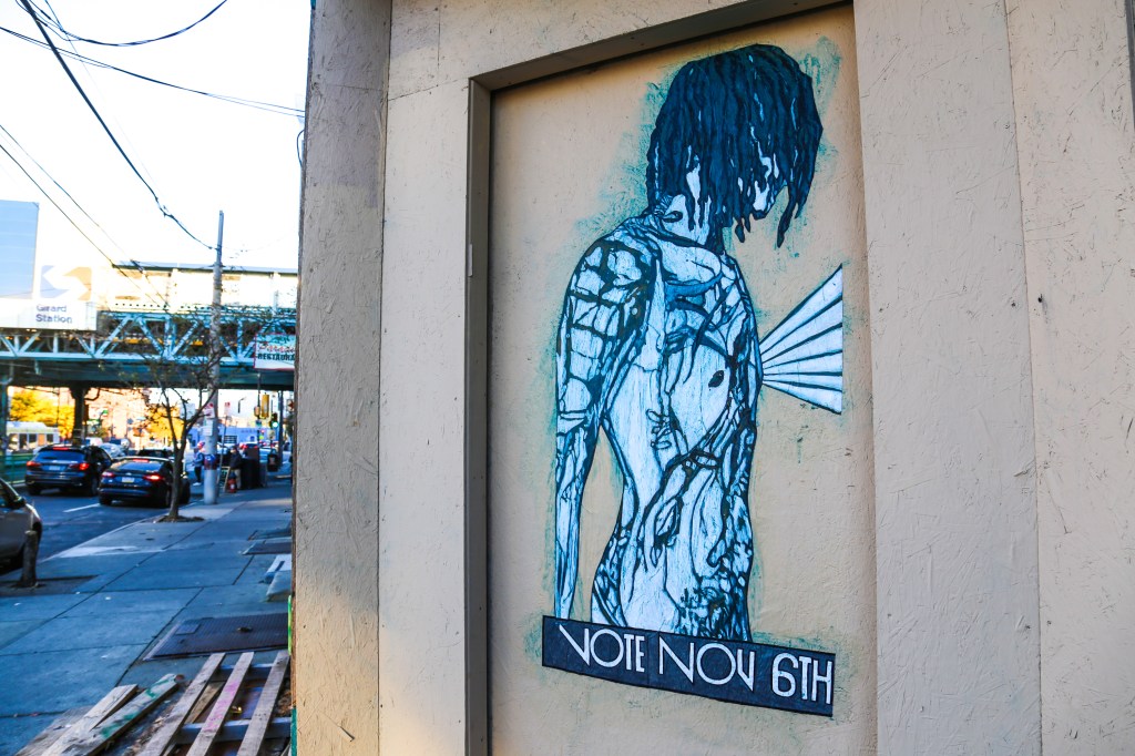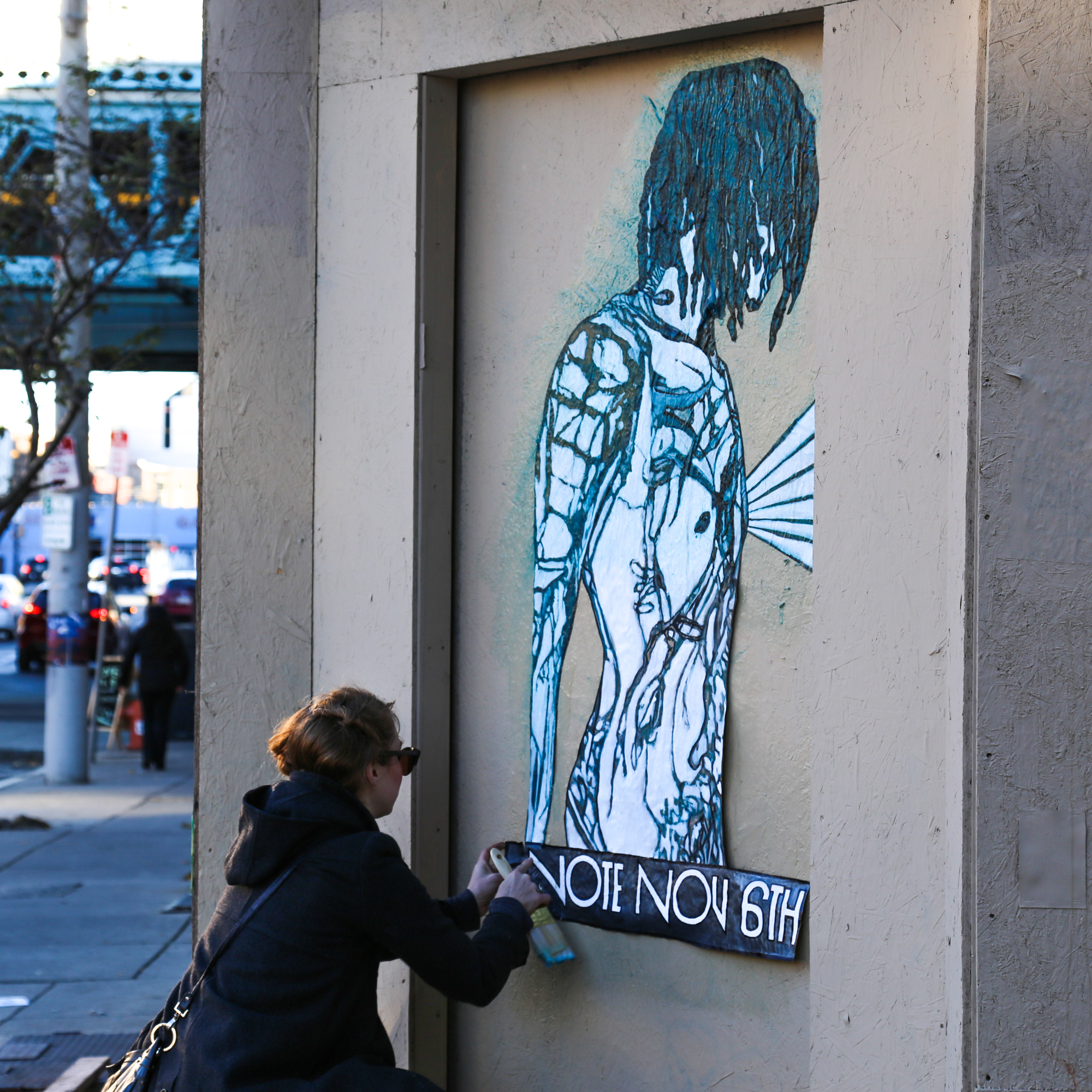 “I’ve created a number of very large outdoor installations with fabrics and sculptures along with painting murals but I had not created a wheatpaste before. While thinking of ideas of what to create understanding the importance of the upcoming mid-term election I decided to create a wheatpaste that would hopefully be encouraging and a great reminder of the fast approaching election on November 6th.”