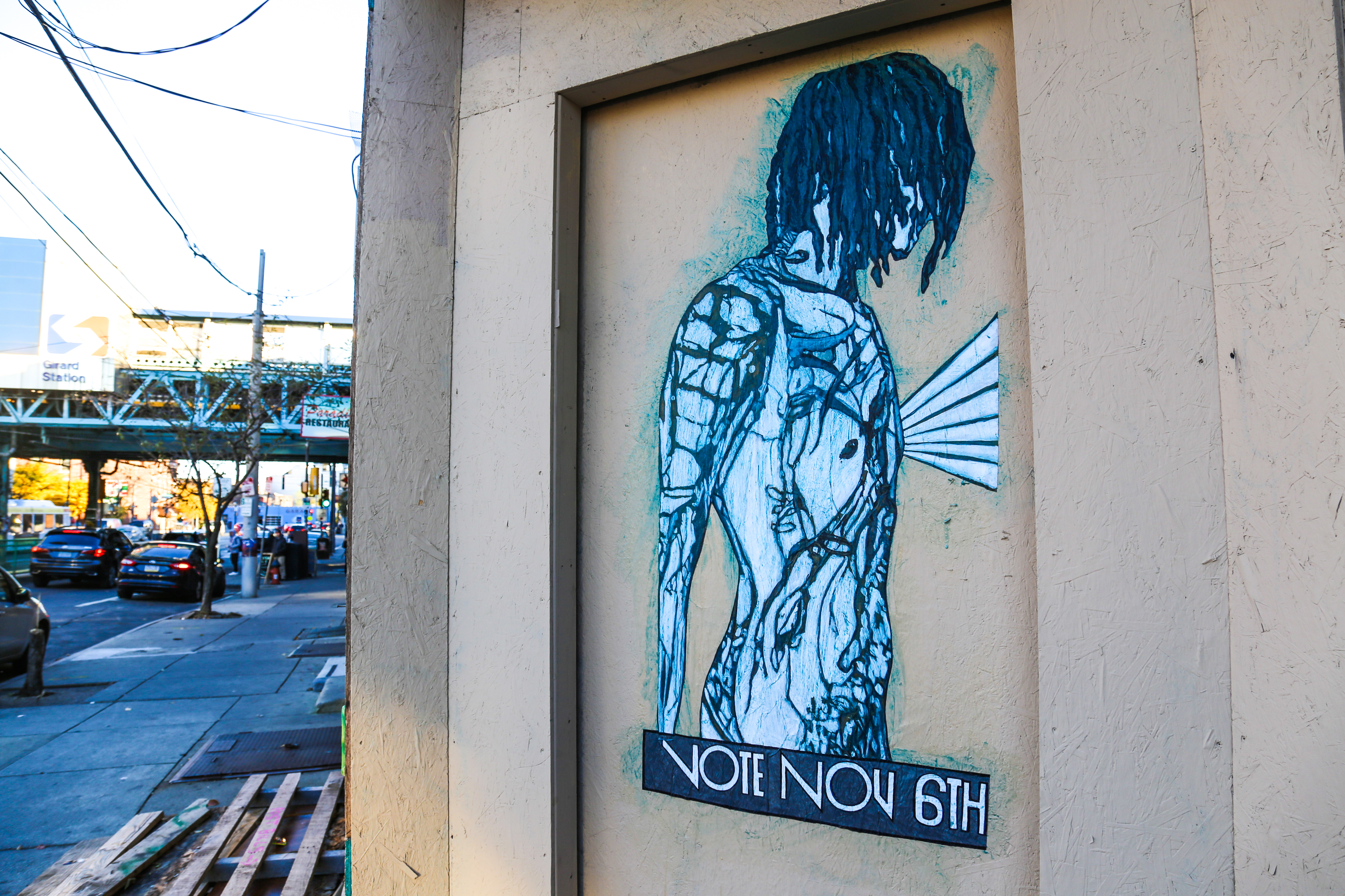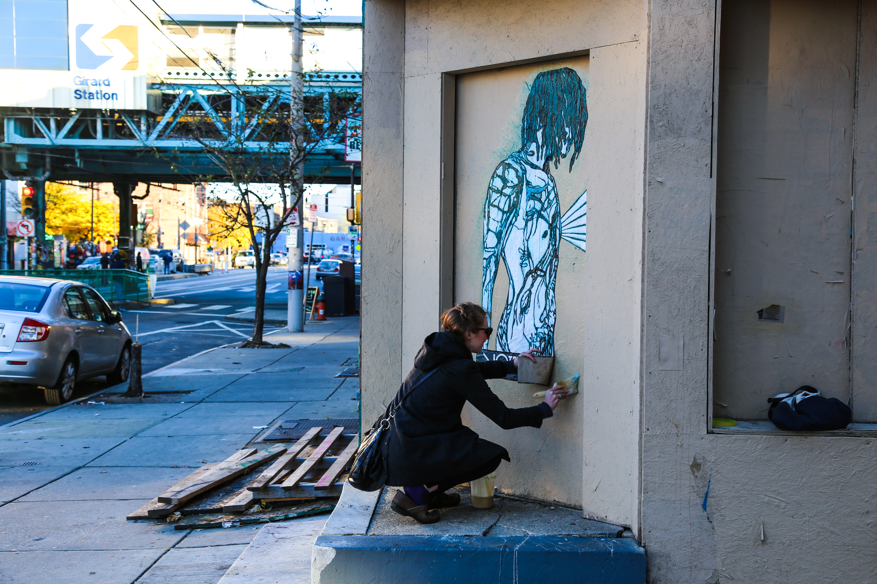 The paste, which is located on Girard avenue at Hope street, is the first piece of street art from Jessica, “Since January I’ve been coordinating with an artist from France to host him and the collective he is a part of called Arsmuralis, a group of underground french street artists. During their stay in Philadelphia this past mid-October they encouraged me to create my very first wheatpaste.”