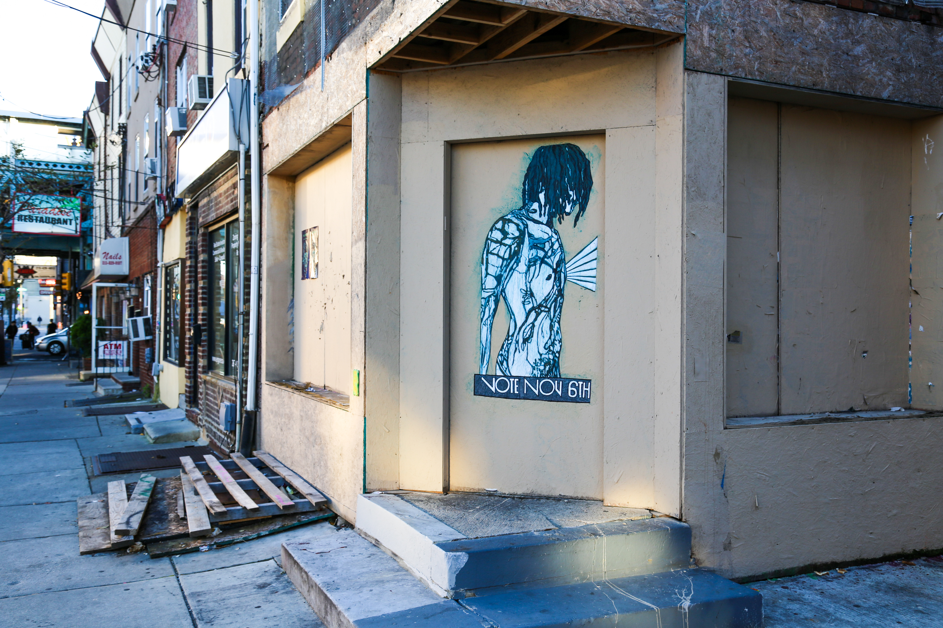 New wheatpaste this week by Philadelphia-based artist Jessica Gamble reminds passersby to vote on November 6th! “Every election is extremely important and this November’s election is no exception. Every person’s voice and vote matters immensely. I hope everyone uses the power of their voices this election and every election in the future to fight for our democracy,” Jessica responded in an email follow up to learn more about the how and why she created and installed this piece.