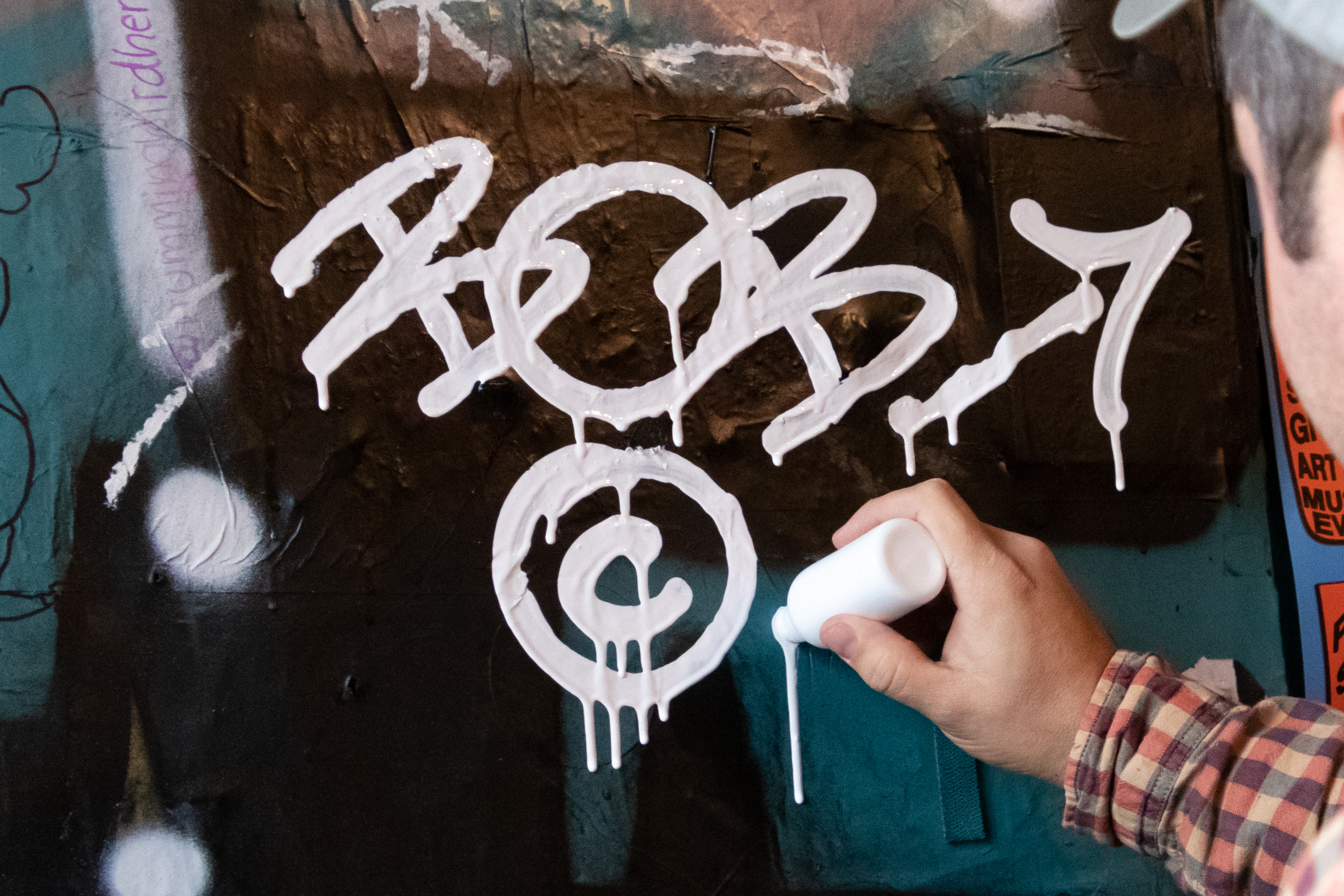 But Bob started, actually, when the internet became more available. I would just get on Google to look up graffiti; like why do people do this? because it was so interesting to me. In Europe at the time, people were doing more of the stickers like what we see here—characters and logos and things. That’s kind of what got me into Bob, because at the same time, I was going to school for design. So graffiti letters were really interesting to me and I liked doing it, but once I saw that people were doing it with logos and designs and stuff, I was like I think it would be cool to do THAT—to come up with my own logo that I could put everywhere.