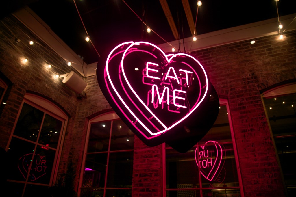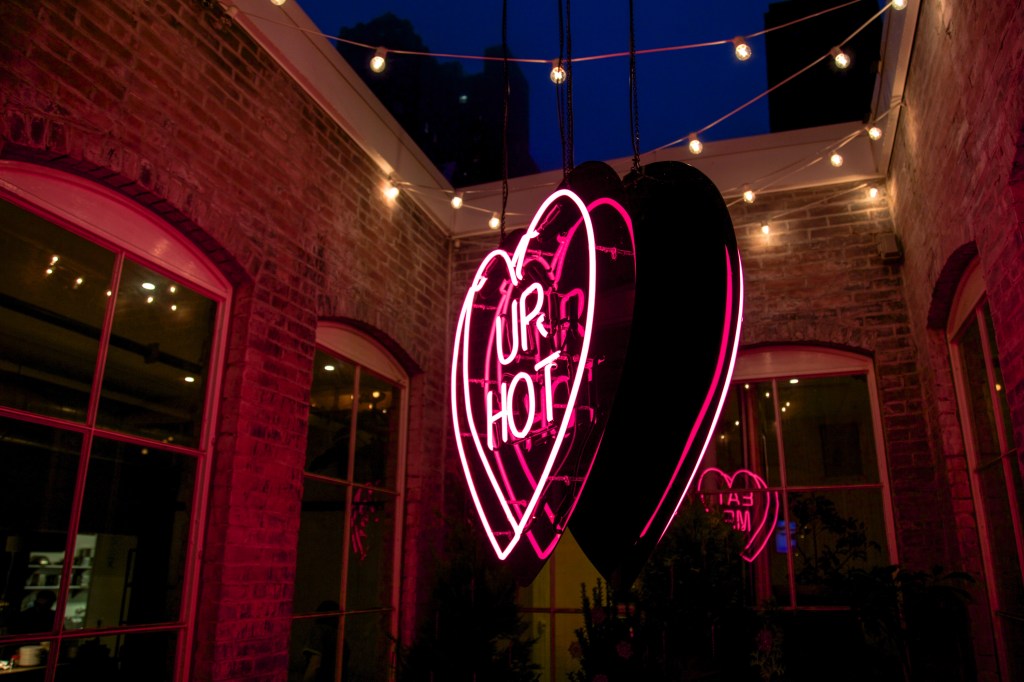 “Something that I’ve always loved about the Goth/Power Hearts is that they truly have so many meanings depending on where they are placed and what mind is interpreting them. Personally my work feels very intense and emotional because it’s coming from my deepest feelings, heart, and soul. The words shared represent all different types of struggles, love, relationships, the rebuilding of myself, and personal growth. With this installation, GLOW, I have had the opportunity to take a lighthearted spin on my work. Originally intended to speak to sassy dating or relationship banter, these words instead take a fun and playful twist when presented in a food establishment. Are you talking about me or my taco? Or is my taco talking to me? The space at Mission is filled with an undeniable glow, and I’m excited to share my work as pure eye candy – it looks delicious!” -Amberella
