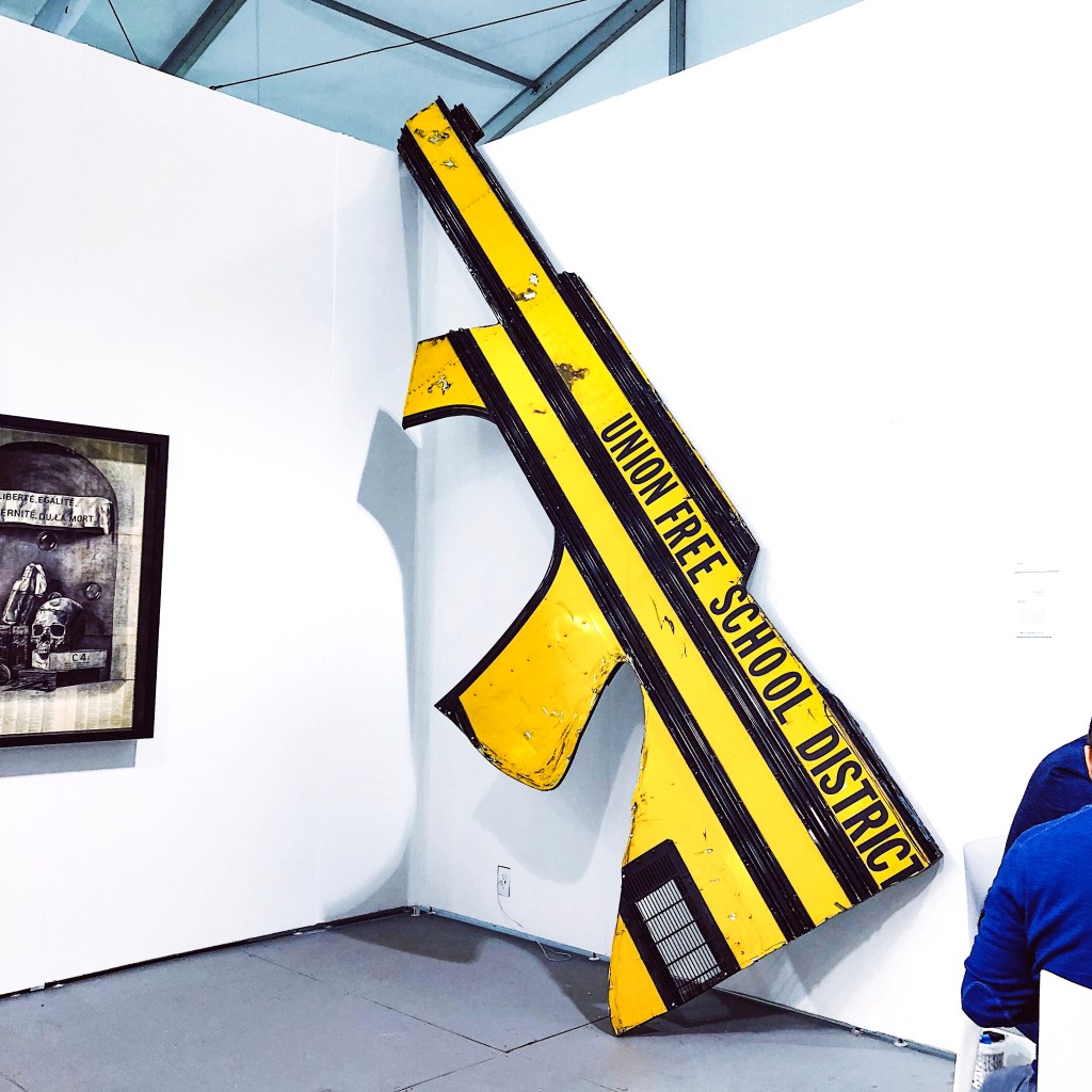 I choose an “a” and “b” here because I like both of these installations that address the same issue for different reasons, and given the scale of the problem of gun violence in the U.S. it seems fitting to keep both of these artworks on this list. Above, I like the simplicity and scale, it reminds me of something that would work really well to gain people’s attentions and thoughts installed outside in a public space. Below, the installation made me see the bodies, the students’s bodies, who might one day soon realistically be expected to wear such protections while getting their education and about how sad and ridiculous that is.