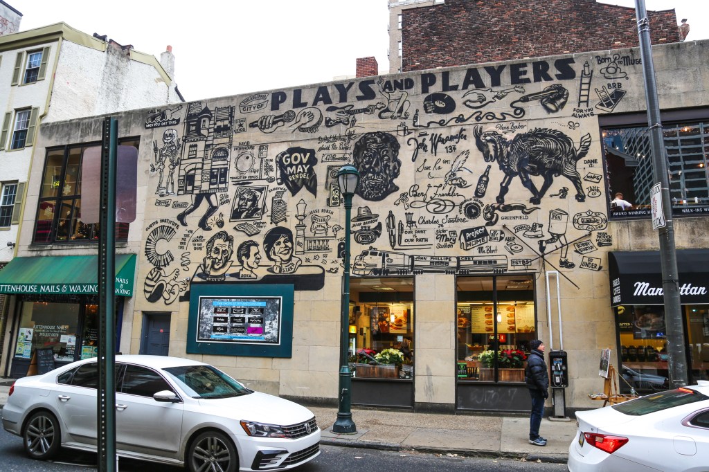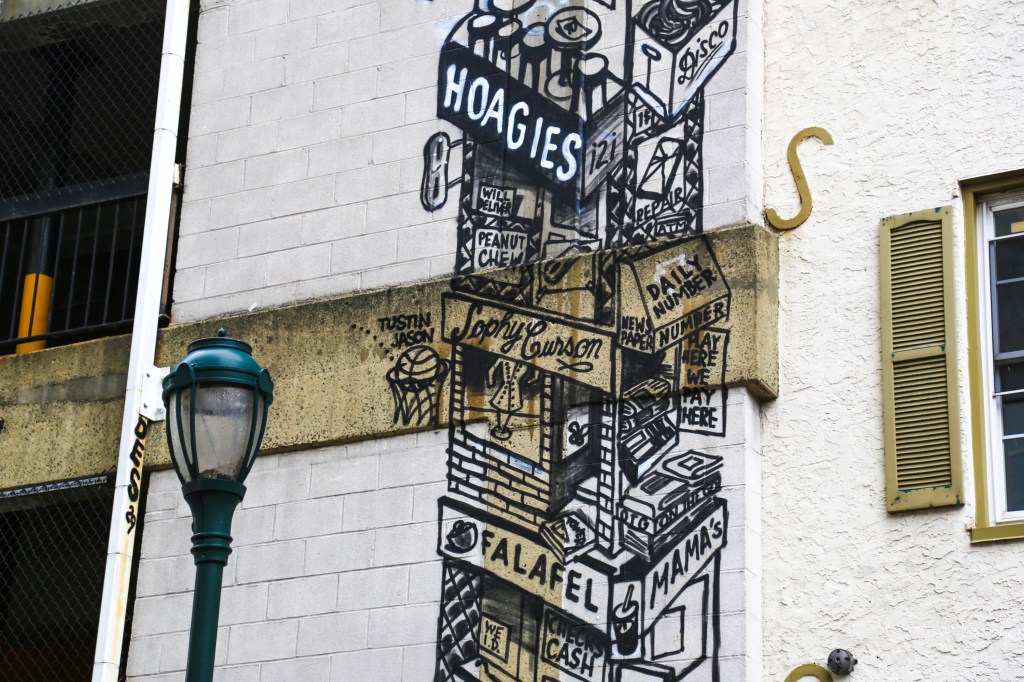Steve Powers second mural, which stands about five stories high, appears to depict namely small businesses in and around the Rittenhouse area. And it is perhaps a more subtle node to Philadelphia immigrants and the fact that immigrants are and have always been crucial to our city and our country’s economy. As Forbes pointed out in an article this past summer, “Immigrants form 25% of new U.S. businesses, driving entrepreneurship.” When beginning his piece, Steve wrote the following along with a photo of the mural to his Instagram: “The story of America is immigration. The end. It’s also the beginning of every good story about America. This particular story is about 5 stories tall.”
