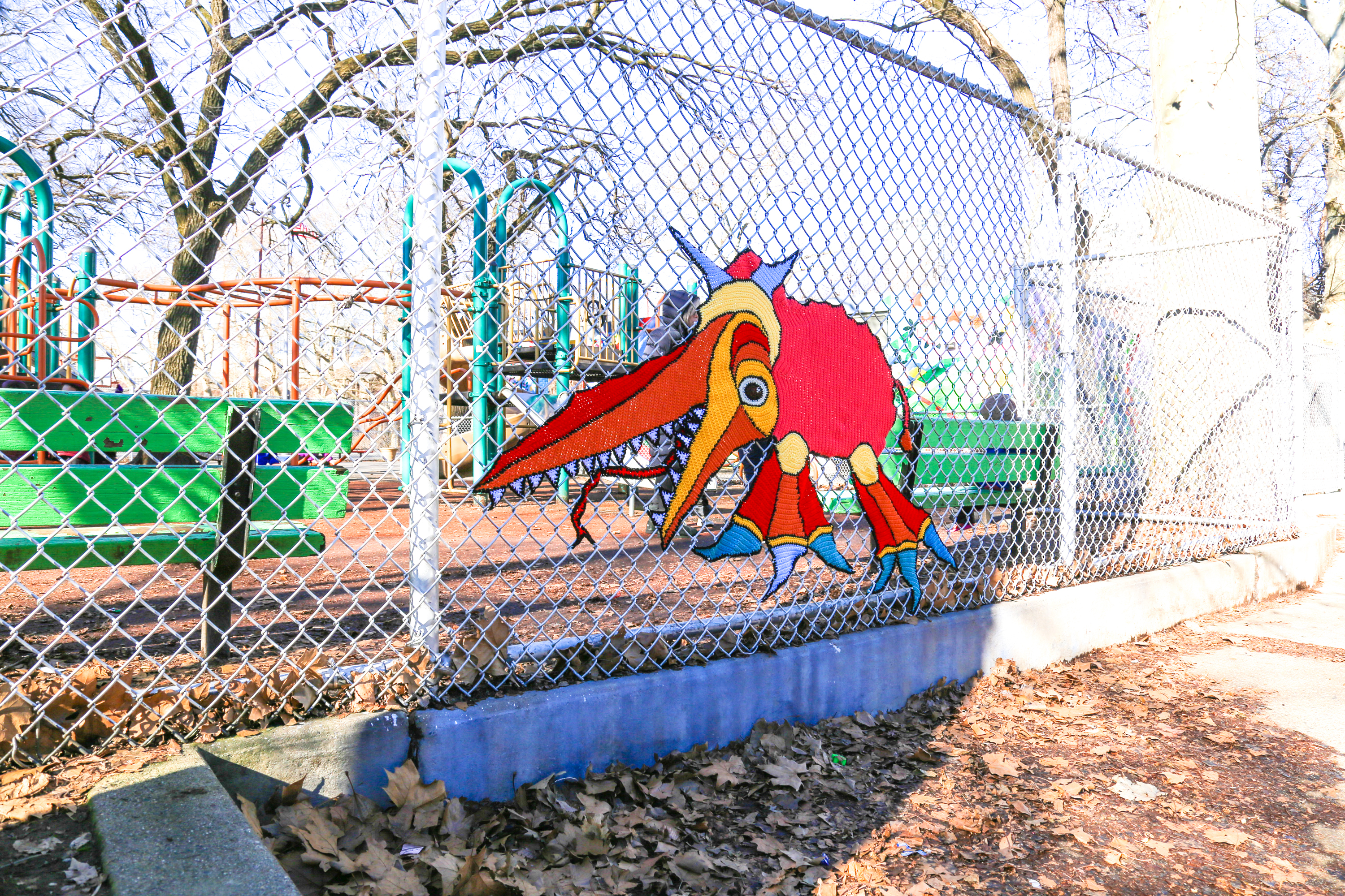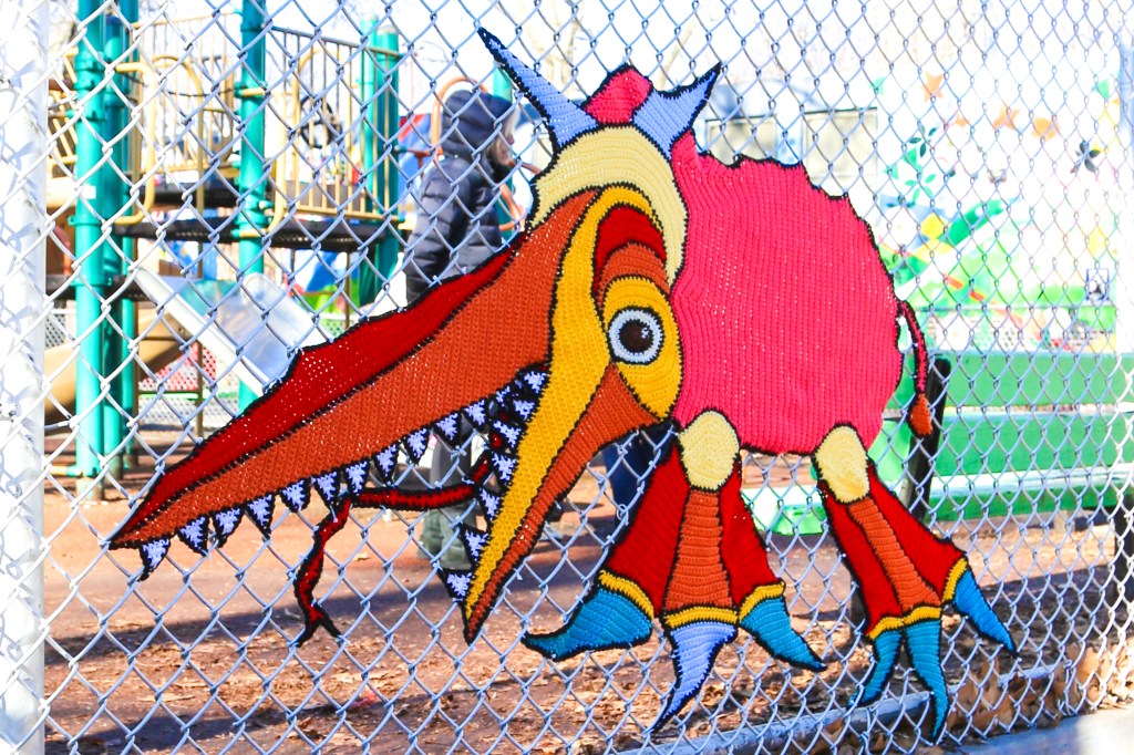 A new yarnbomb creature from J. Curtaz (aka Binding Things) can now be seen crawling along 6th street between Lombard and South streets outside Starr Garden Playground in Bella Vista!
