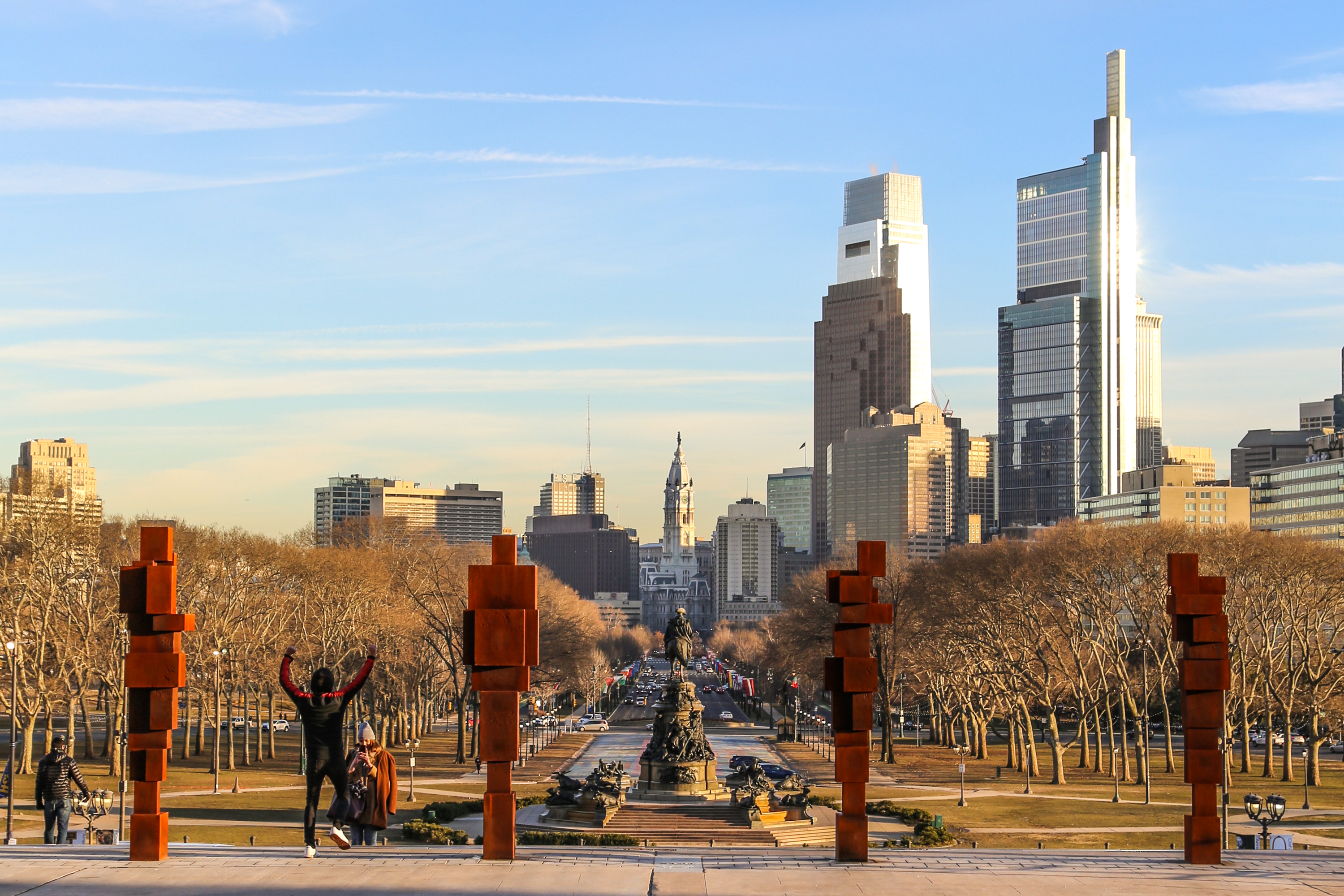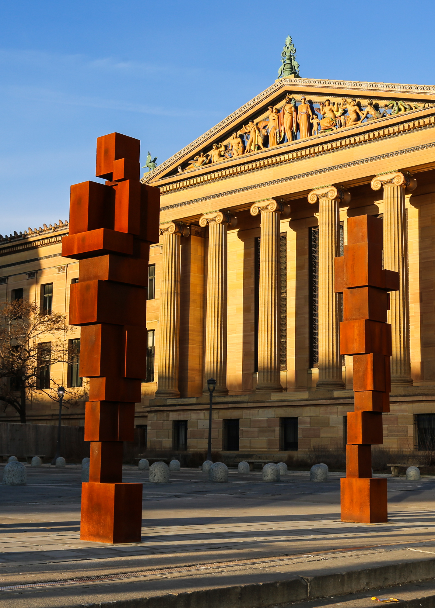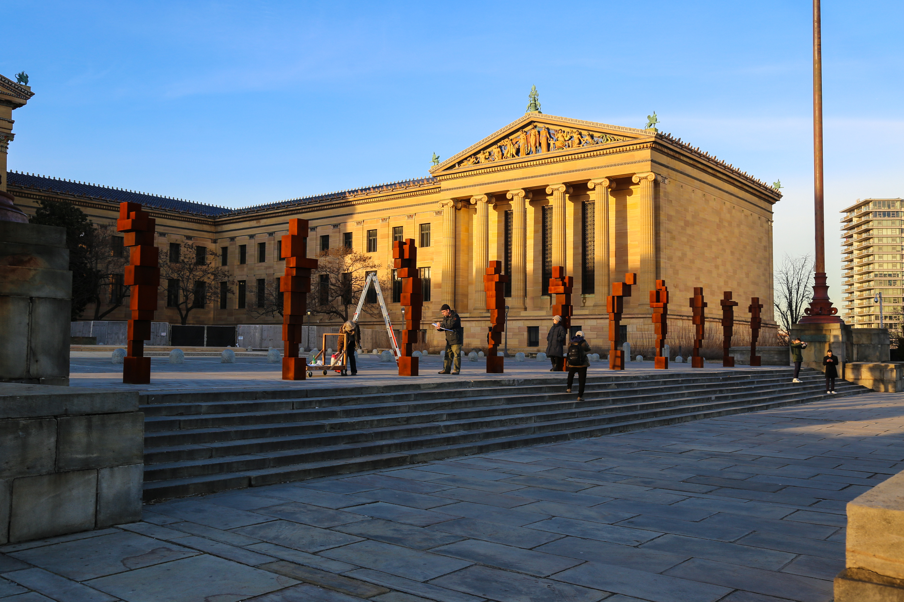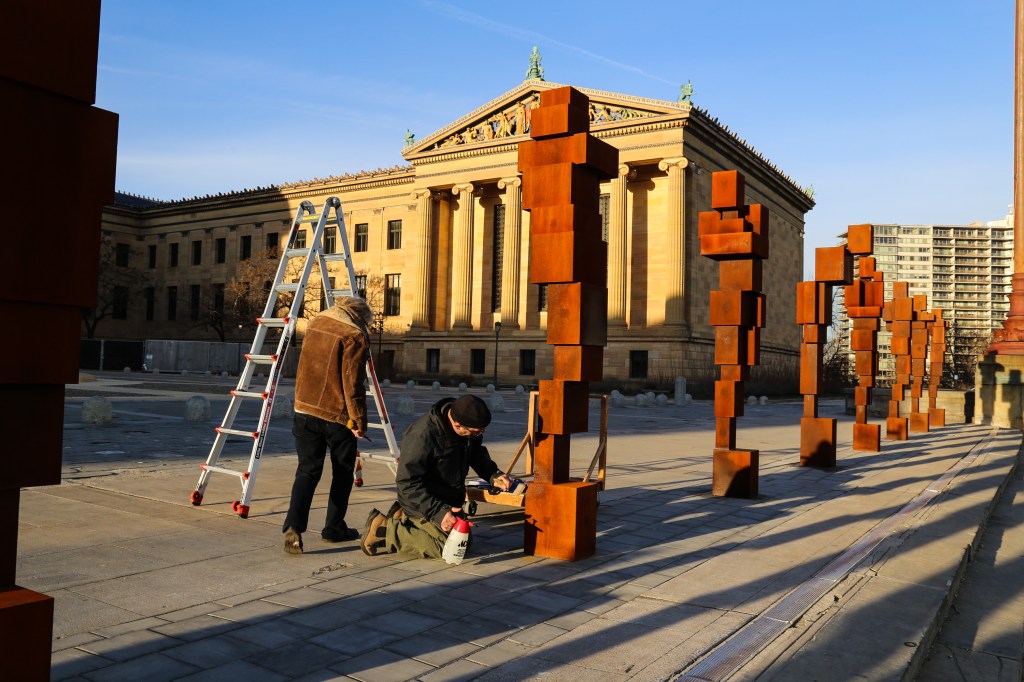 10 new cast-iron blockwork sculptures appeared at the top of the Philadelphia Museum of Art’s famous steps this week, the work of British artist Antony Gormley. A temporary installation that will be on view now through June 16, 2019, each sculpture is spaced evenly apart and together they’re titled STAND.
