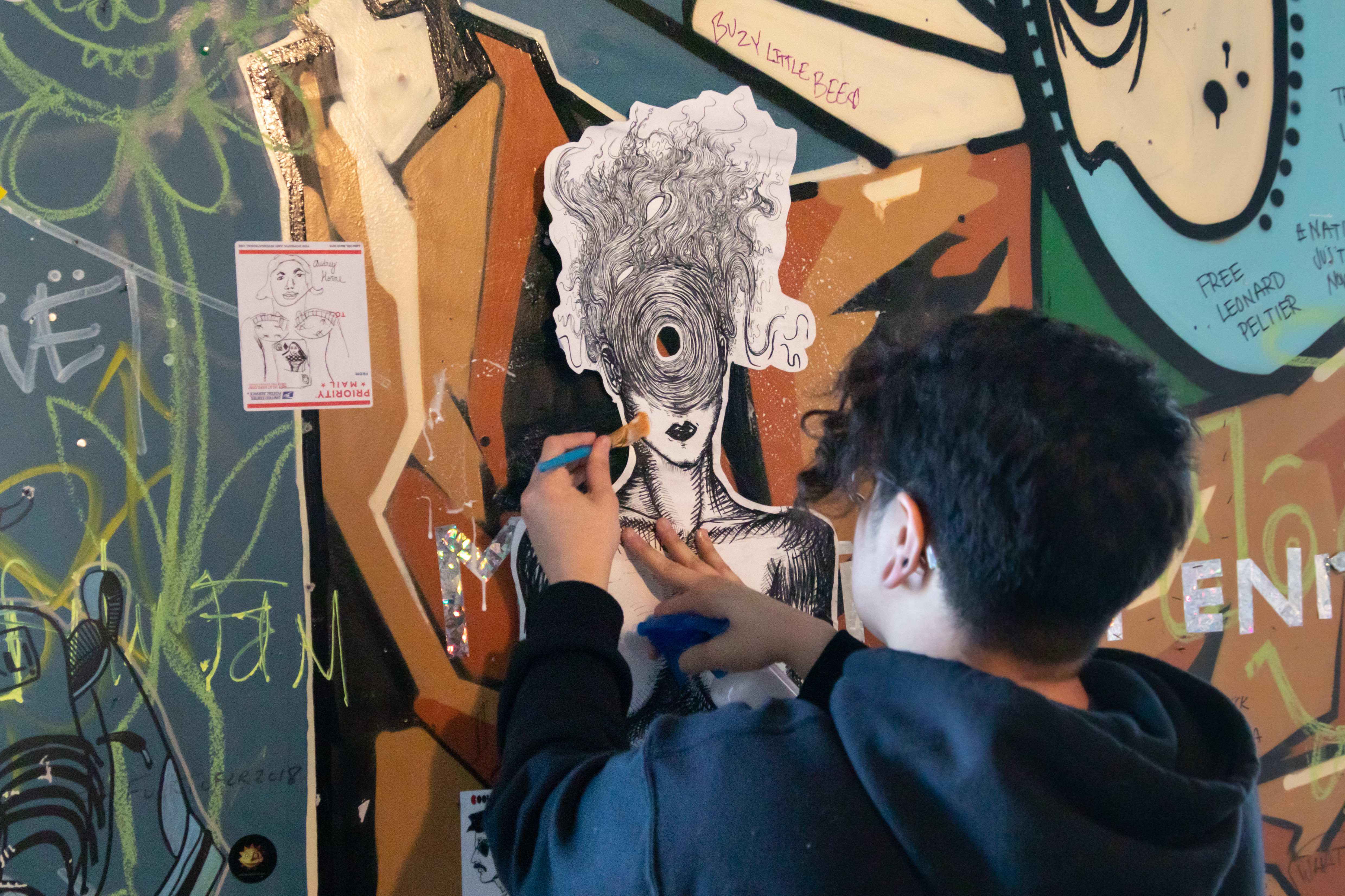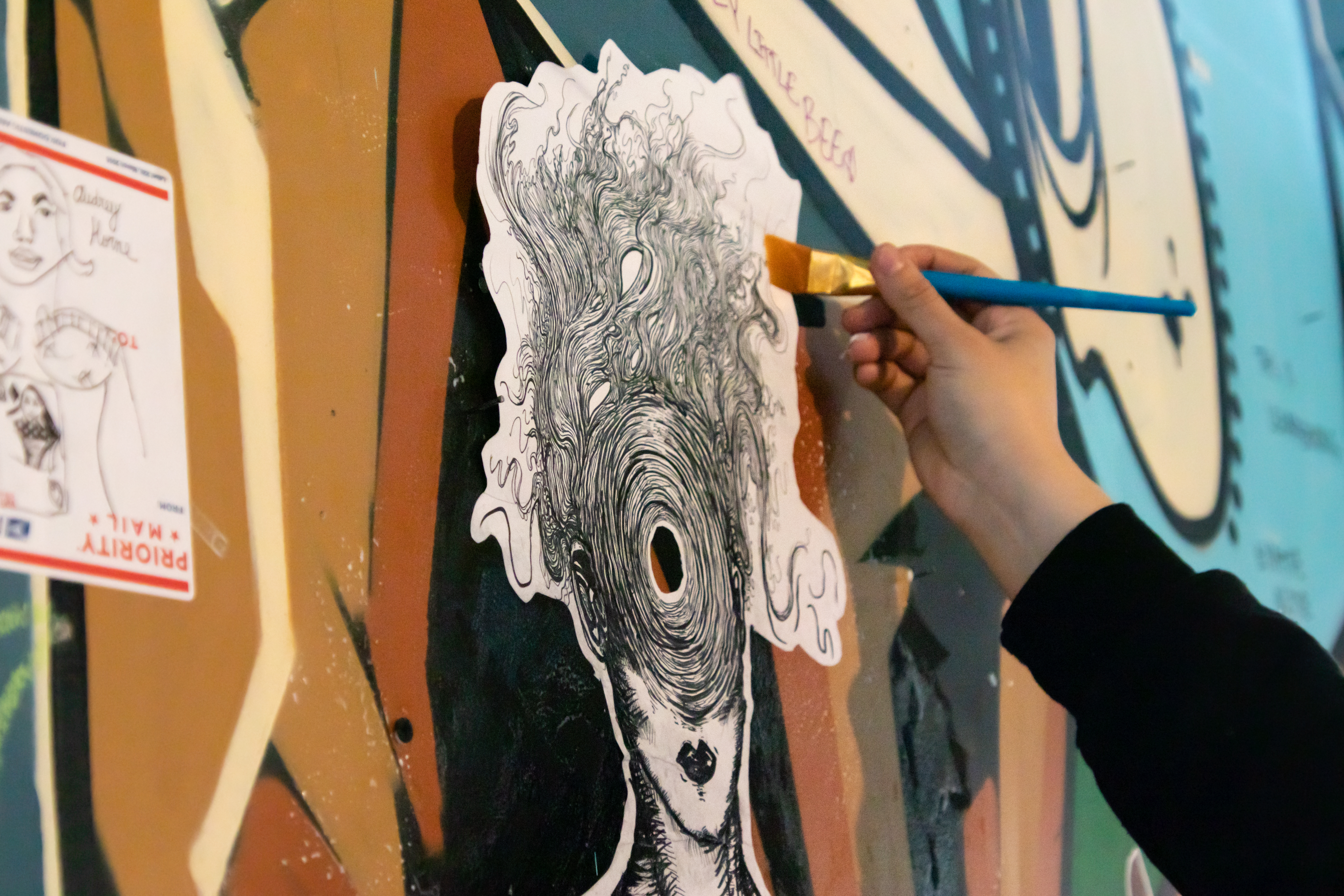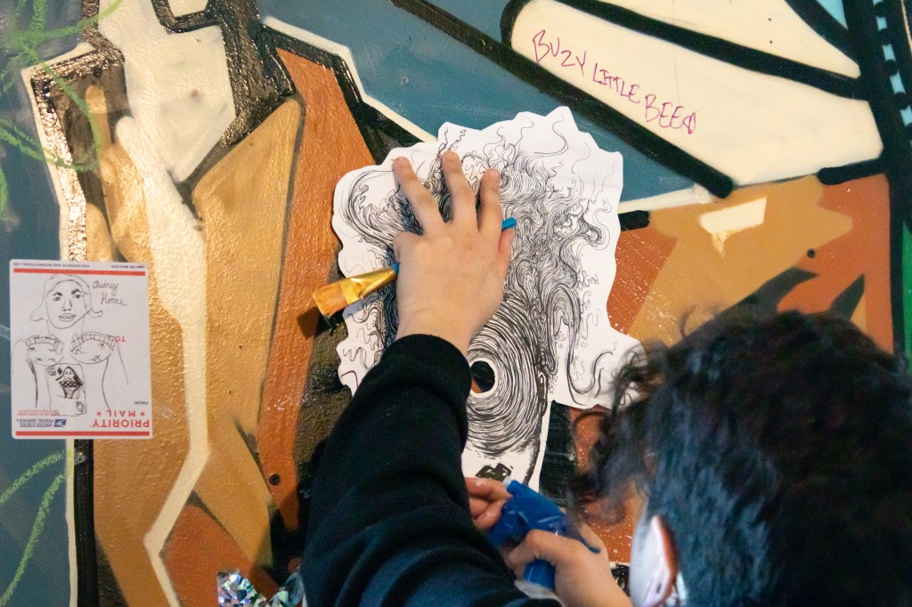 Void Skulls: [It wasn’t] when I first started doing art, cause I did art as a kid. I was aware of graffiti and writers and stickers but I wasn’t involved in it. I was just drawing. Four years ago, my friend introduced me to sticker art, and that’s how I met As Above So Below—now he’s my partner. I didn’t expect to meet him and get to know him, but he got me more involved in actually making stickers. I didn’t know anything about it! I’d never been here [at Tattooed Mom] before… I think my first time here was around Characters Welcome. I don’t think I was 21, so I couldn’t make it to the night show. That’s where it was poppin’ off!
