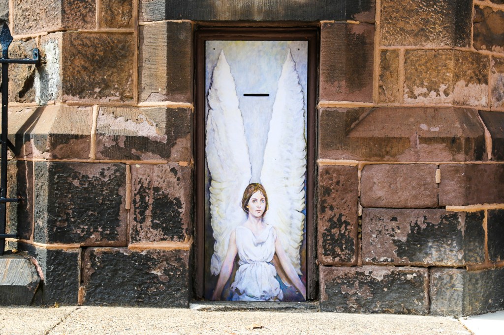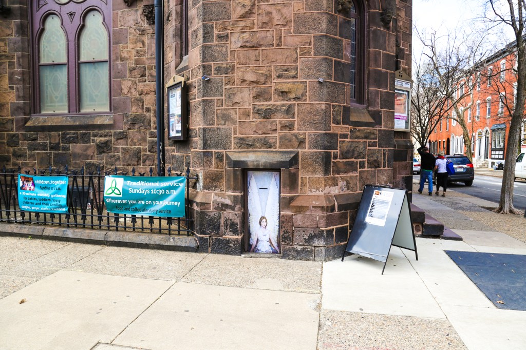 Titled Angel, the mini-mural was created by artist and former appellate attorney Tom Lincoln and is located on Trinity Memorial Church at 22nd and Spruce streets in Rittenhouse Square upon the invite of its rector, Rev. Donna Maree.