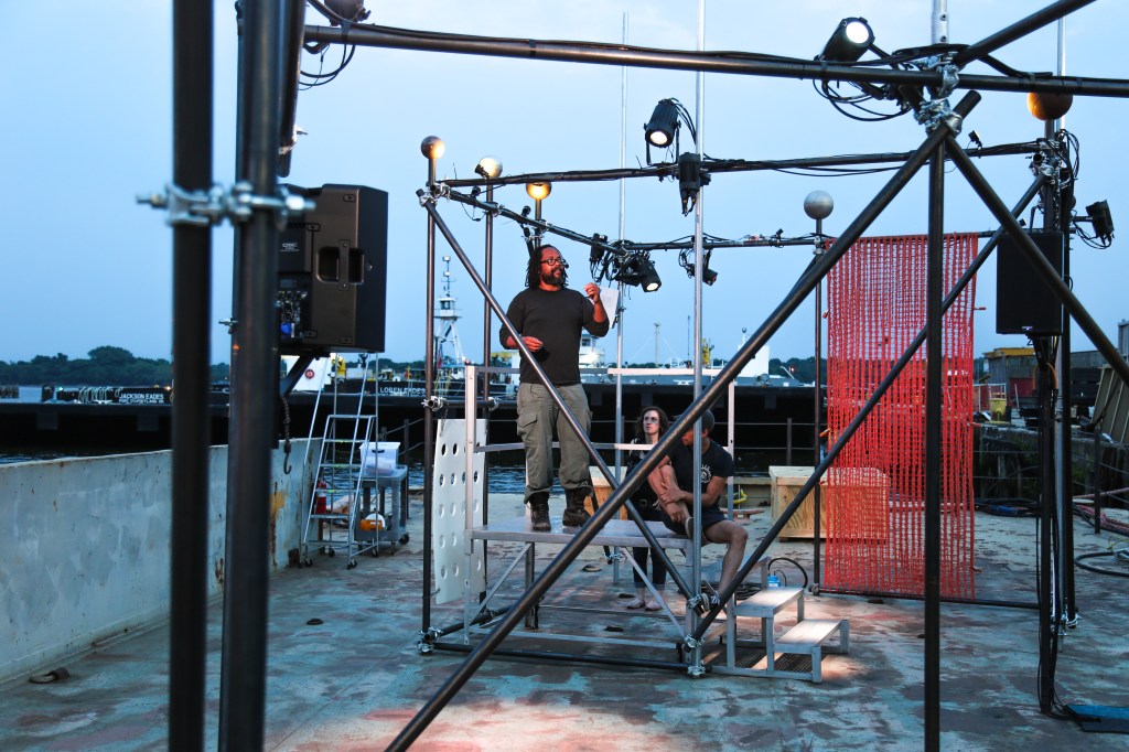 Creating a two-night-only floating visual and performance art event on the Delaware River, RiverRoad is a collaboration between artists Carolyn Healy and John JH Phillips with performer James Osby Gwathney Jr. A multimedia work based on Walt Whitman’s Poem of The Road, the piece takes place on a large industrial barge on the Delaware River and features video, sculpture, lighting, and electronic sound in an environment in which James performs the entire text of Whitman’s poem!