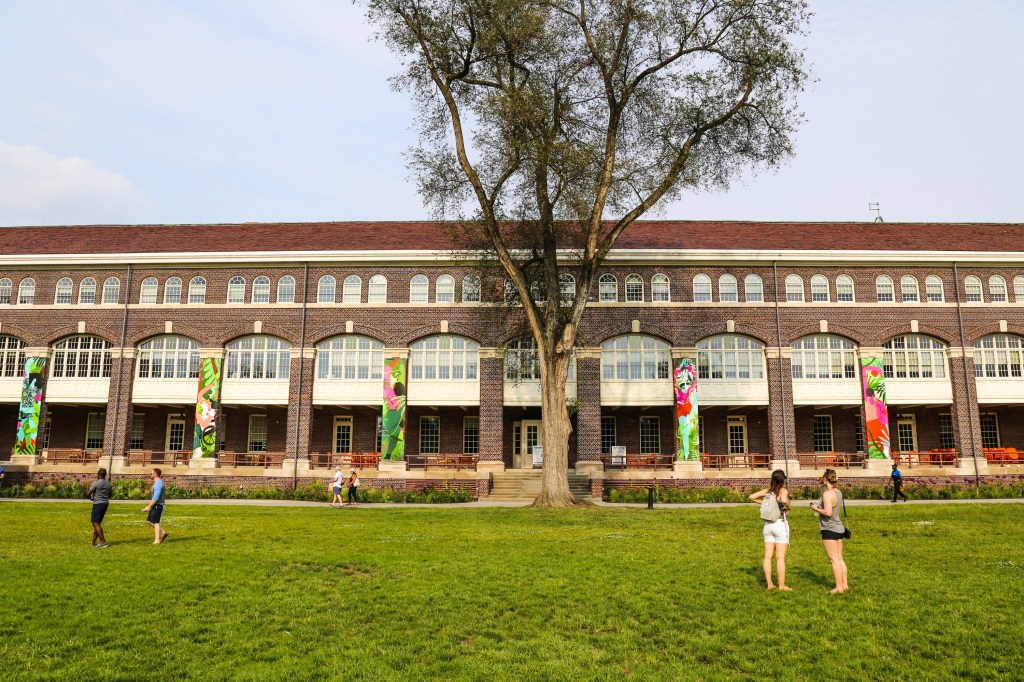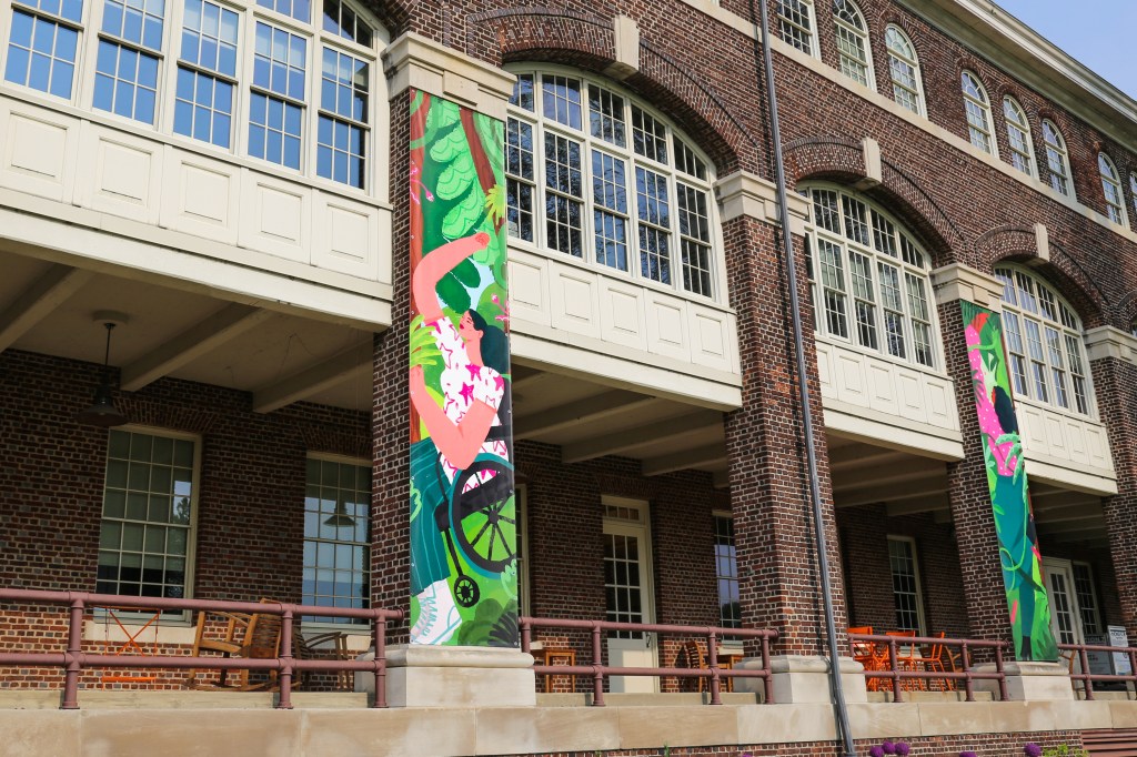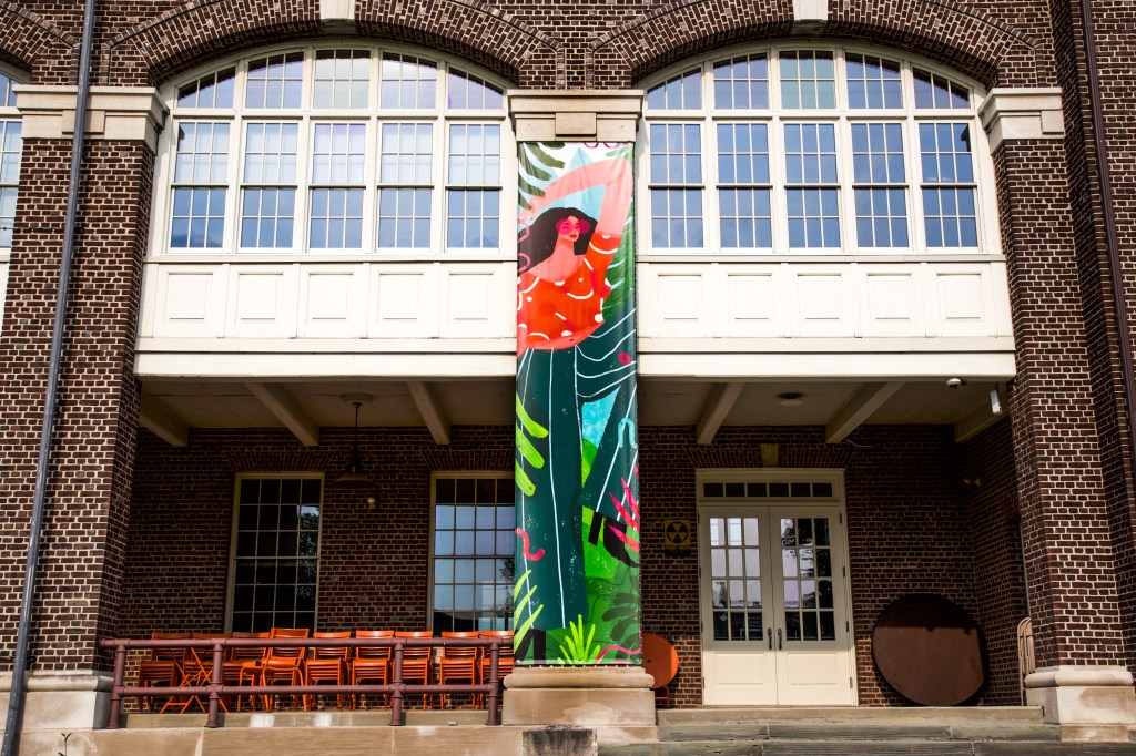 Just about four weeks ago, artist Loveis Wise dropped six large mural banners from the Navy Yard’s Building 101, a former marine barracks located at 4747 South Broad Street. Together the series celebrates the human connection with nature, each 19-foot banner featuring an individual joyfully immersed in a different type of forested area! The temporary project was made possible by Mural Arts Philadelphia with PIDC and curator Ryan Strand Greenberg, and will likely stay up for a year weather permitting.