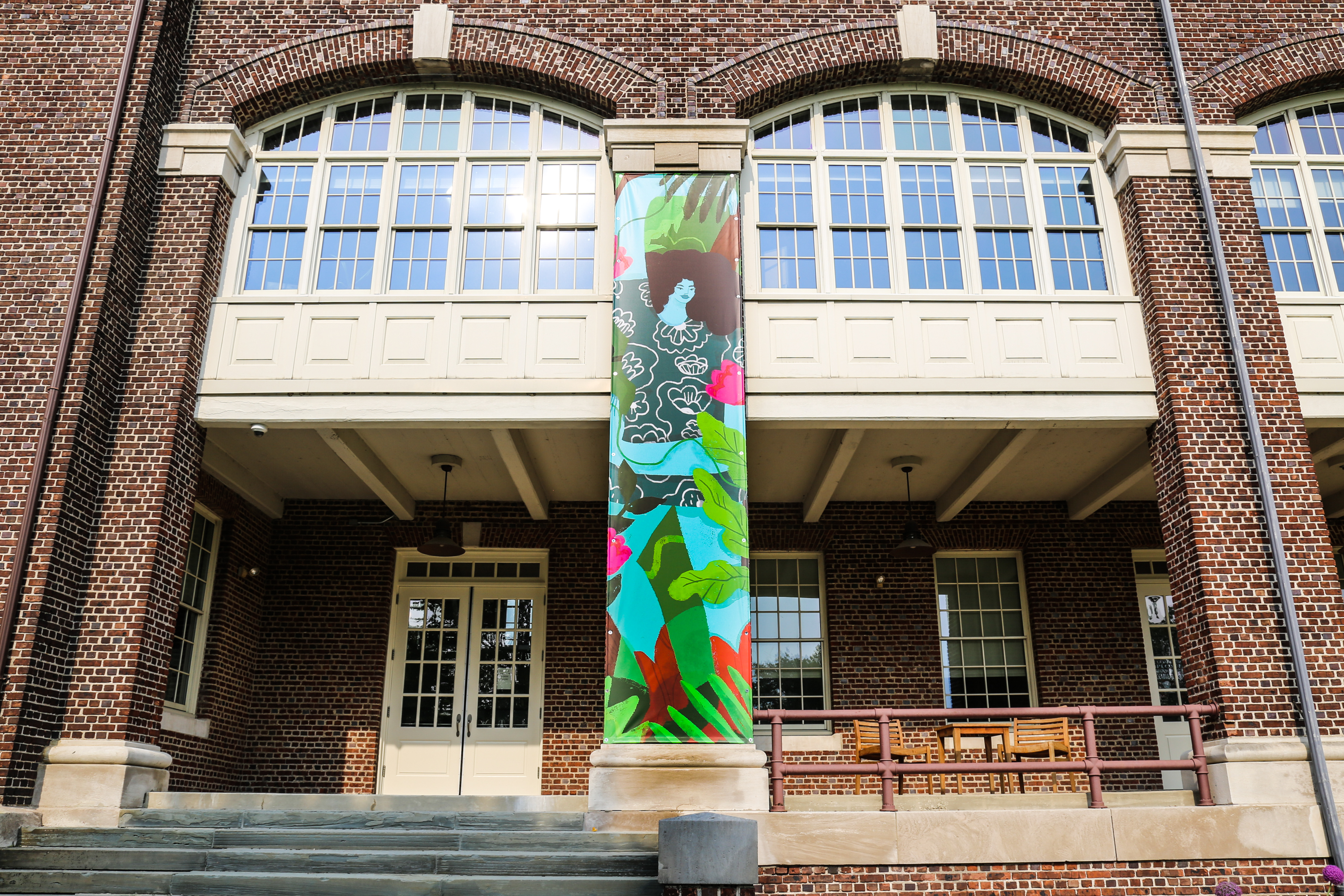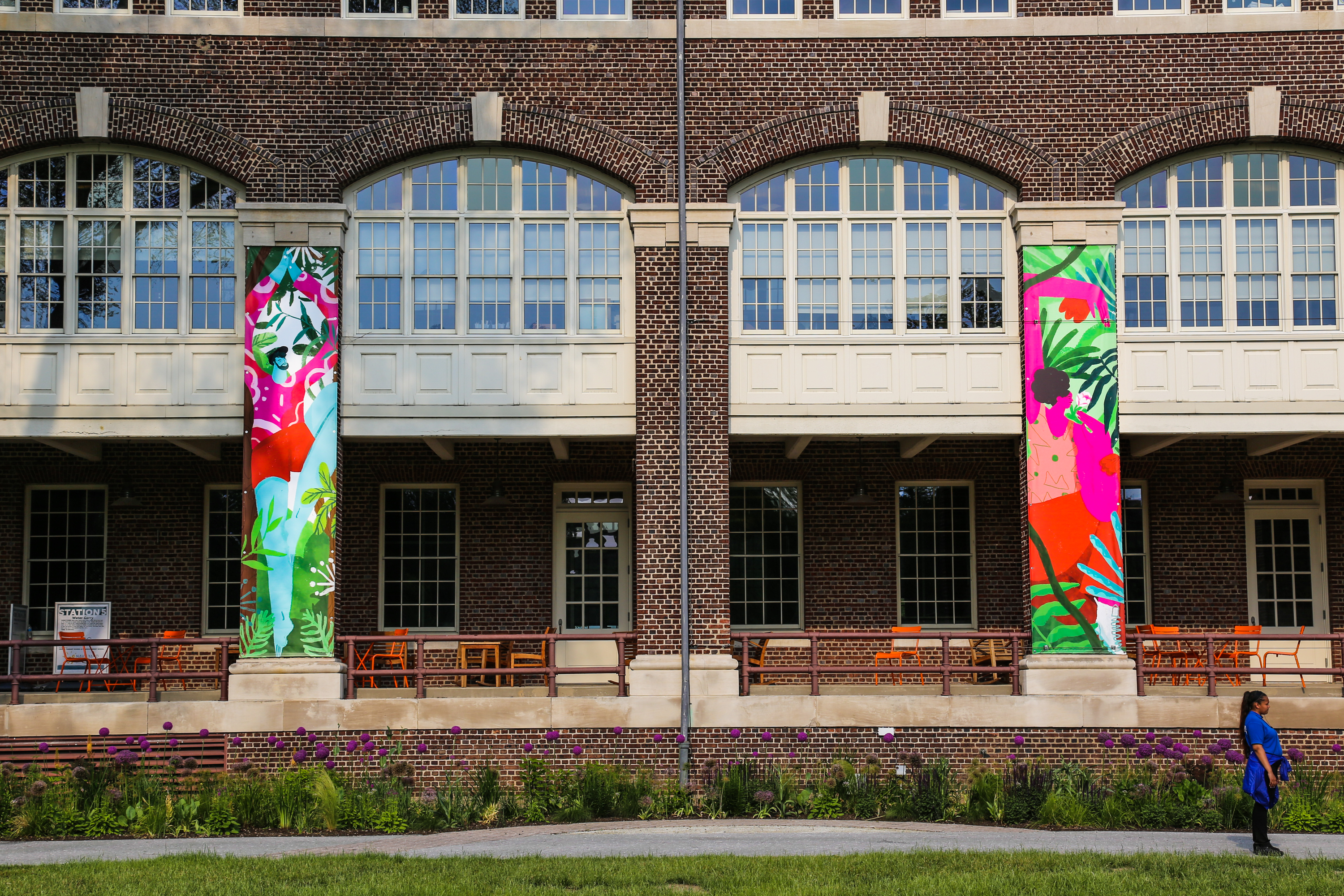 Just about four weeks ago, artist Loveis Wise dropped six large mural banners from the Navy Yard’s Building 101, a former marine barracks located at 4747 South Broad Street. Together the series celebrates the human connection with nature, each 19-foot banner featuring an individual joyfully immersed in a different type of forested area! The temporary project was made possible by Mural Arts Philadelphia with PIDC and curator Ryan Strand Greenberg, and will likely stay up for a year weather permitting.