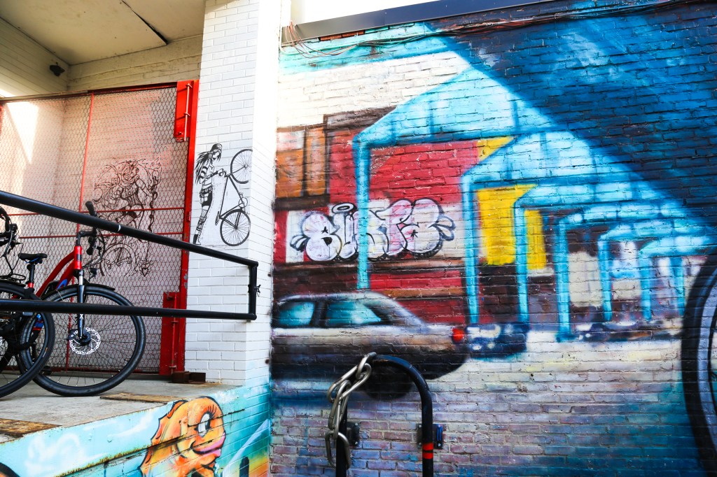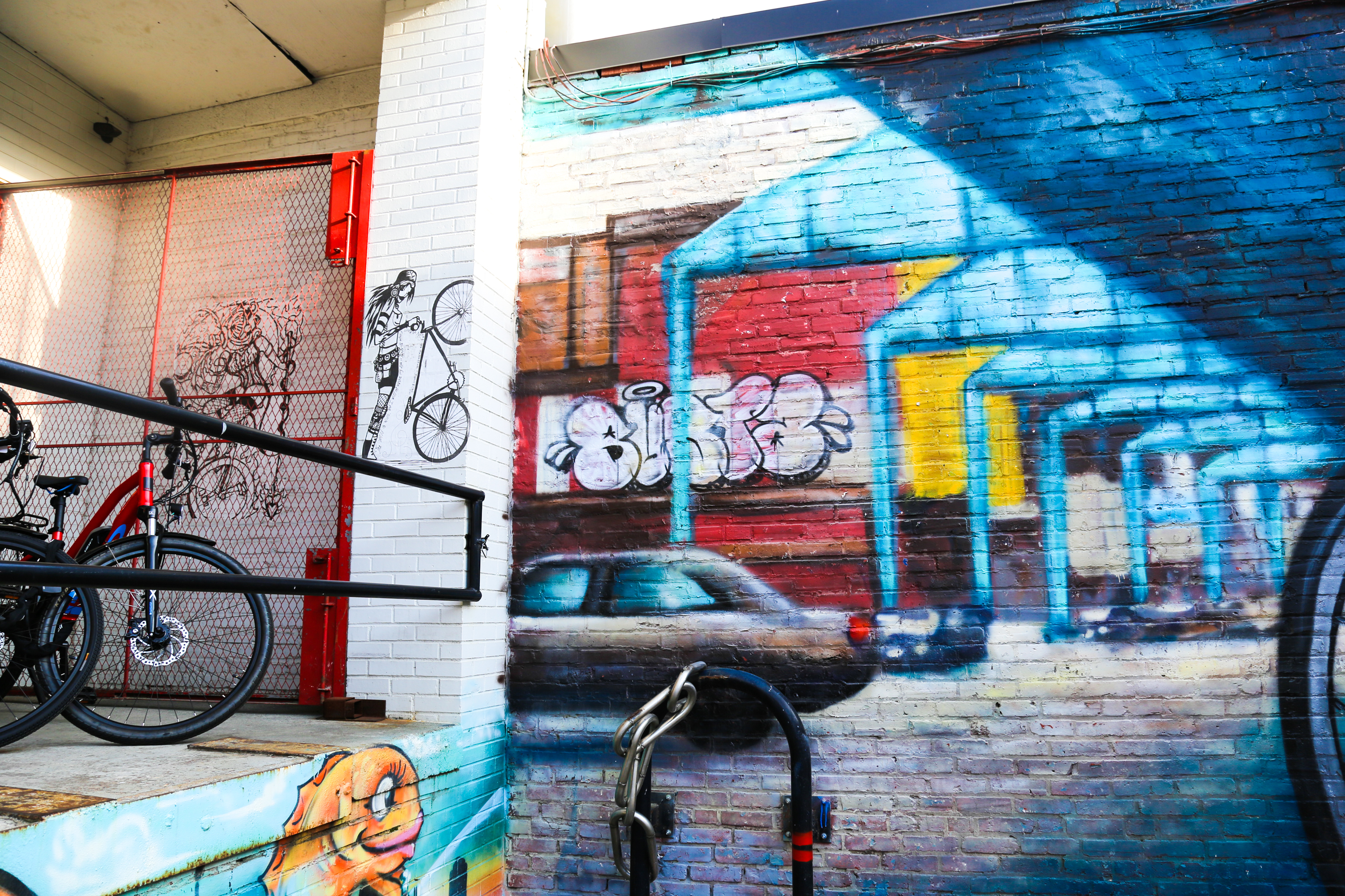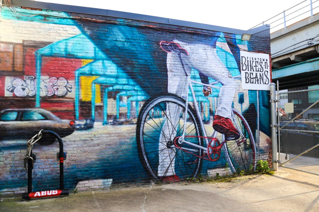 I am in LOVE with this newer mural (completed in early March of this year) from Philly-based graffiti artist and muralist Busta, located at Fishtown Bikes-n-Beans on Front street between Thompson and Master streets!