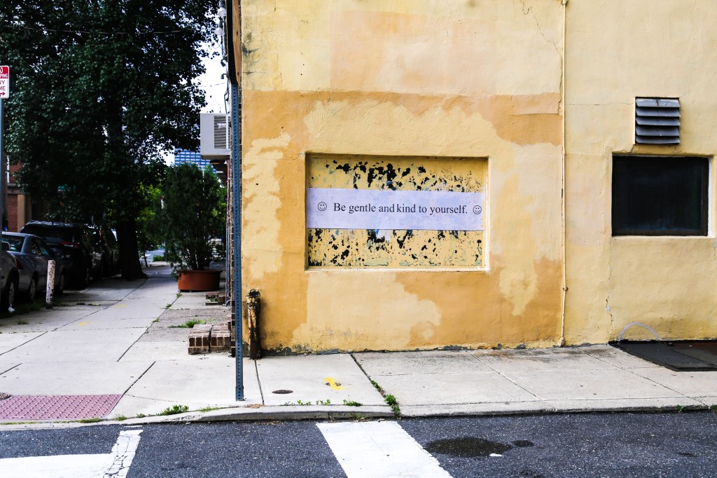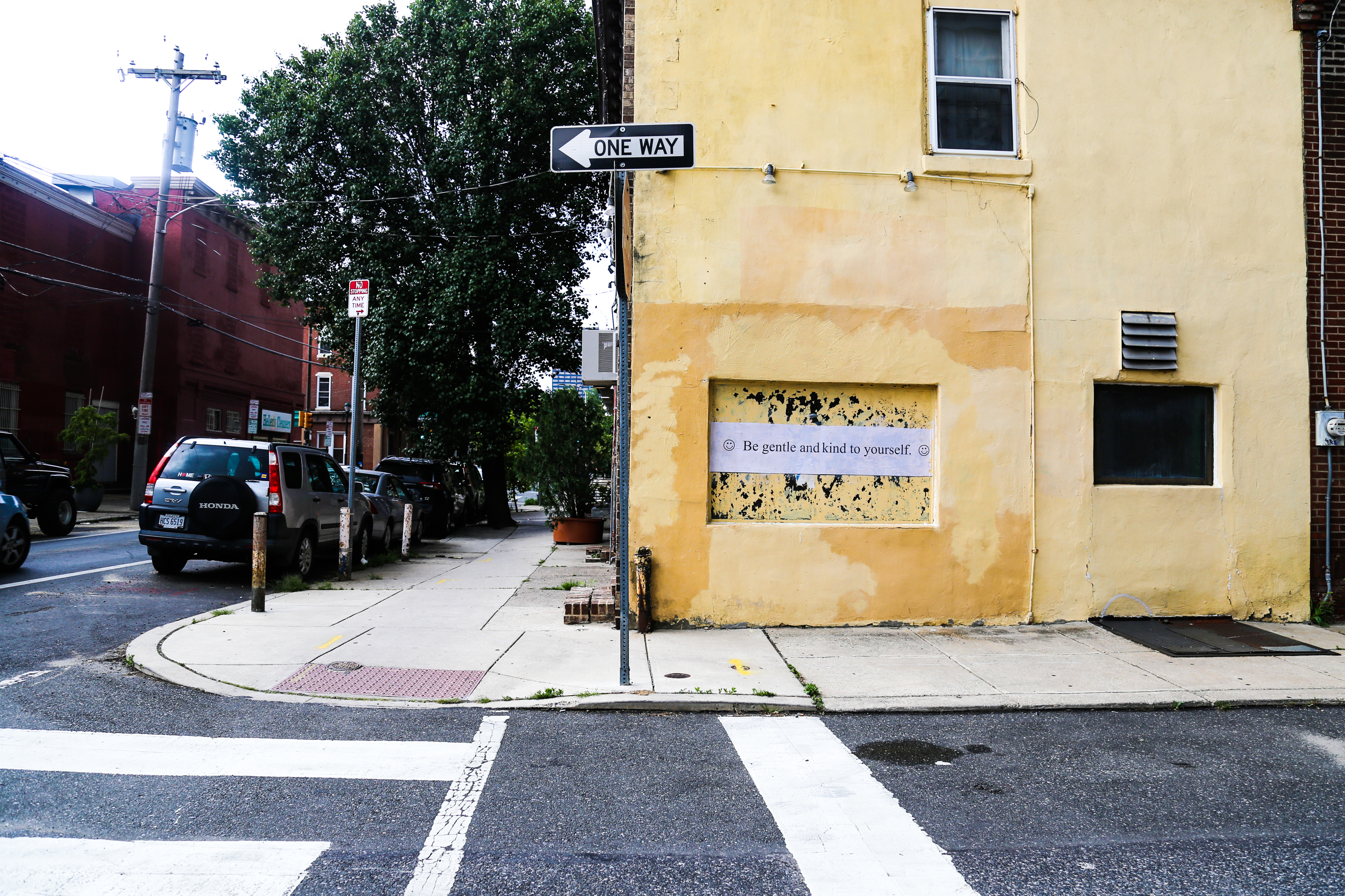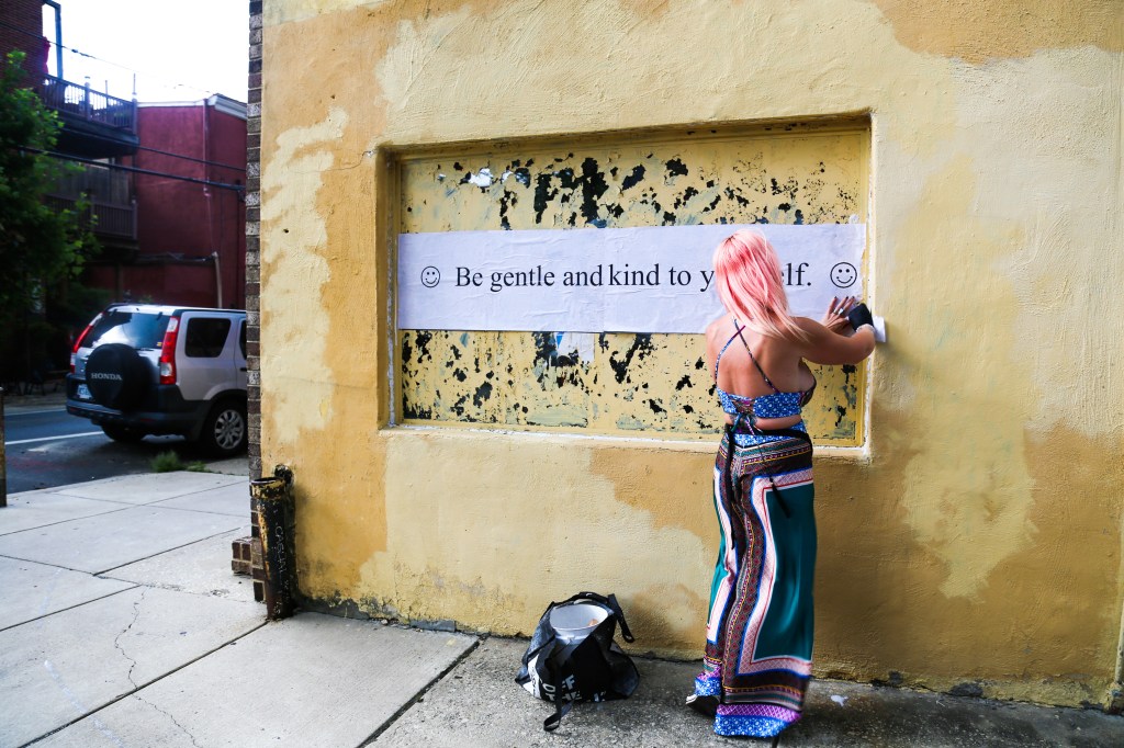 The first (photographed above) is located on Market street between 9th and 10th streets and reads, “Who Lead The World: Girls!” The second (photographed below) is located at 20th and Kater streets reads, “Be Gentle And Kind to Yourself.”