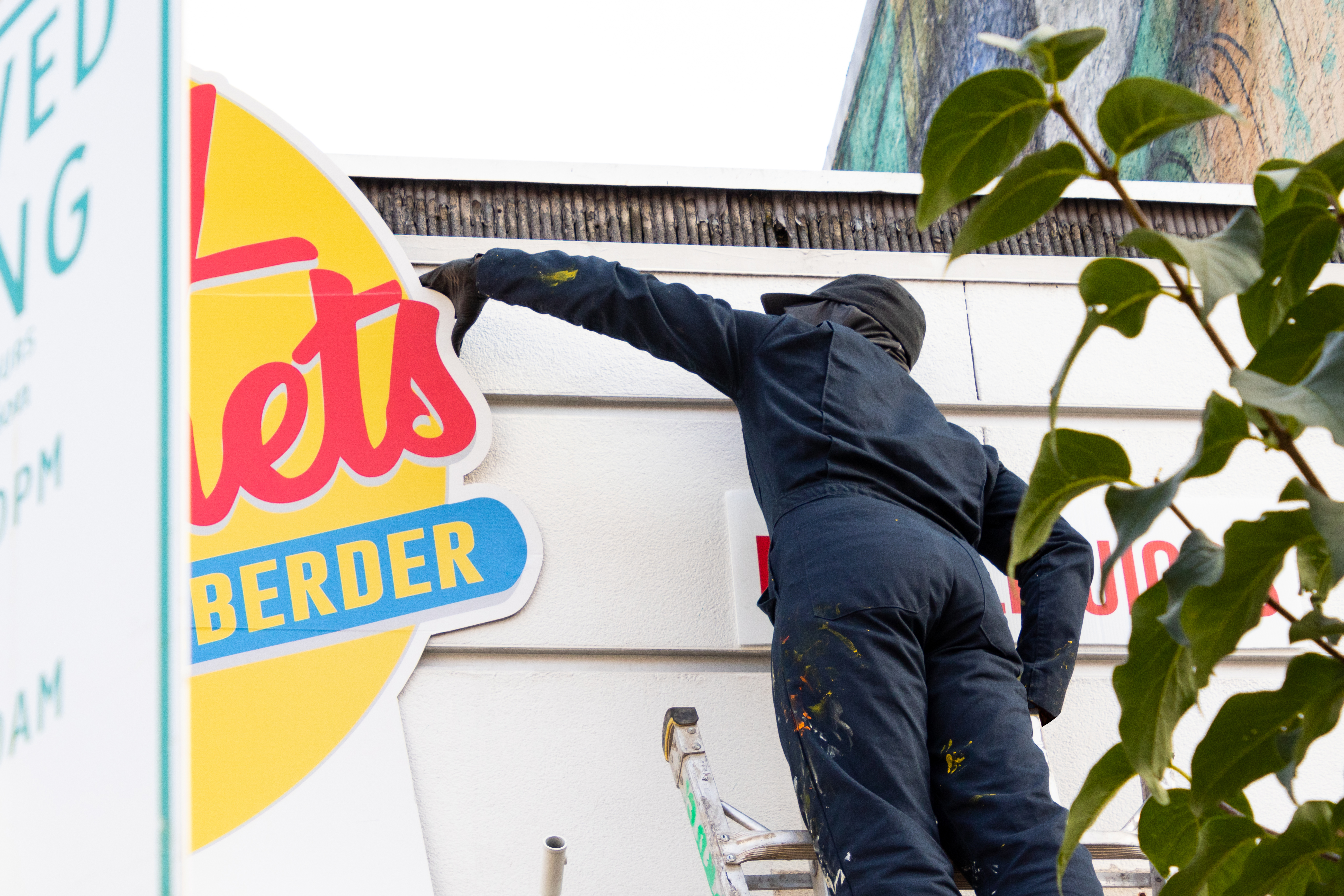 Alas, almost as quickly as this installation went up on Friday, the building’s owner took it down. But that’s the nature of street art. So while you can’t see this piece now for yourself in person, you can see the rest of Kid Hazo’s jawn themed restaurant spoofs at his new Signs art exhibition at Paradigm Gallery + Studio that’s opening Friday, July 26th!