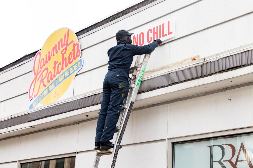 New installation this weekend from Philly’s own Kid Hazo replacing the old Johnny Rockets signage (that was in business at 5th and South streets for 20 years, closed Jan 2018) with the new appropriately Philly themed “Jawnny Ratchets – The Original Hamberder”! Instead of Chili and Malts we got “No Chill” and serving “Malt Liquors”… Opening this Summer 2019.