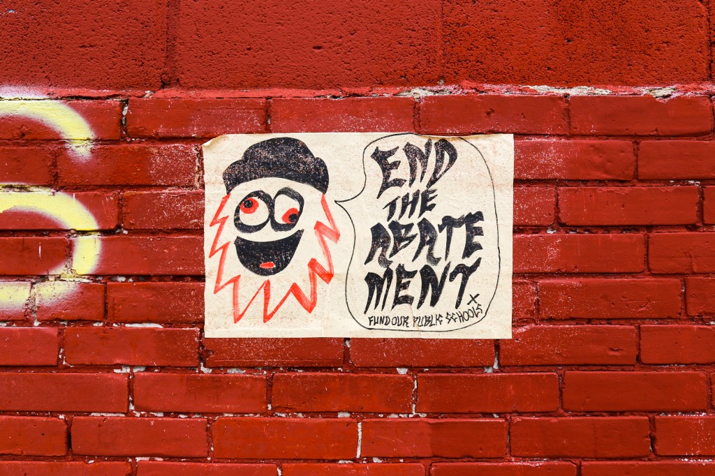 Over the last week or so, at least two street art installations popped up in two Philly neighborhoods calling for the end of Philadelphia’s 10-year Tax Abatement. The first, photographed above, a sign installation on Frankford avenue at Belgrade street in Fishtown. The second, photographed below, a wheatpaste at 22nd street and Washington avenue on the border of Graduate Hospital and Grays Ferry. Both read “End the Abatement” in the same font, so it’s safe to assume these were created by the same artist. The wheatpase adds the line of text: “Fund Our Public Schools.”