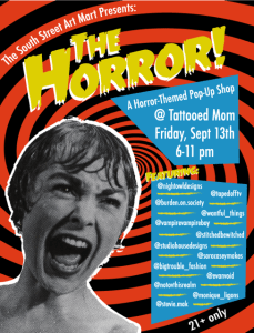It’s the most spooky time of year—Friday the 13th! Celebrate the occasion with an art show, pop-up, and an evening full of HORROR, brought to you by the artists behind the South Street Art Mart!
