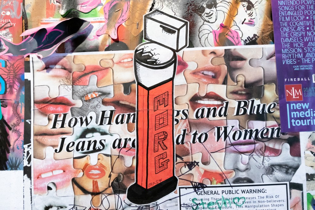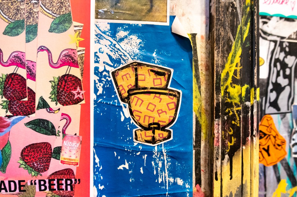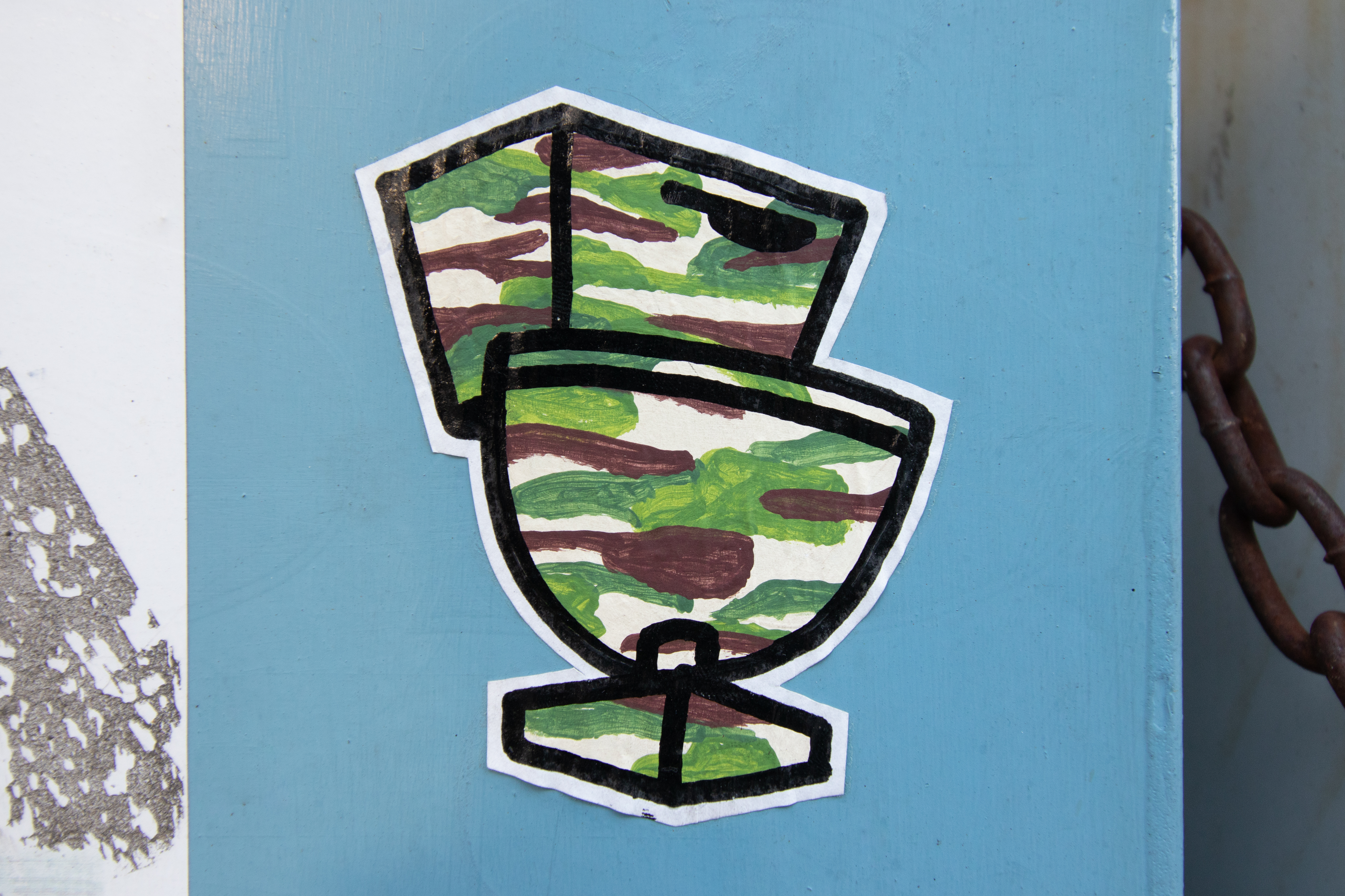 The work I was making [in college]—I’m a huge fan of minimalism and sort of quieter works that wouldn’t live as well on the street. At the same time, I always come back to stickers as something that’s really comfortable. And I think the lack of pretension that exists within it makes it a really universal medium. Anyone can do it—and you’ll be judged, fairly—but I don’t have to think too much about what it is. I don’t have to think about my work as it relates to everything else. Although obviously there’s lineage and there’s history, especially at this point. I mean, in 2006, when we were starting, “street art” wasn’t even really a word. People in my family would be like oh you’re doing graffiti, and I would be like no no no it’s street art, and no one had any sense of what that was. Banksy was still this anomaly. People were like [whispering] oh have you heard about this guy named Banksy? He had had like two headlines in the New York Times.