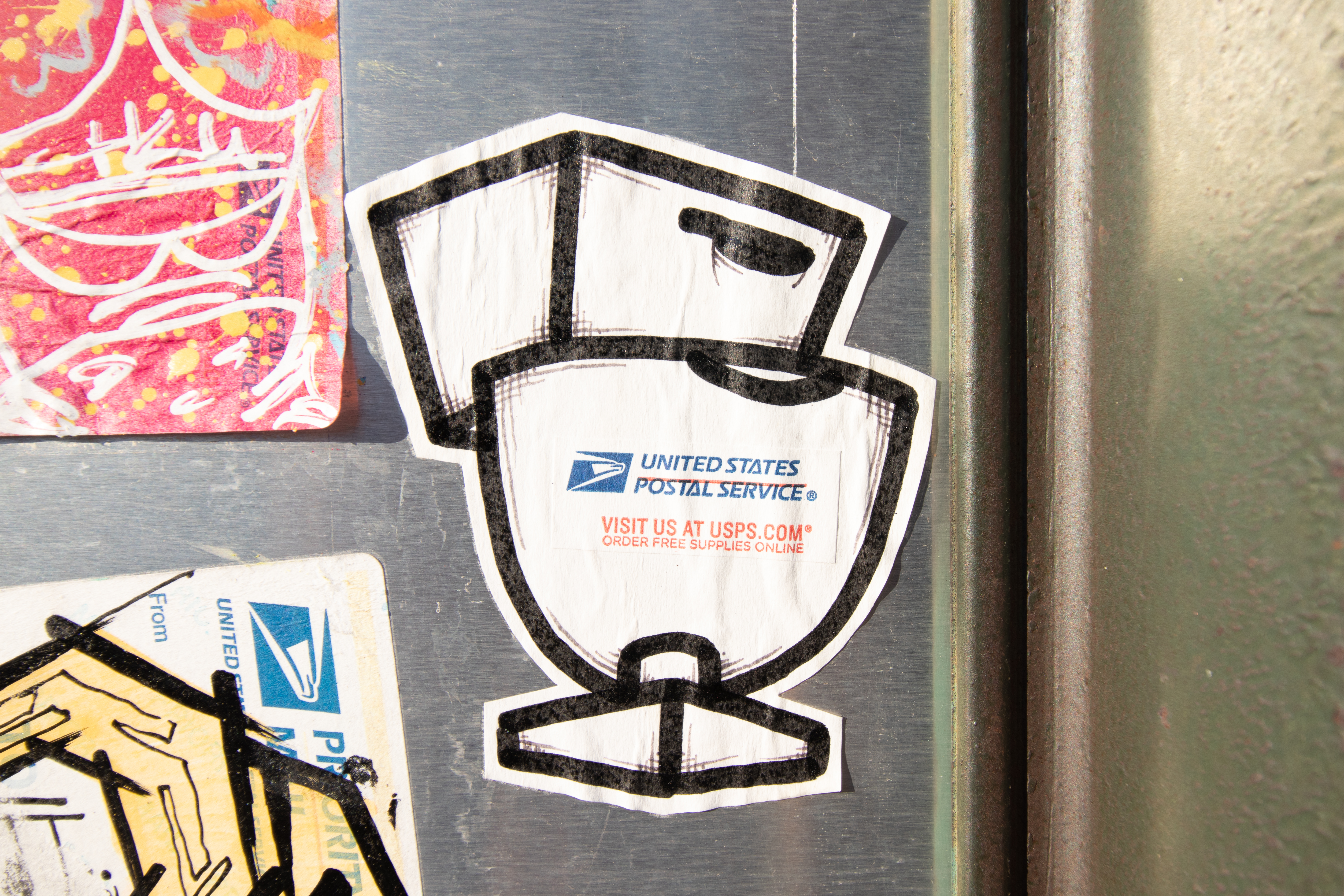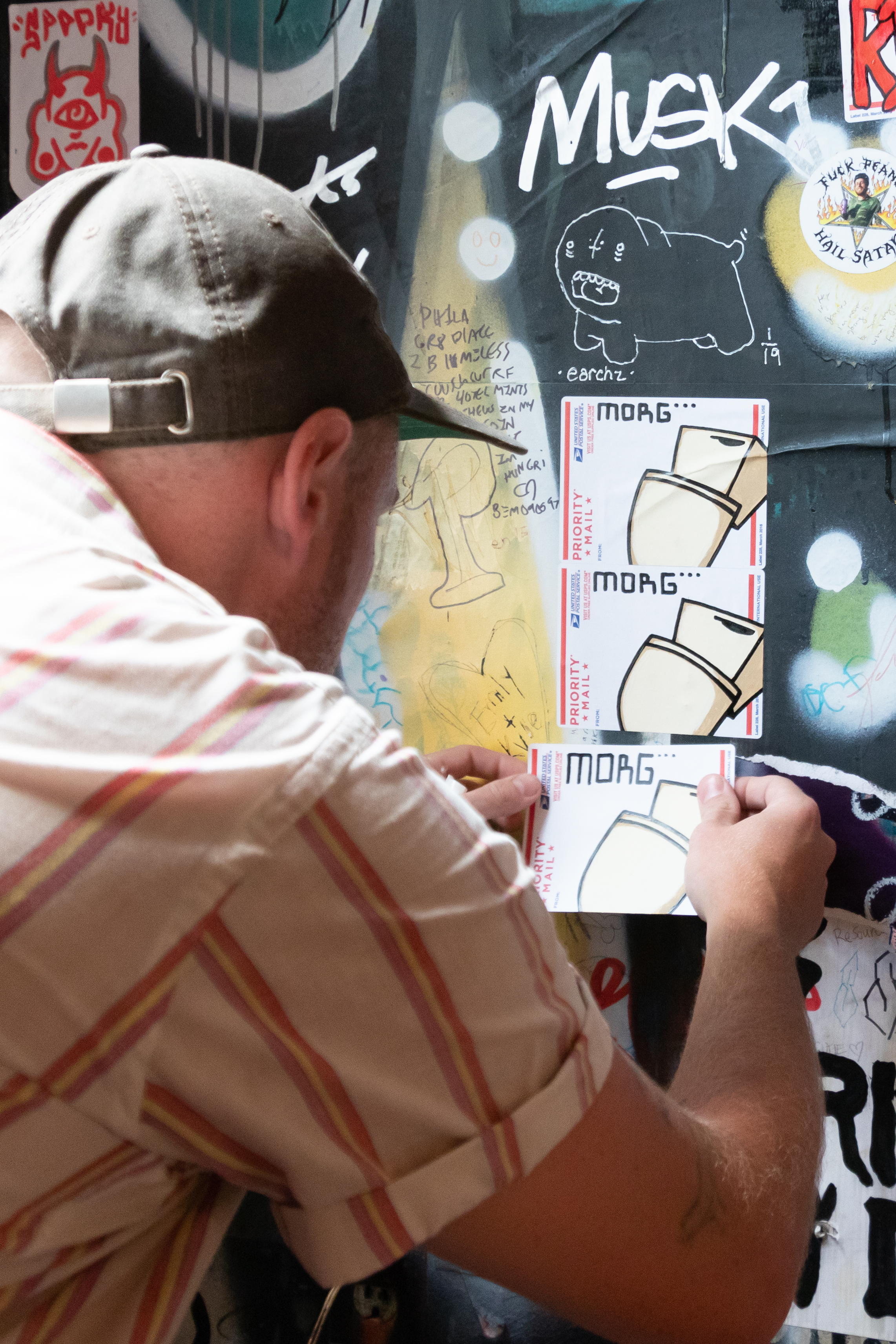 Yes, the guy who draws a cartoon toilet character on Priority Mail stickers actually has a very nuanced understanding of art in the public space. Beyond his sticky origins, Morg also dabbled in graffiti, did a high school research project on Philadelphia Mural Arts, and studied sculpture in college, leaving him with a robust understanding of how art is inextricably connected to its environment. And sticker art is what kicked it all off!