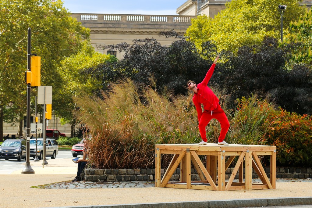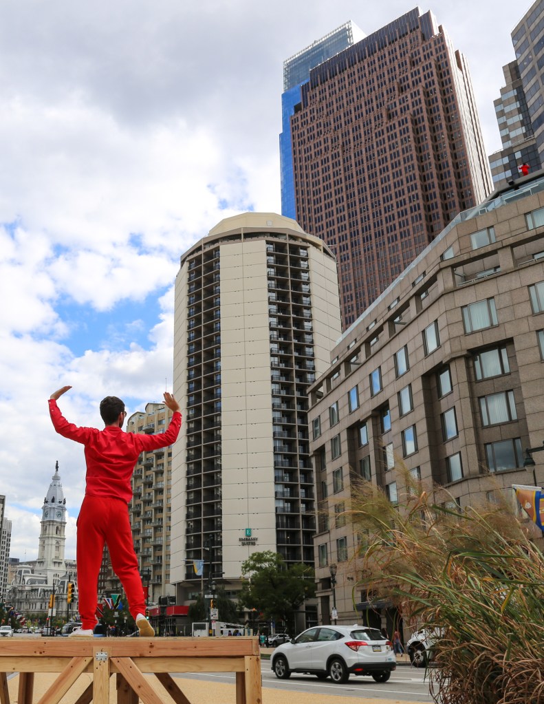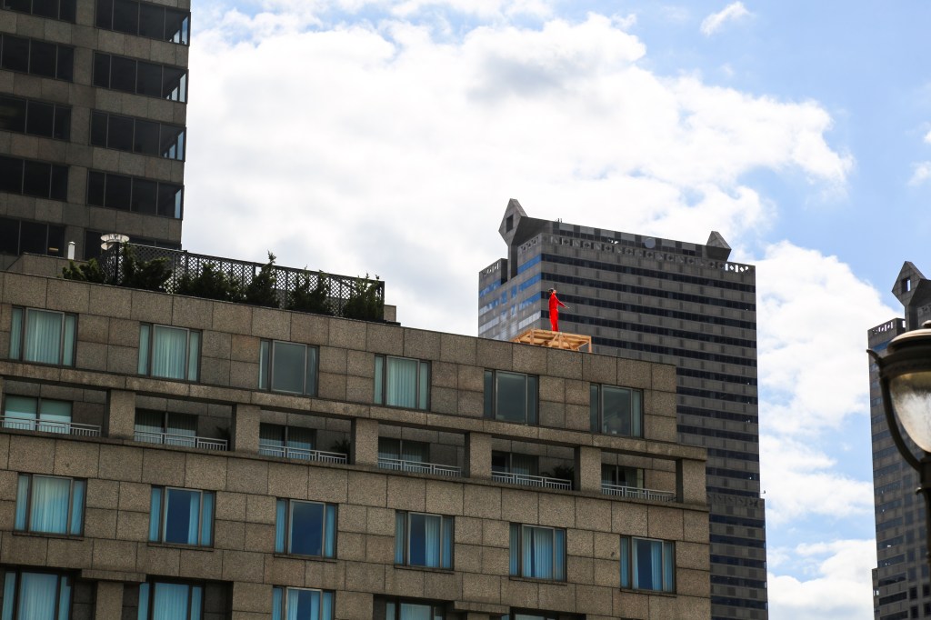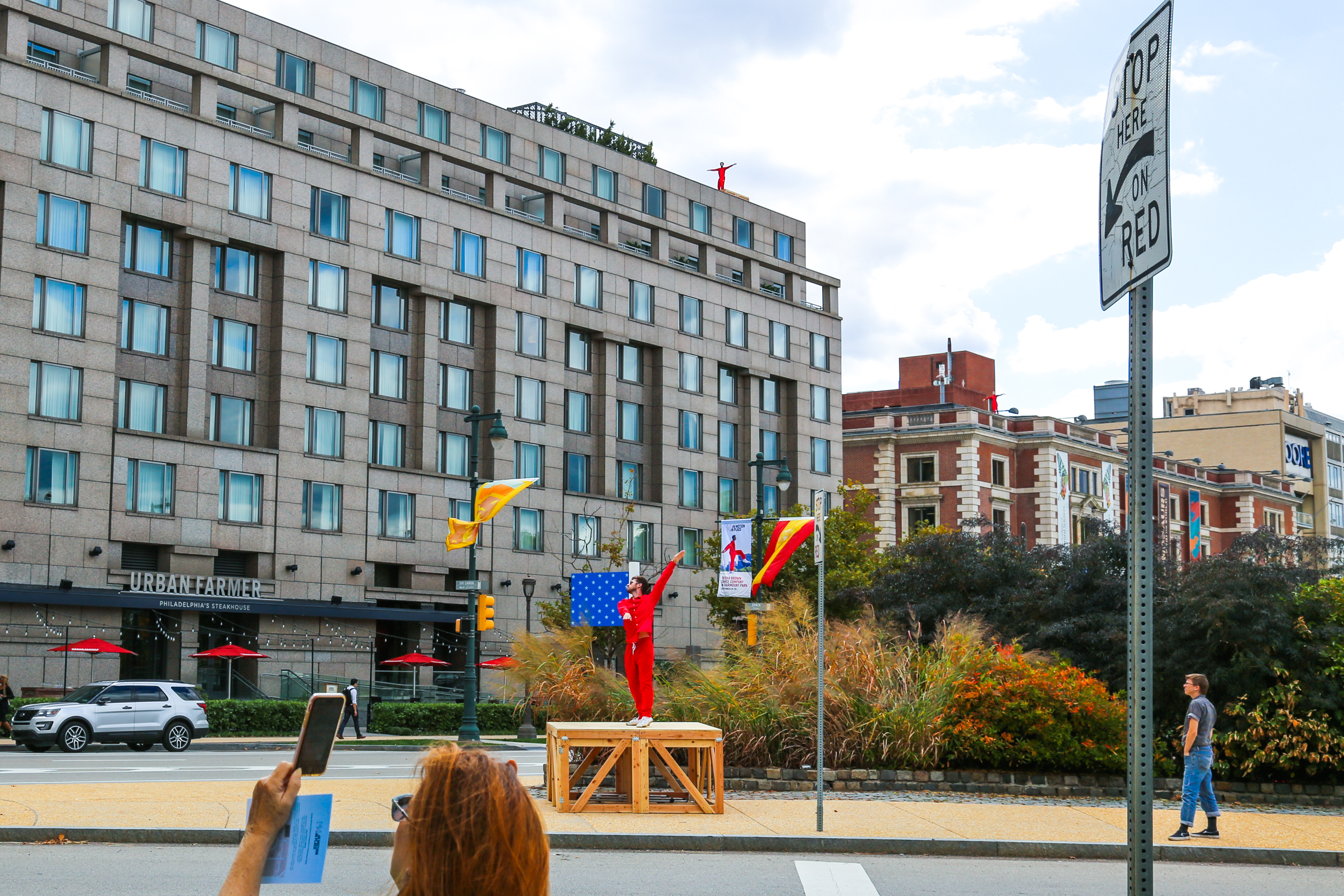 For a half-hour today, passersby of Logan Circle in Center City, Philadelphia saw a really unusual sight. A collection of about five people dressed in all red perched on the roofs of different tall buildings surrounding the circle with one on the ground in the center. Together, they all began moving, dancing in a silenced unison. At first, the action honestly reminded me of The Movements from that Nextflix’s show The OA. The experience only continued to increase in its sureness as more and more people on the street stopped in awe taking notice, pointing and trying to piece it all together.