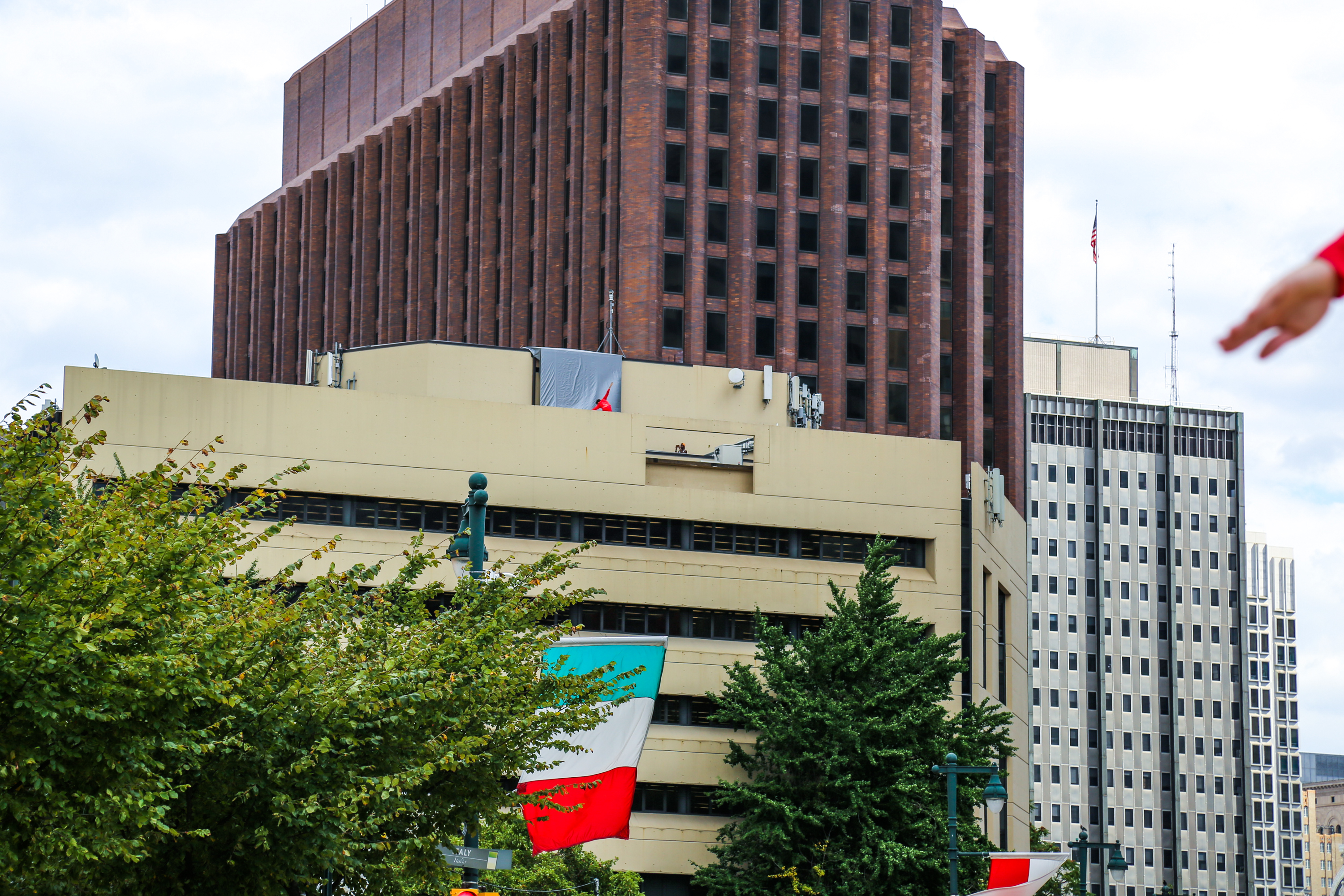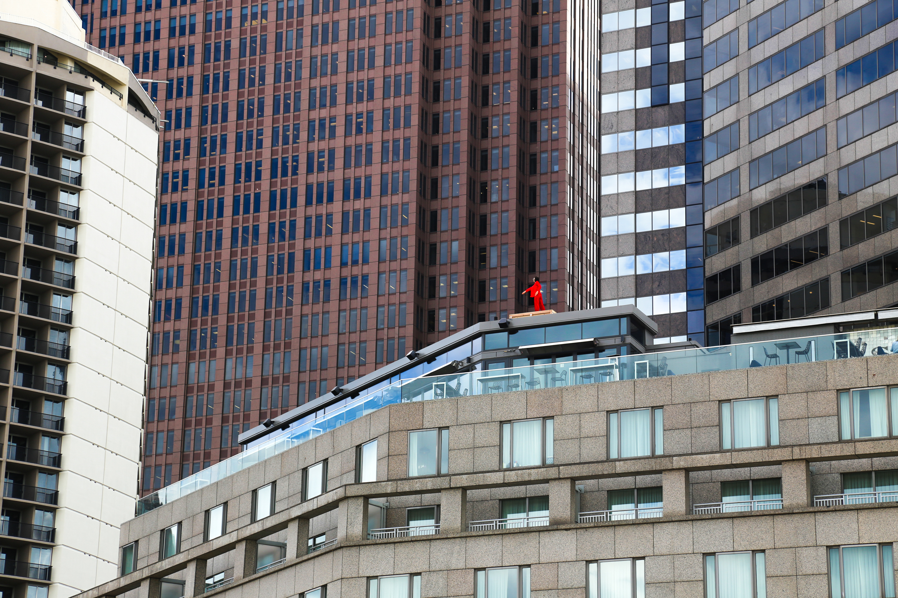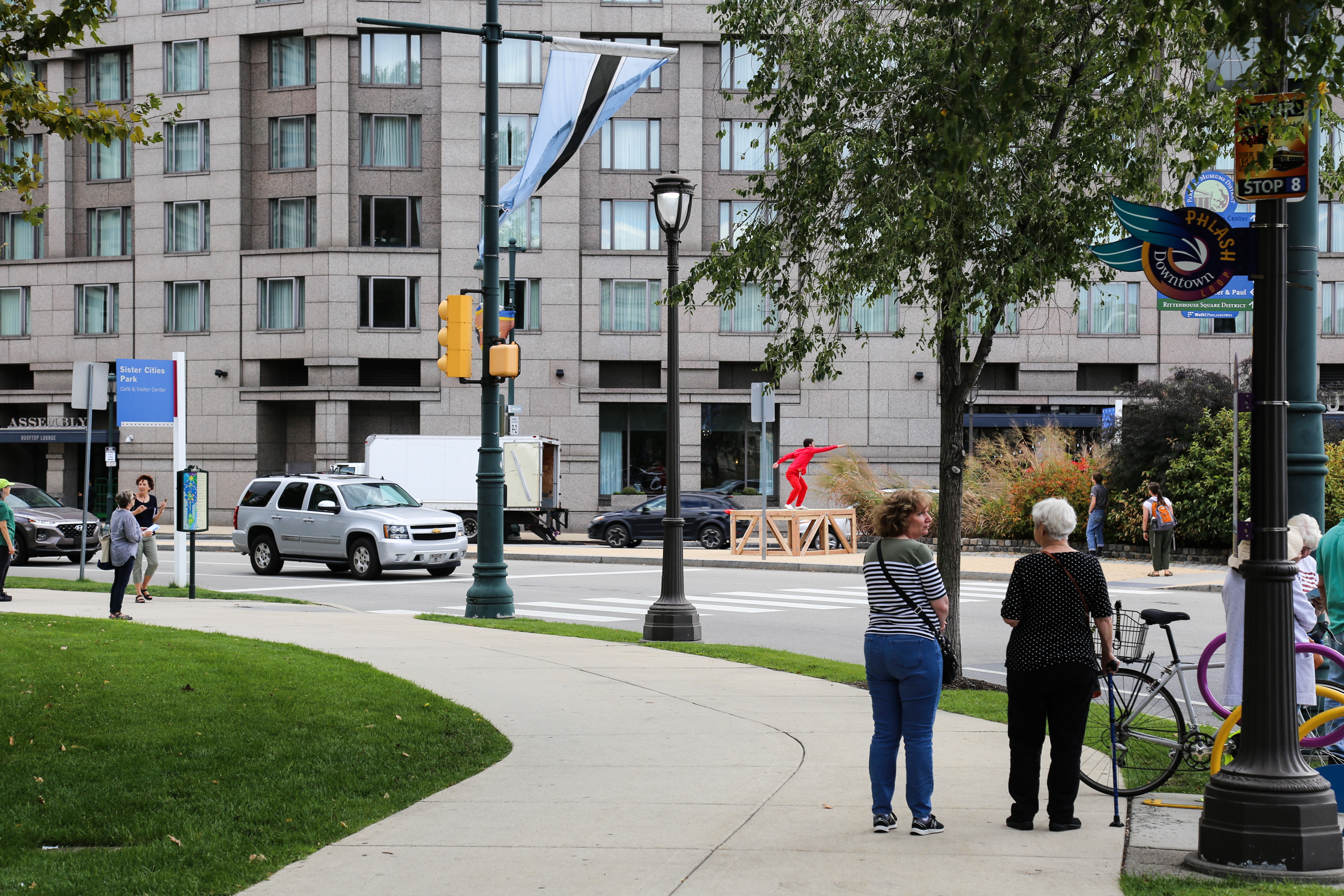 For a half-hour today, passersby of Logan Circle in Center City, Philadelphia saw a really unusual sight. A collection of about five people dressed in all red perched on the roofs of different tall buildings surrounding the circle with one on the ground in the center. Together, they all began moving, dancing in a silenced unison. At first, the action honestly reminded me of The Movements from that Nextflix’s show The OA. The experience only continued to increase in its sureness as more and more people on the street stopped in awe taking notice, pointing and trying to piece it all together.