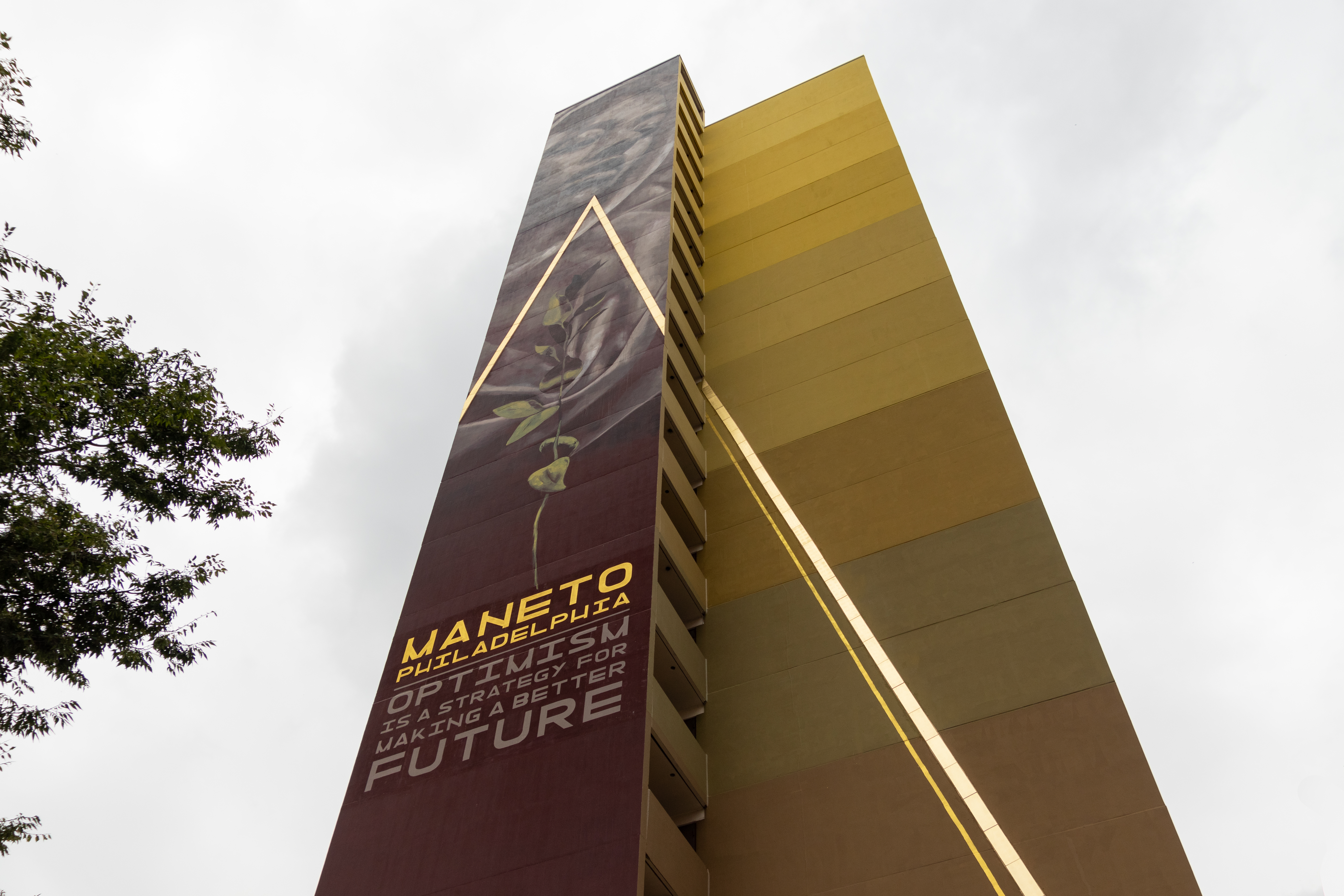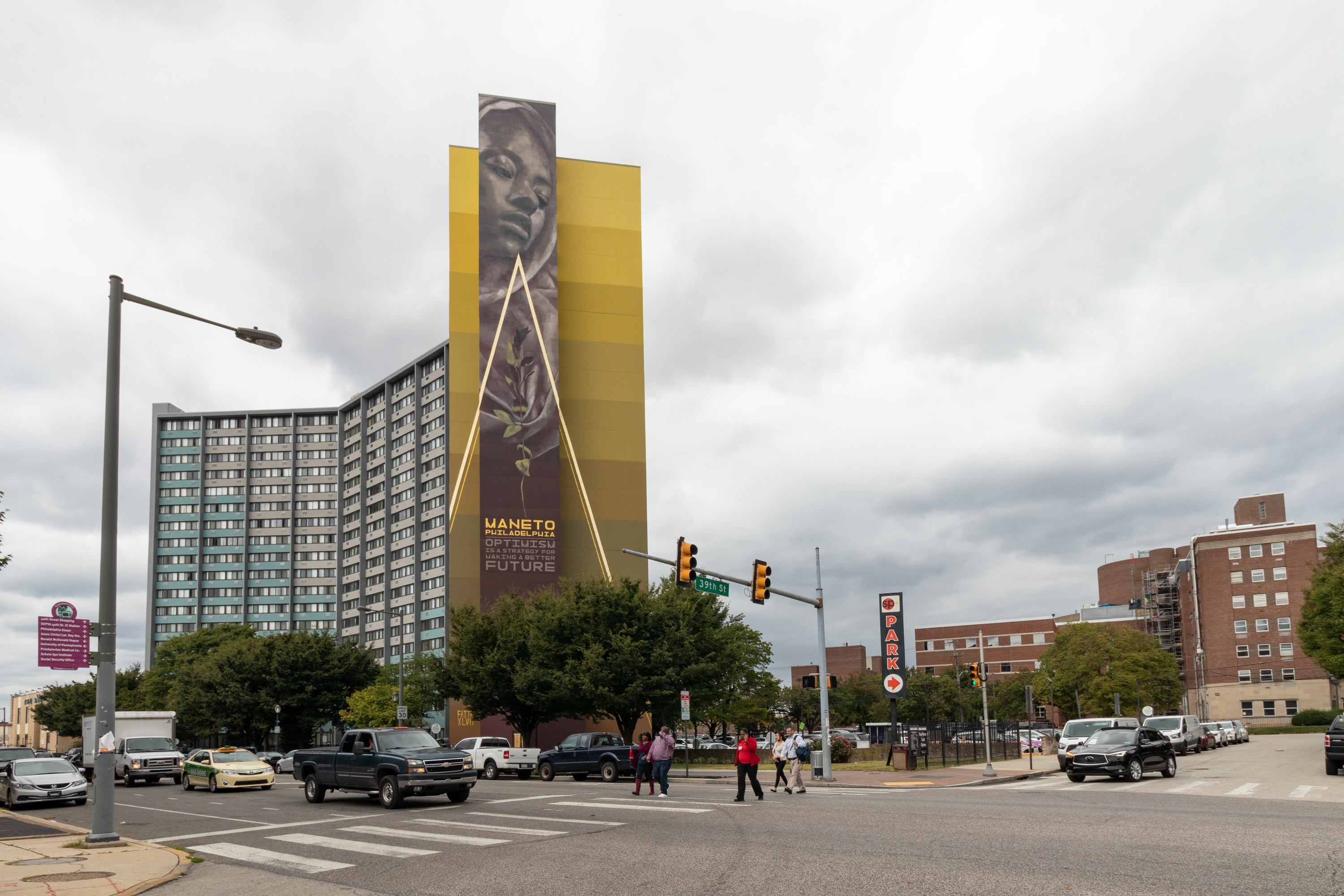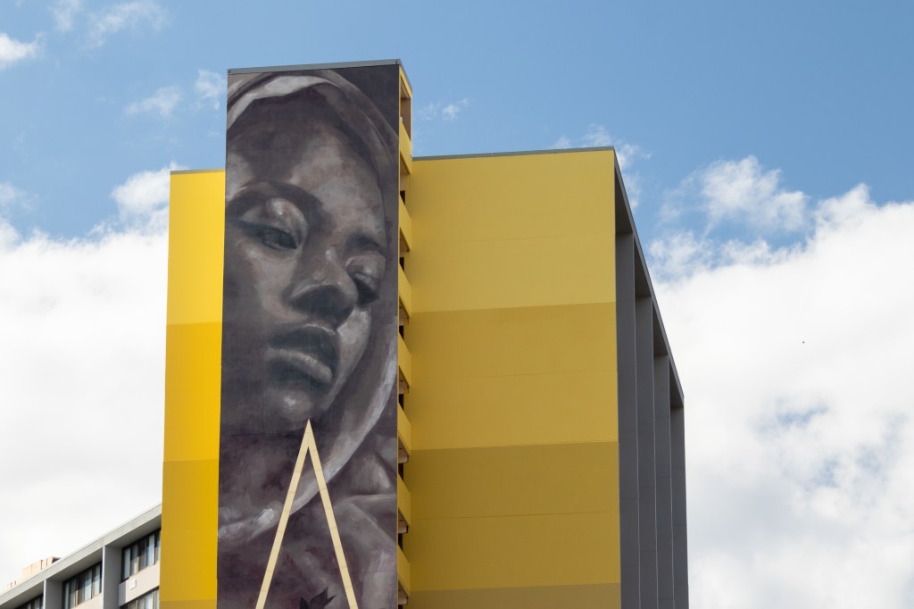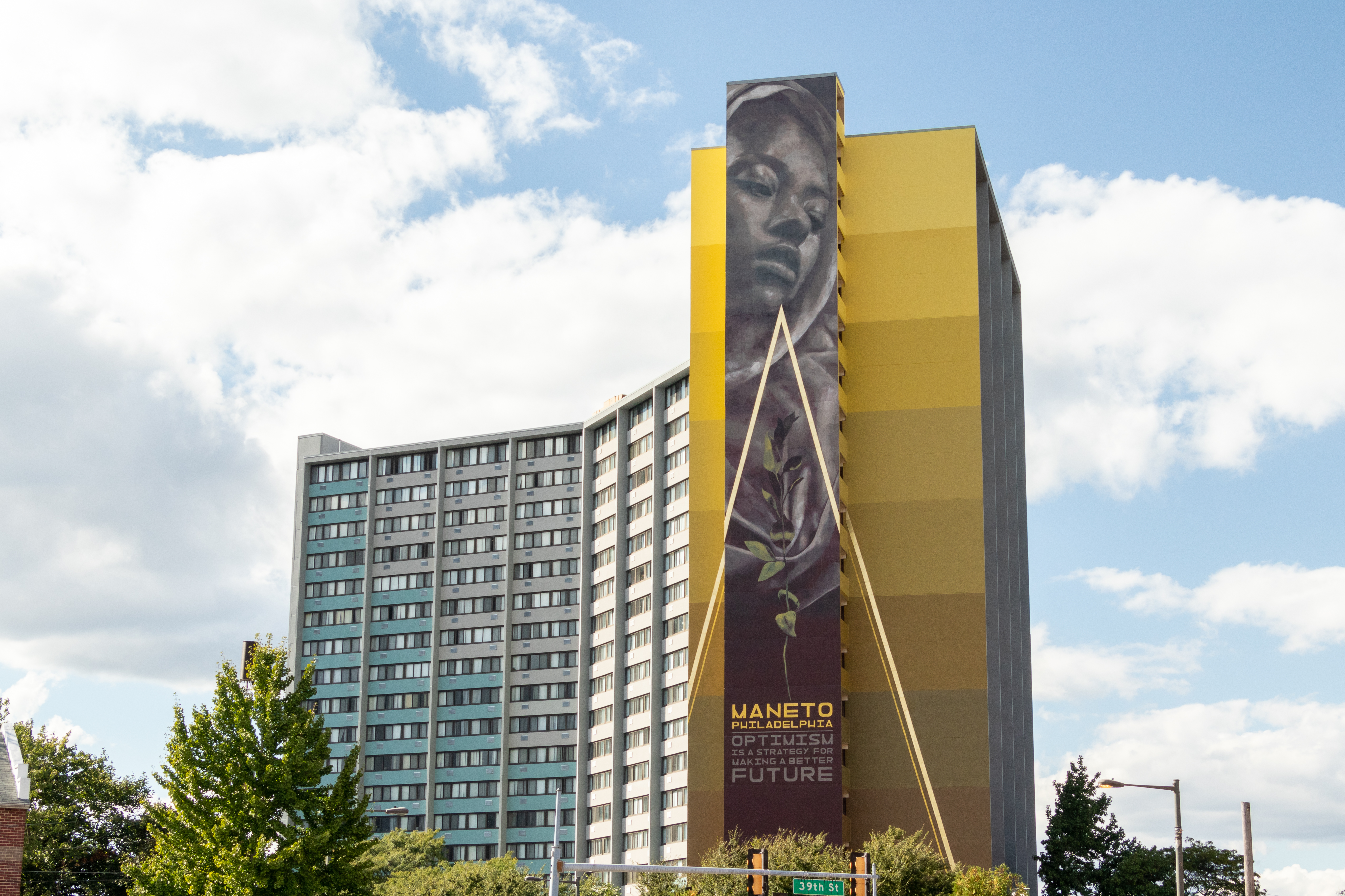 Faith XLVII’s West Philly mural features a woman looking down with a caring gaze. “The use of geometric lines, a color gradient, and contrasting gold accents bring the viewer’s eye upward, bringing a sense of hope and movement toward the future, as well as a calm, enduring strength in the current moment,” the mural’s project page explains. “Faith XLVII was inspired by the cultural, historical, and social aspects of the neighborhood, and included the words ‘Philadelphia Maneto’ from the City’s official seal, meaning ‘Let Brotherly Love Endure.’”