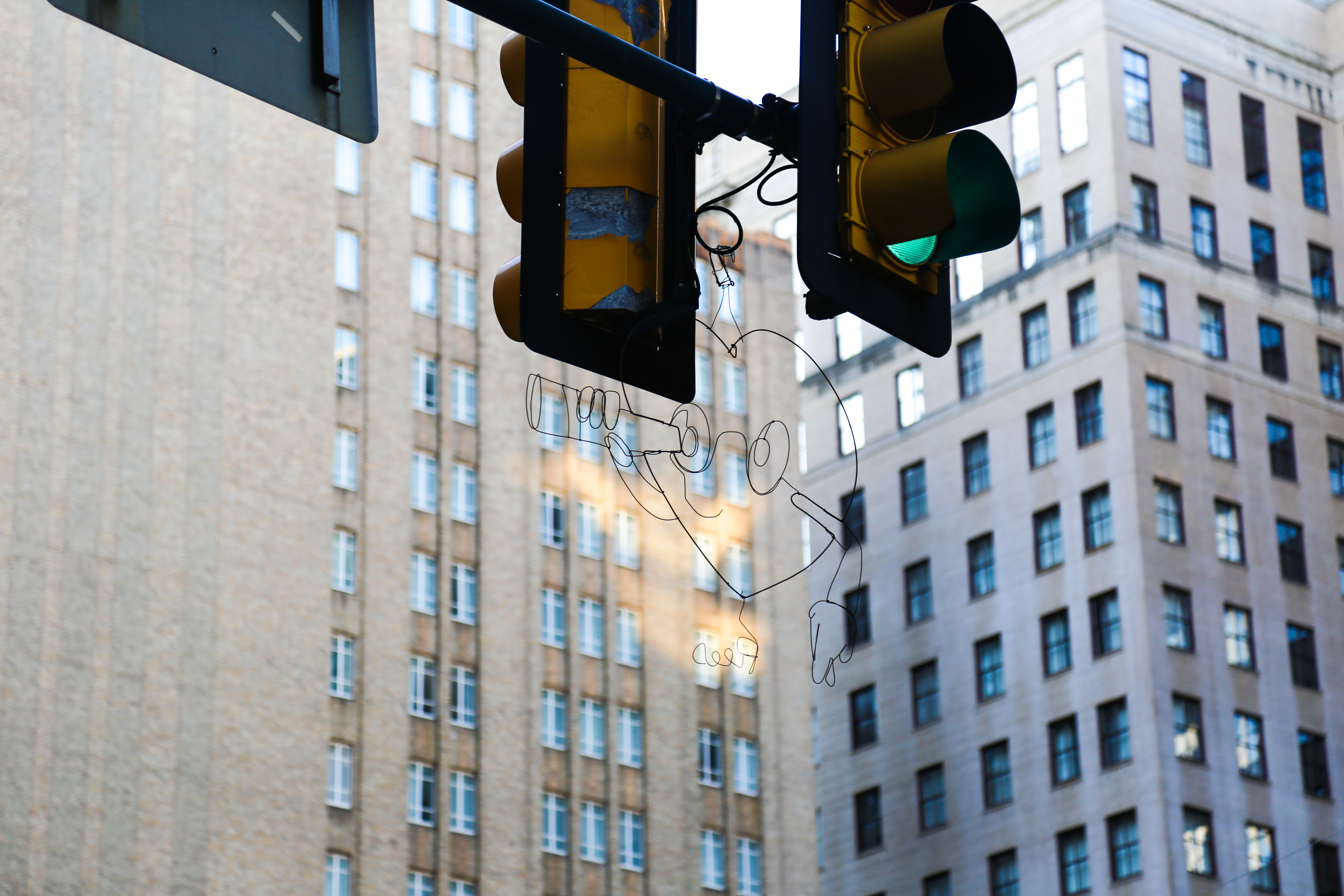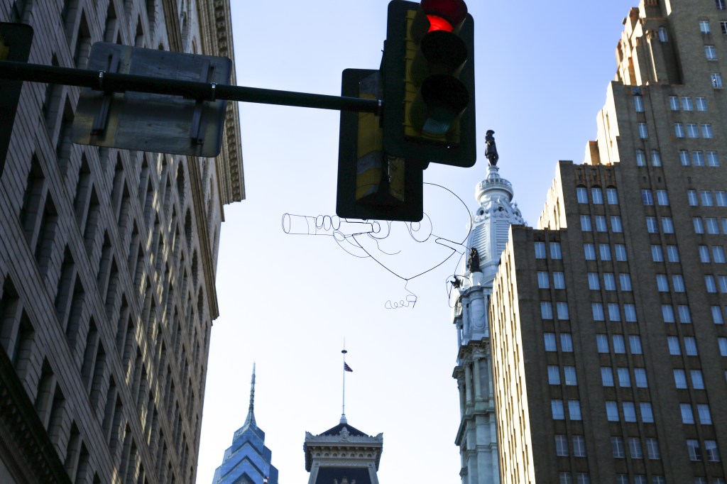 So Reed’s installations are made with super thin wire and hung high in the air on traffic light polls, which usually makes them pretty easy to miss. I’ve always found that a particularly endearing aspect of Reed’s work, not too dissimilar to sticker artists who get higher up on the backs of streets signs. Like, it can be a bit of work to spot those kinds of work, but if you do it’s a bit of a treat to discover. And there’s something about this 13th and Market spot that almost makes this new piece by Reed even more invisible. The busyness of that intersection or maybe the taller buildings surrounding it offering less of sky’s negative white space to see it. Either way, I noticed more people than usual really confused about where I was pointing my camera when I shot the photos for this post.