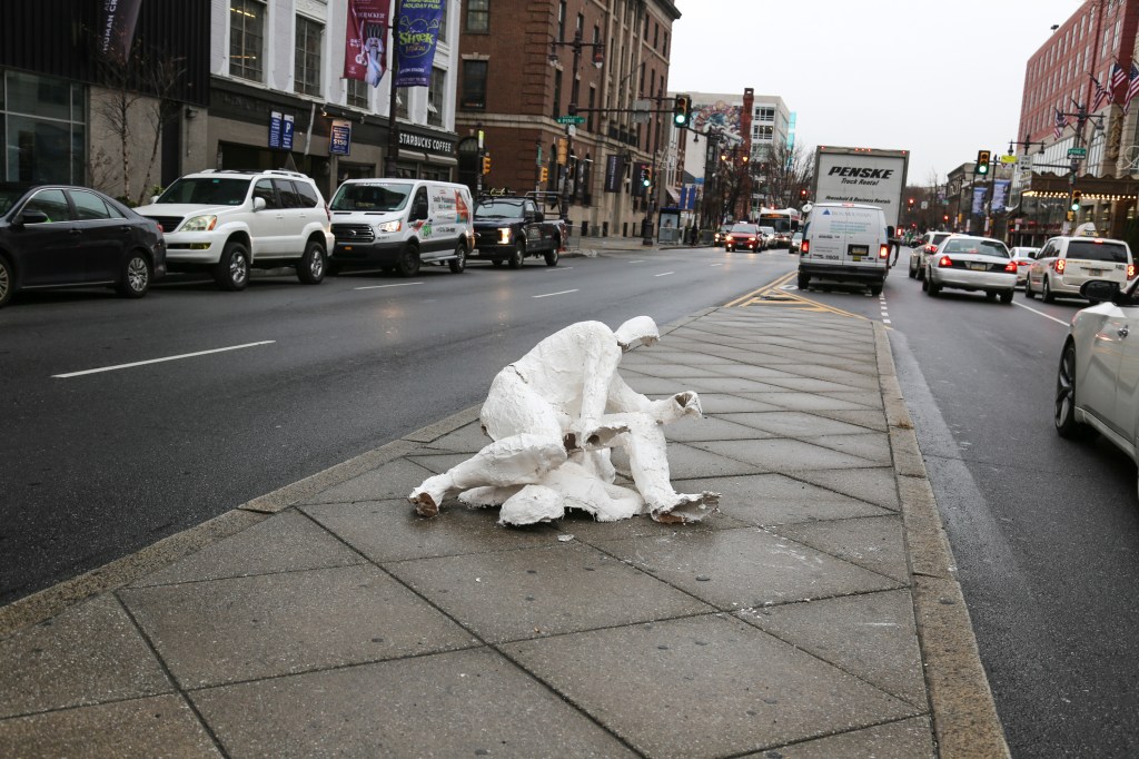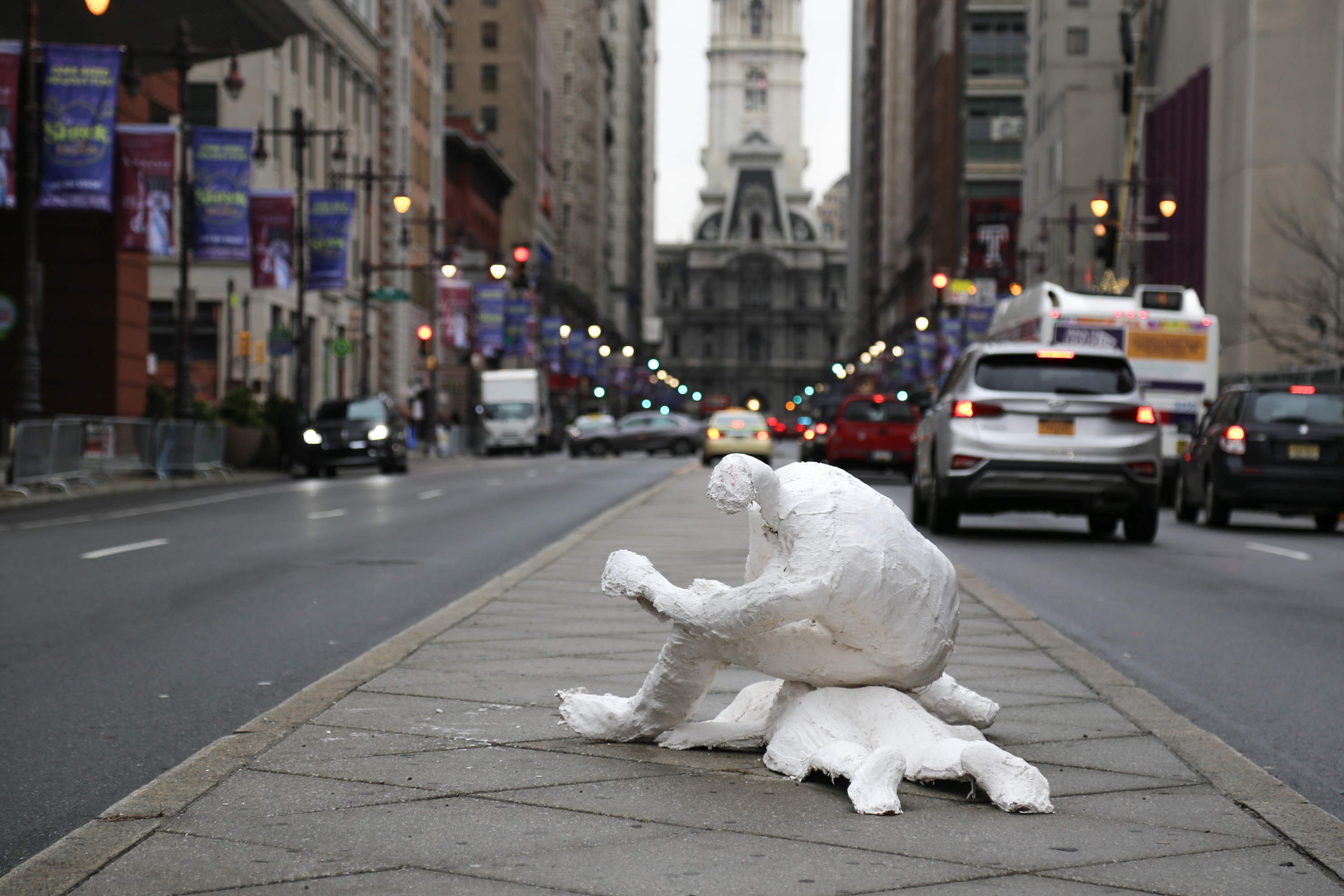 UPDATE (12/17/2019): After this post went live, a few commenters on Instagram connected us to the artist, Mark Anthony Addison, who’s an University of the Arts Sculpture major. Over Instagram direct message, Mark offered the following about the artwork and its placement: “It’s a life cast about police brutality, a personal experience that I’ve actually went through myself. I always leave work up and down Broad street, so I figured I might as well just leave this one there too. The street median seemed like the best place.”