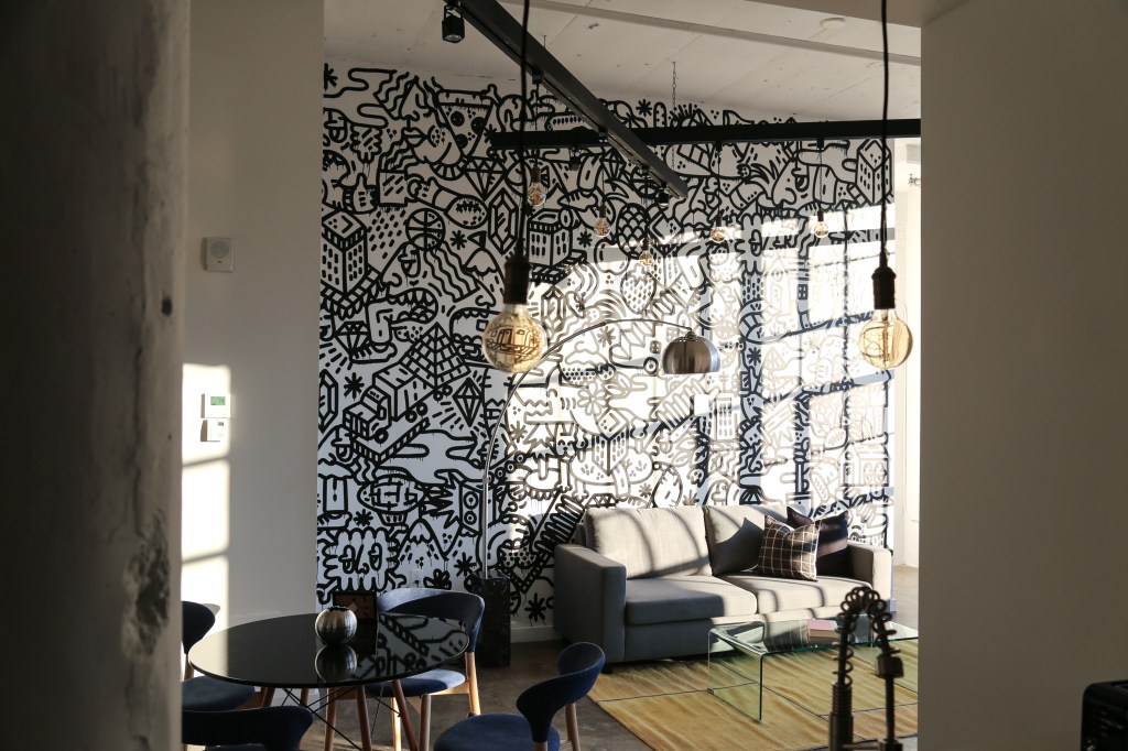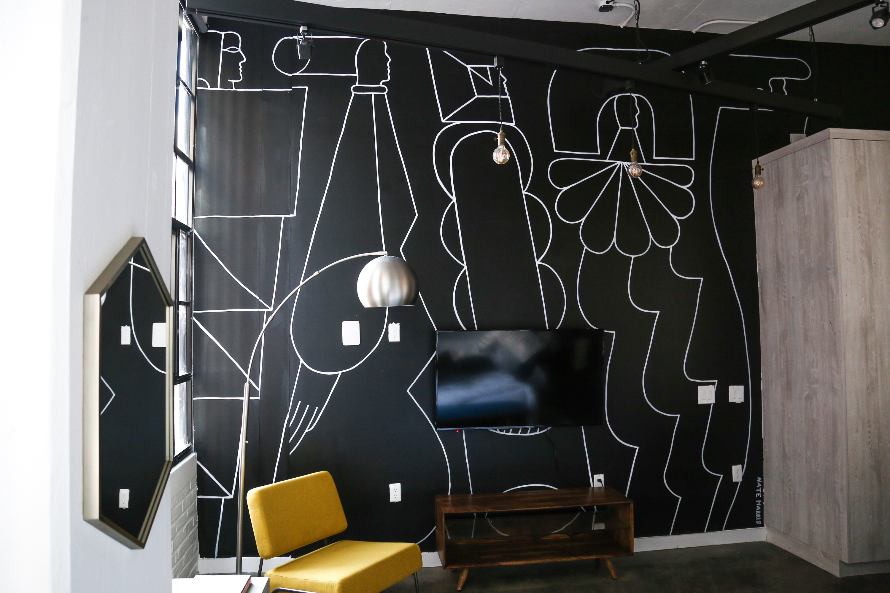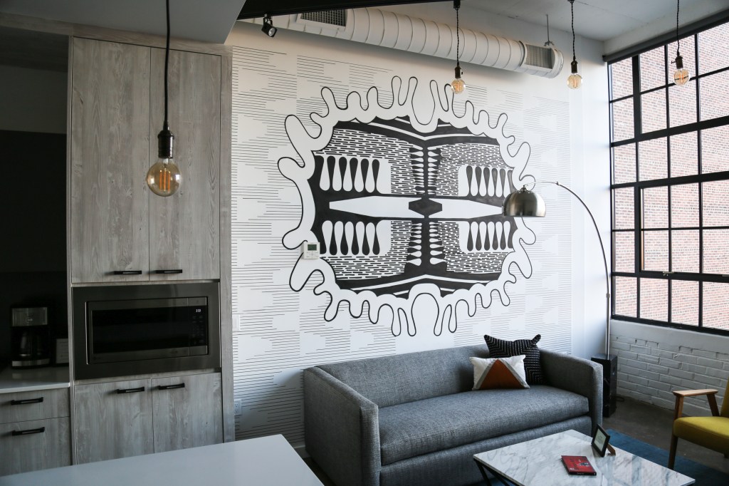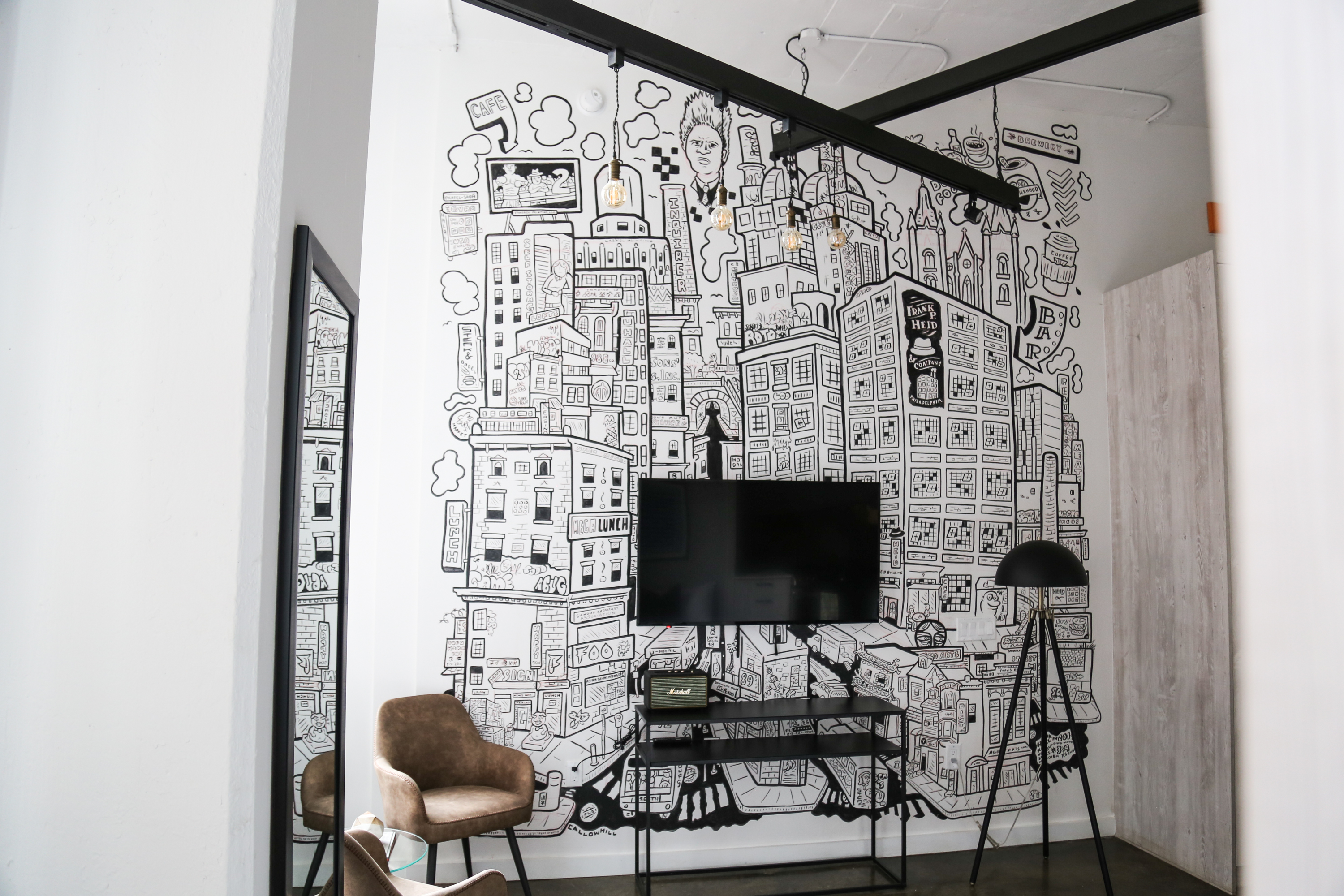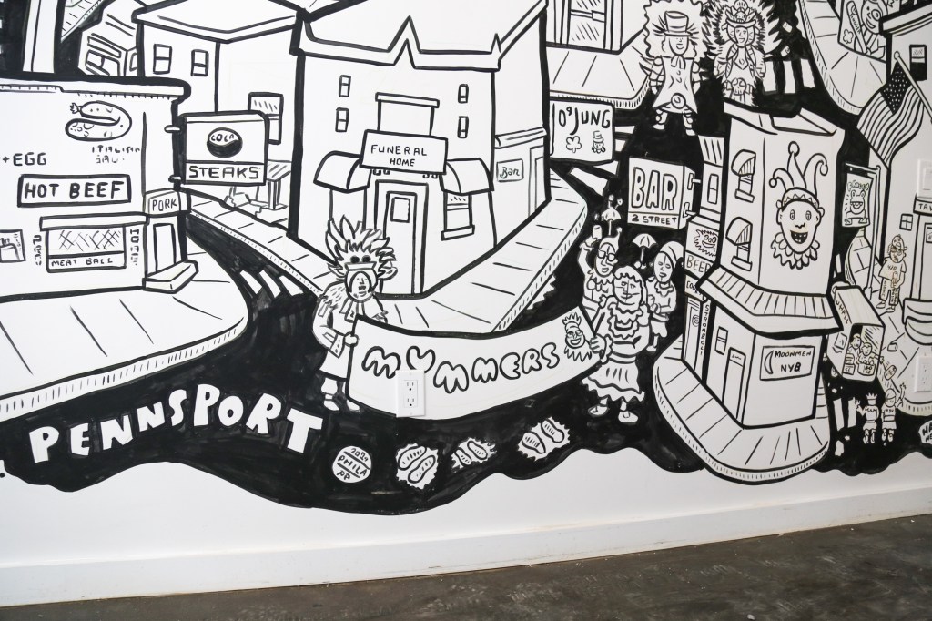 The artists selected for Sonder’s North 13th street Philly stays were curated by Sara McCorriston and Jason Chen of Paradigm Gallery + Studio, one of my favorite galleries in Philly, and feature brilliant abstract murals by artists Sophie Roach, Jason Andrew Turner, Adam Crawford, Ryan Beck, Nate Harris, Kyle Confehr, and murals paying homage to different Philly neighborhoods by artist Hawk Krall. And yes, there are so many winks and nods at well know and possibly more obscure Philly references in Hawk’s murals, like the Steel Furnace Party… Do attend!