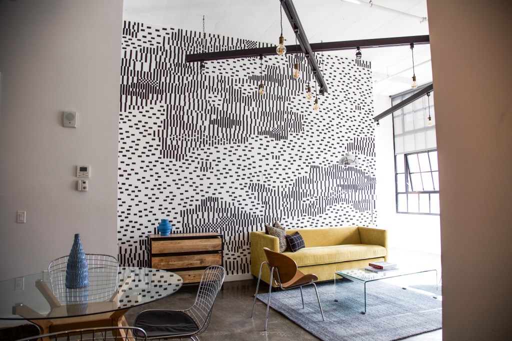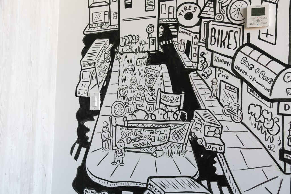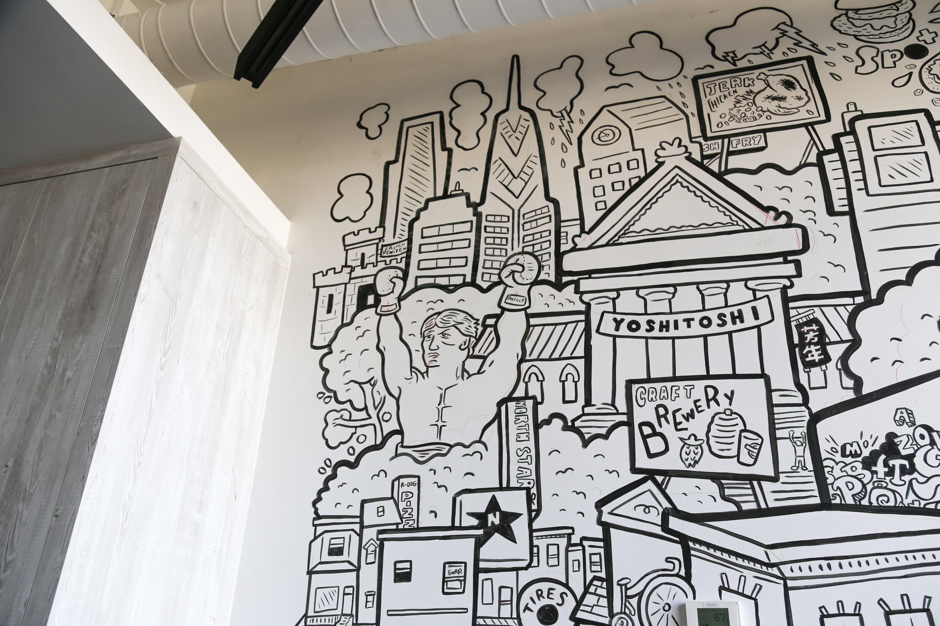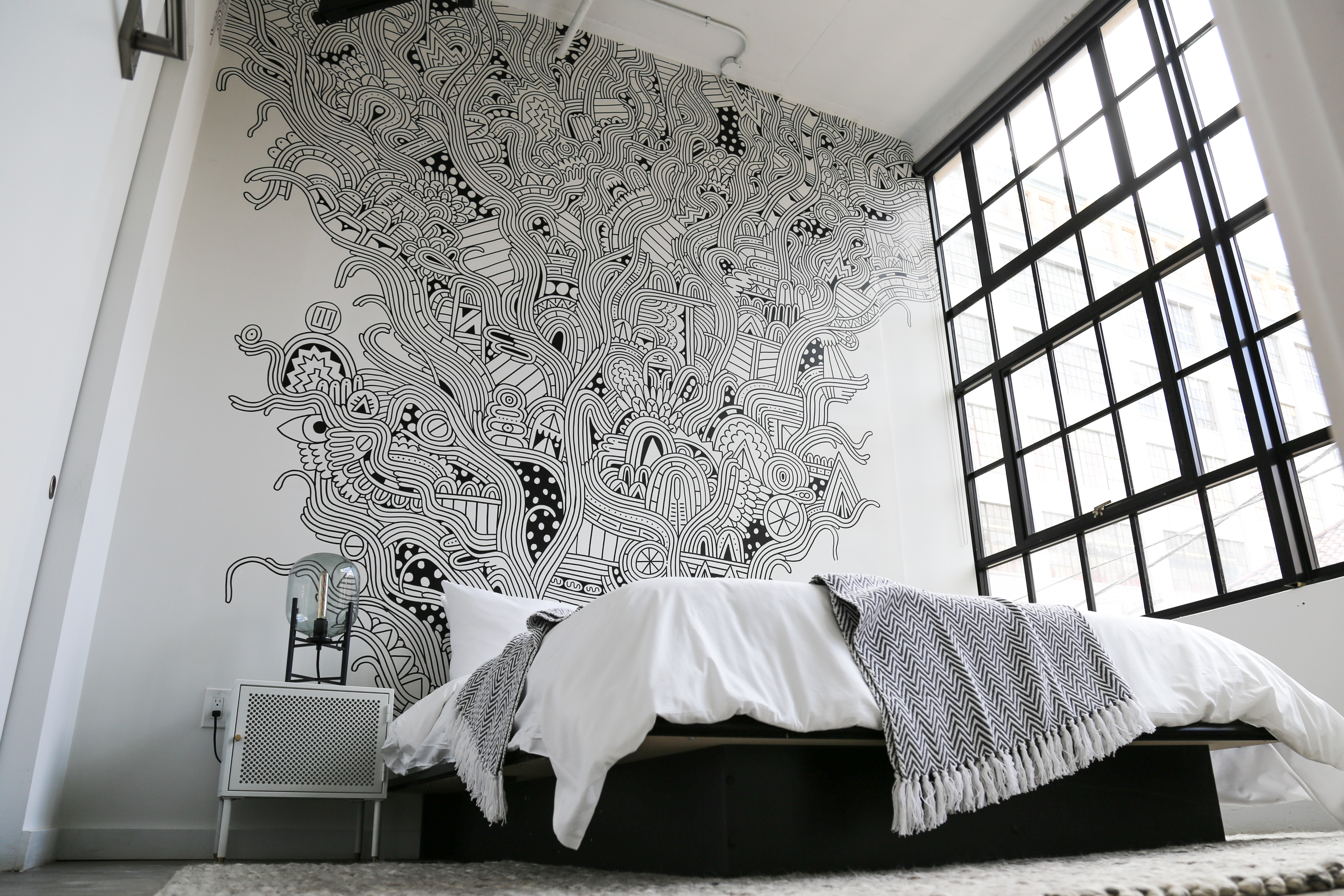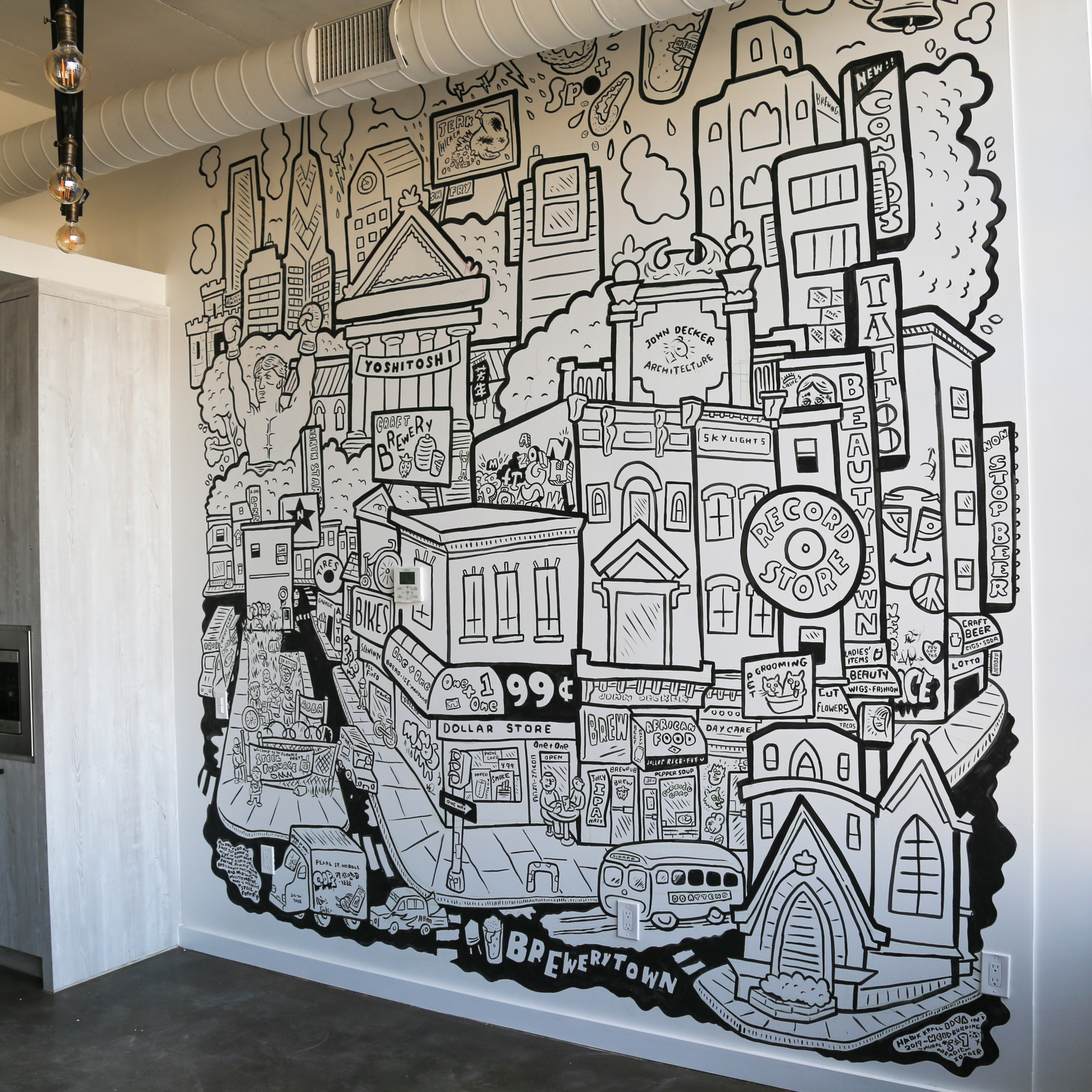 The artists selected for Sonder’s North 13th street Philly stays were curated by Sara McCorriston and Jason Chen of Paradigm Gallery + Studio, one of my favorite galleries in Philly, and feature brilliant abstract murals by artists Sophie Roach, Jason Andrew Turner, Adam Crawford, Ryan Beck, Nate Harris, Kyle Confehr, and murals paying homage to different Philly neighborhoods by artist Hawk Krall. And yes, there are so many winks and nods at well know and possibly more obscure Philly references in Hawk’s murals, like the Steel Furnace Party… Do attend!