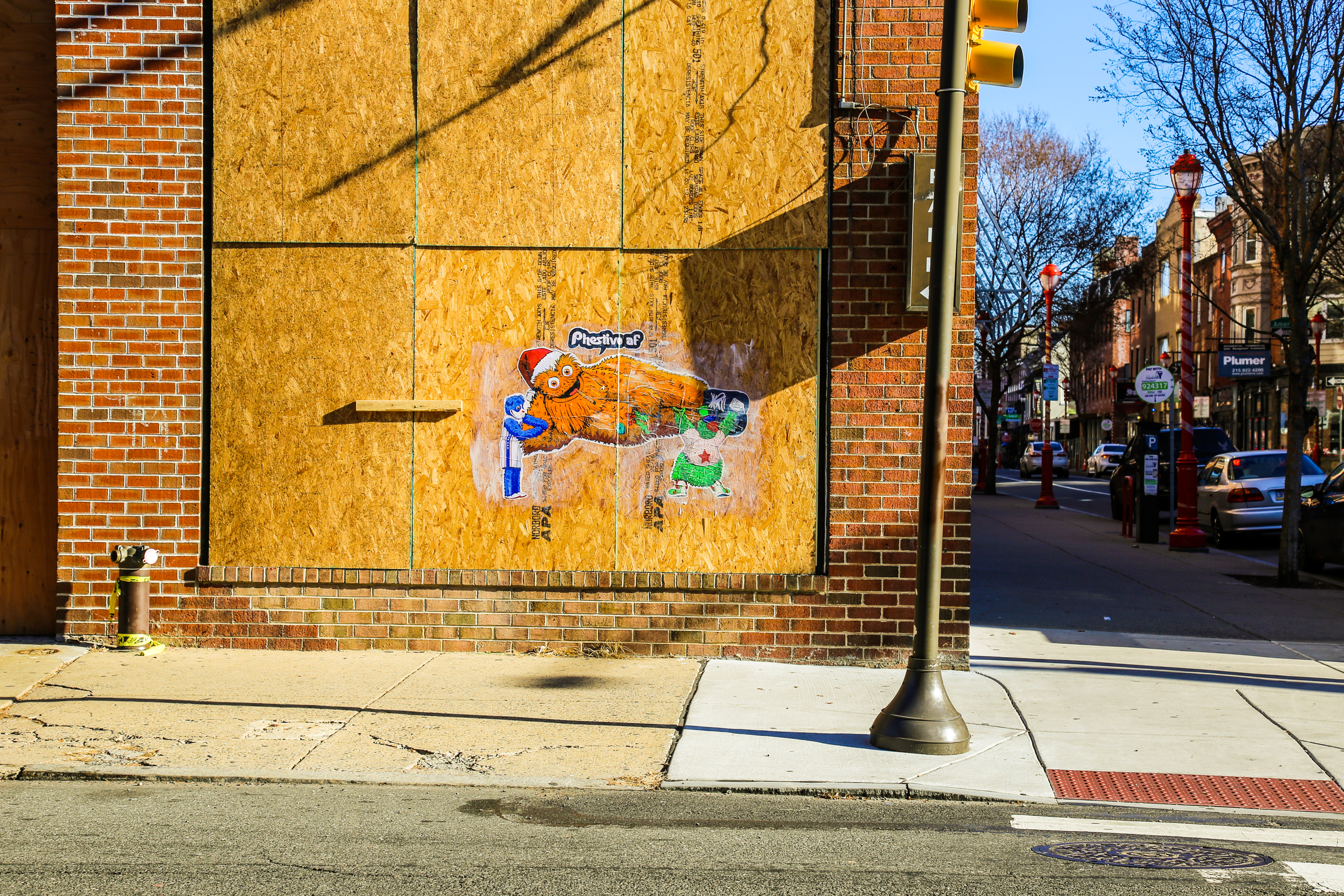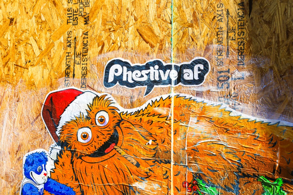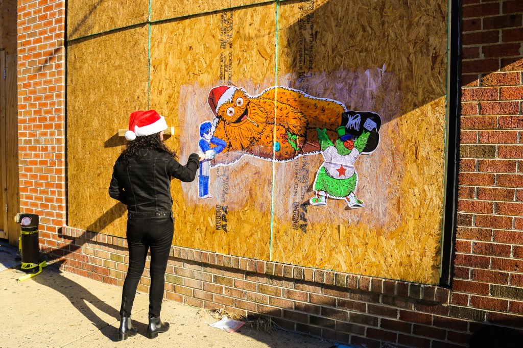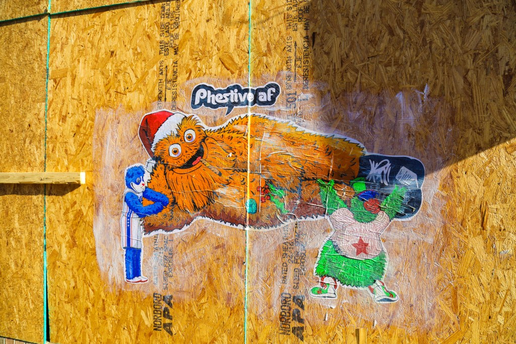 Philly based street artist Marisa Velázquez-Rivas is getting Philly’s favorite mascot “Phestive af” for the holidays with a new wheatpaste installed today at 3rd and South Streets featuring a paint-me-like-one-of-your-French-girls-posed Christmas Gritty bookended by the Phillie Phanatic and whatever the 76ers’ mascot is called!
