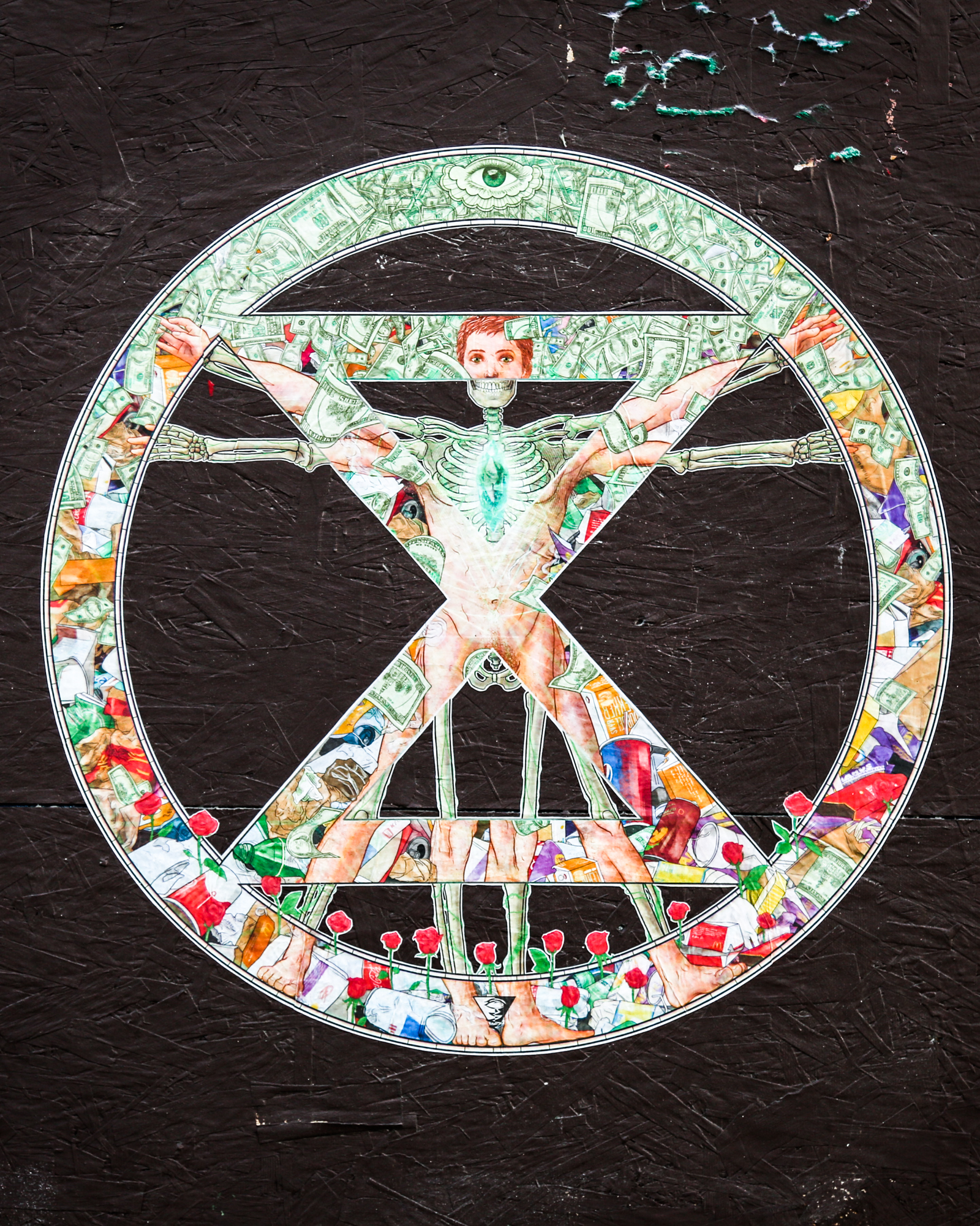 “[It’s] my take on the extinction symbol,” Doug wrote in an Instagram post about his wheatpaste’s design. “It encapsulates the range of my feelings on the subject of anthropogenic climate change, from a pessimistic fatalism to a kind of faith in the mysteries of life, death, and rebirth.”