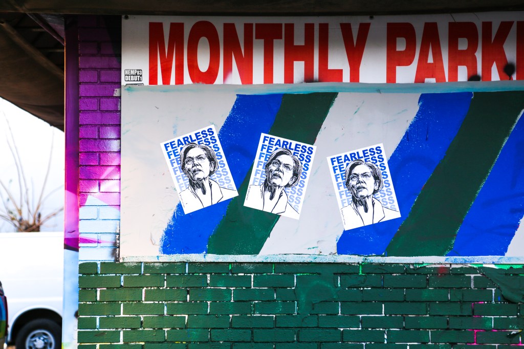 In late November, Hysterical Men wheatpasted one of their portraits of Elizabeth Warren, the one with the word “Fearless”, at a few locations around Philly including the spot documented for this post. And the piece mostly remains, though like a lot of works of political street art, it’s had some additions to it over the months including some stuff promoting Bernie. (Not pictured in my photos, because I shot this wheatpaste before those additions.) And after a mostly media-fueled “controversy” between Warren and Bernie that’s caught national attention these last couple of weeks, I have some thoughts.