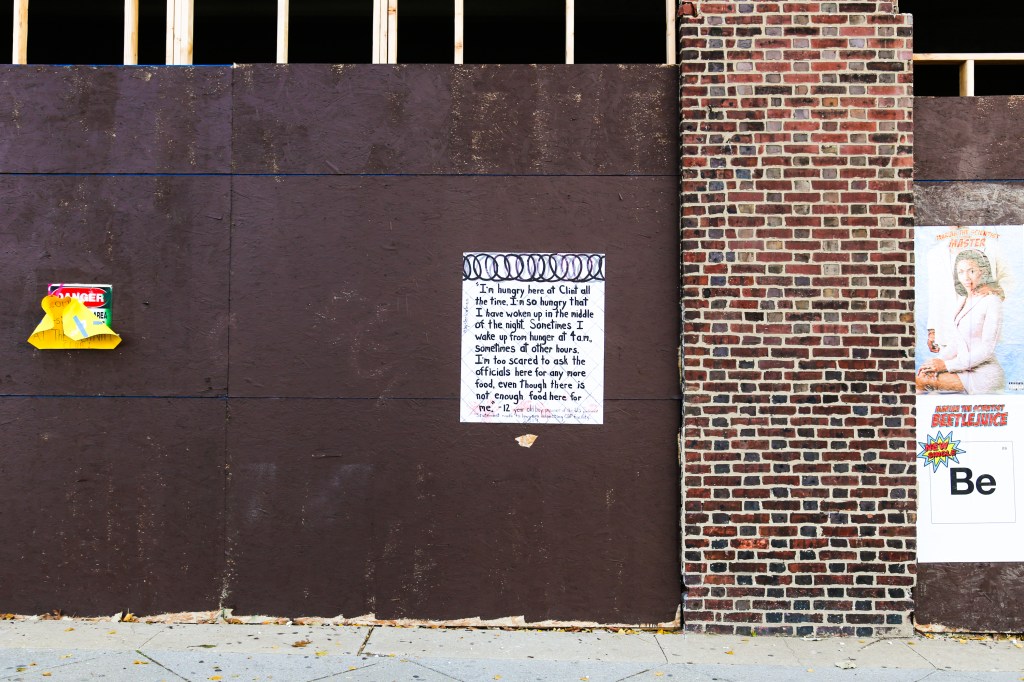 On a recent and relatively short walk through South Philly, I came across not one but two different street art installations by two different Philly artists that both aim to call our attentions to the fact that we have prison camps at the southern border. One, the yarnbomb photographed above, by Ishknits at 15th Street and Washington Avenue. The other, the wheatpaste photographed below, by Hysterical Men at Broad Street at Fitzwater Streets.