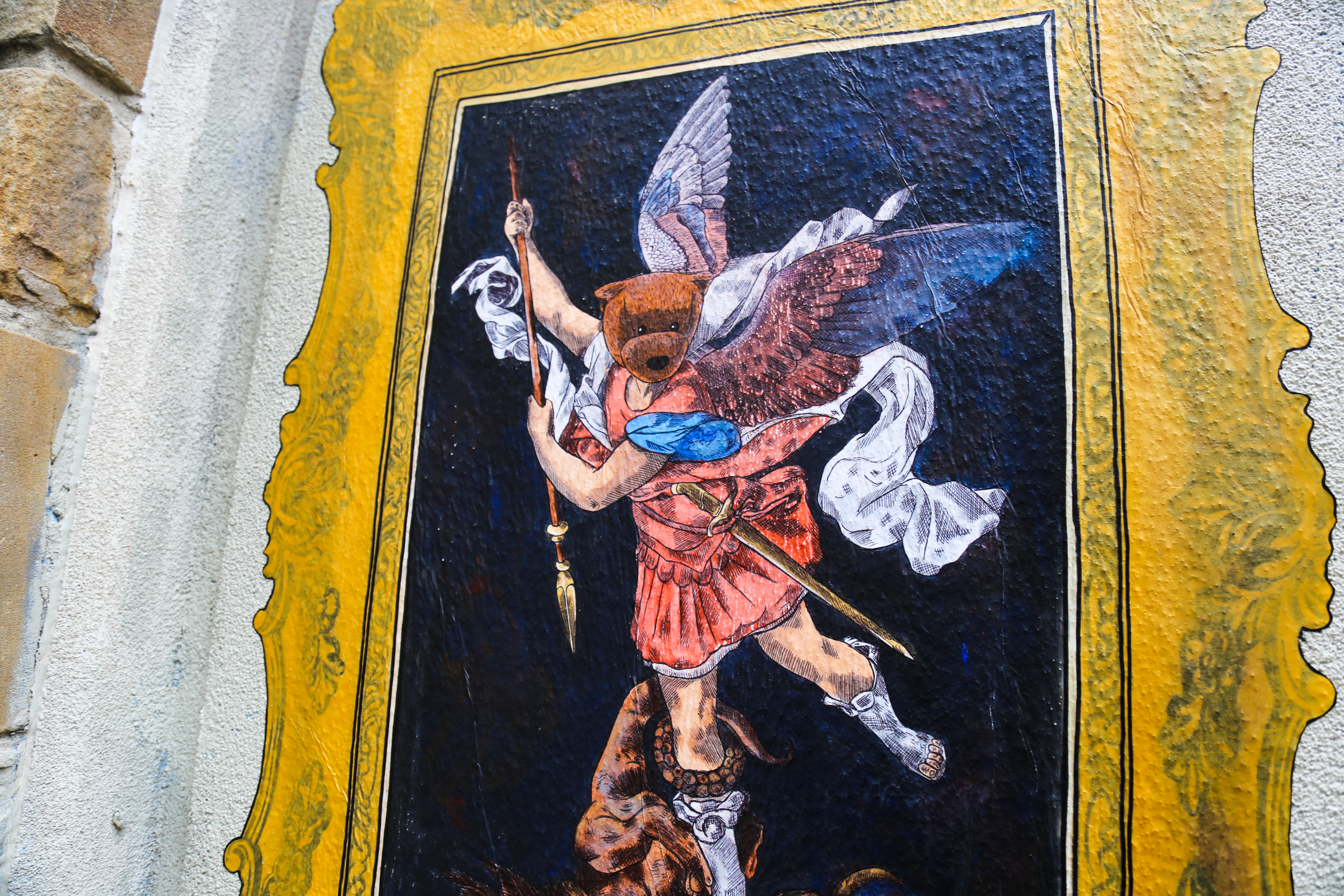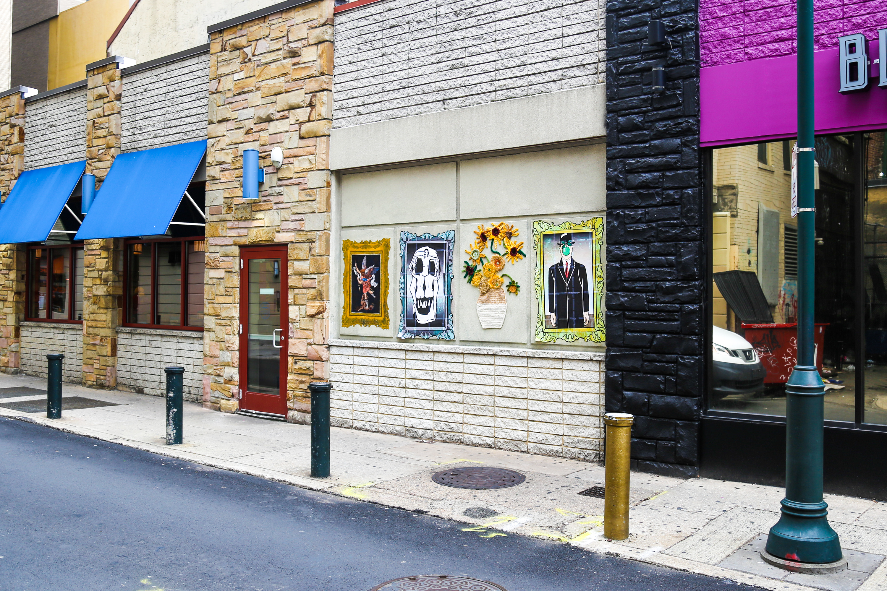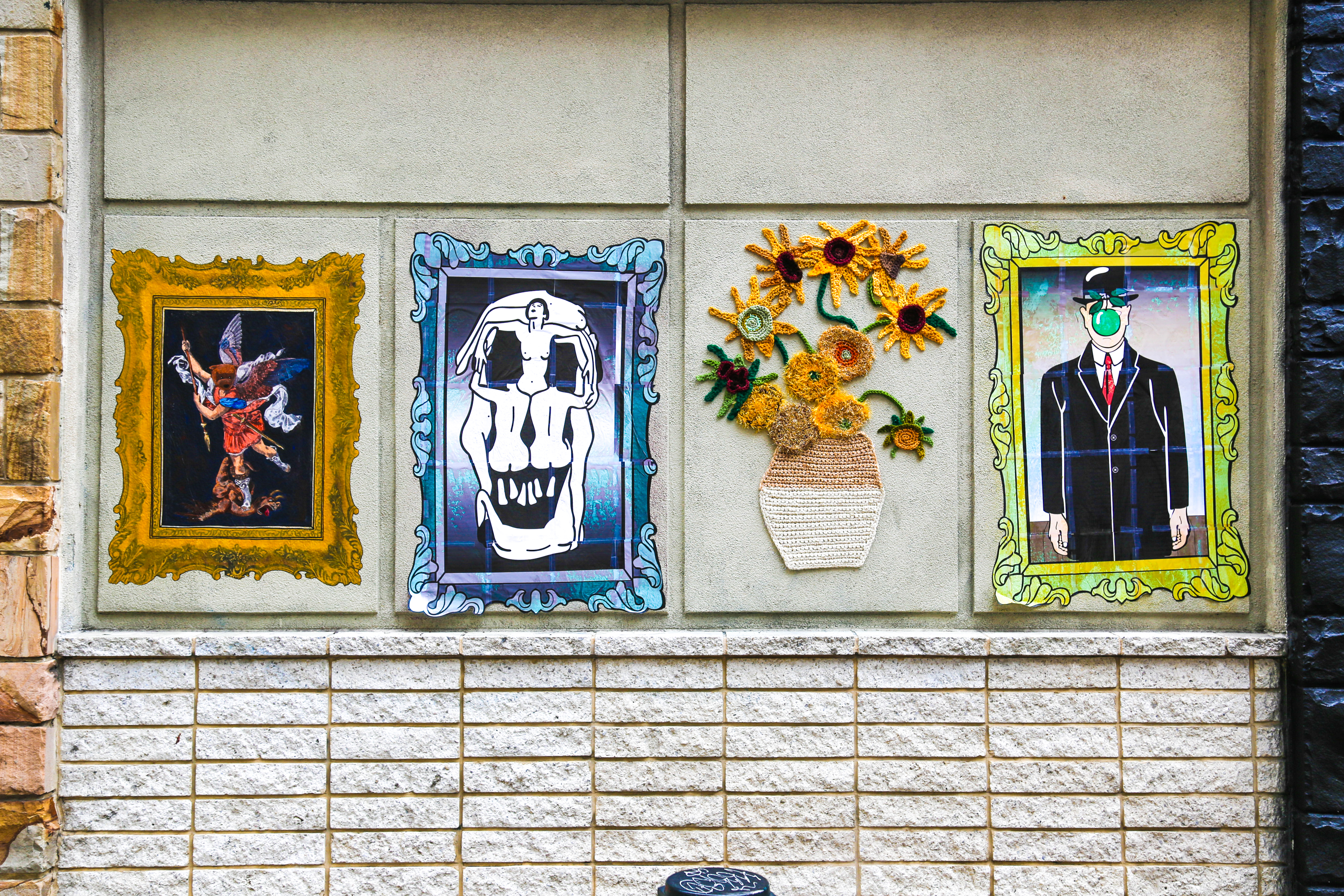 Located on Juniper Street between Walnut and Locust Streets in the Gayborhood, the new installations pay homage to classic works of art from some of art history’s masters: Sean 9 Lugo creating a wheatpaste interpretation of the Raphael painting, St. Michael Vanquishing Satan; Nicole Nikolich (aka Lace in the Moon) yarnbombing a piece inspired by Vincent Van Gogh’s Vase with Twelve Sunflowers. And Gray Days with wheatpaste versions of René Magritte’s The Son of Man and Voluptas Mors by Salvador Dalí and Philippe Halsman.