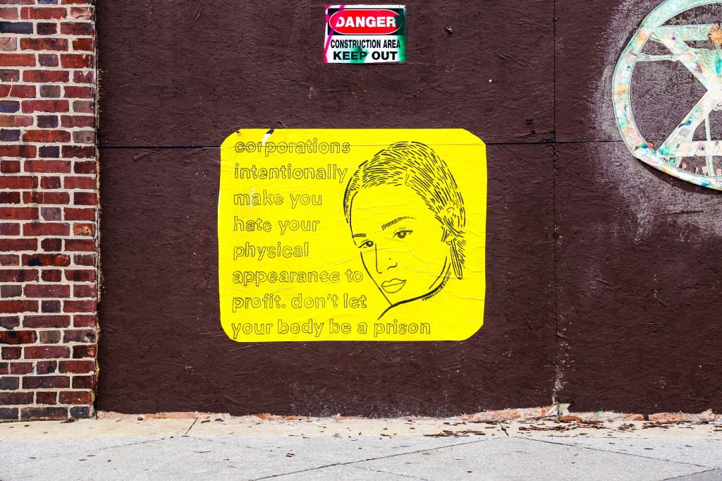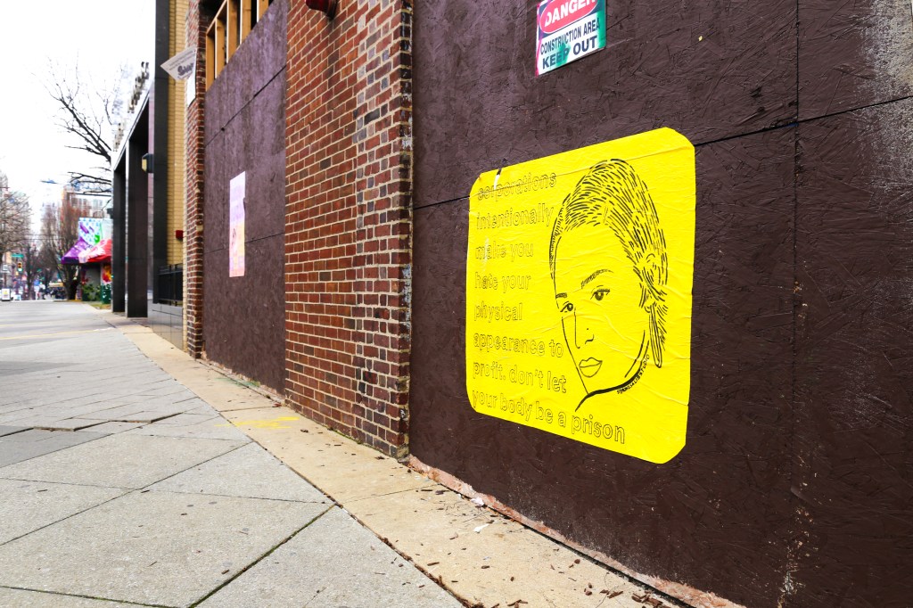 “Corporations intentionally make you hate your physical appearance to profit,” the wheatpaste reads. “Don’t let your body be a prison.”