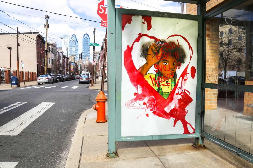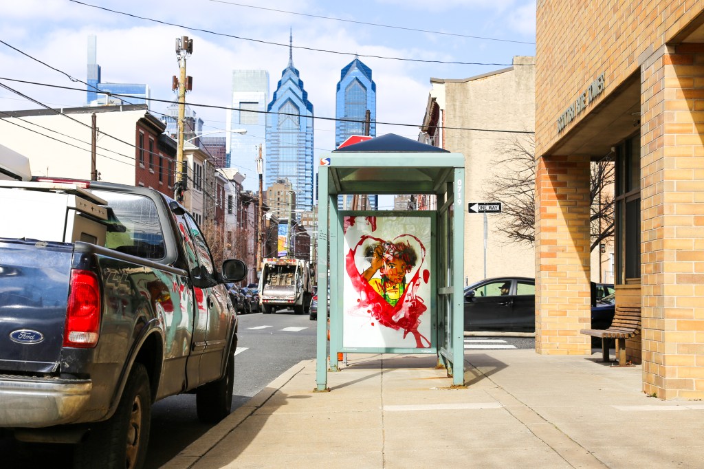 Olivia’s piece, installed at 16th and Fitzwater Streets in South Philly, has been installed as an ad takeover. That’s when an artist replaces an outdoor ad (in this case a bus shelter ad) with their art. And as someone who has very publicly come out against outdoor advertising, I love it!