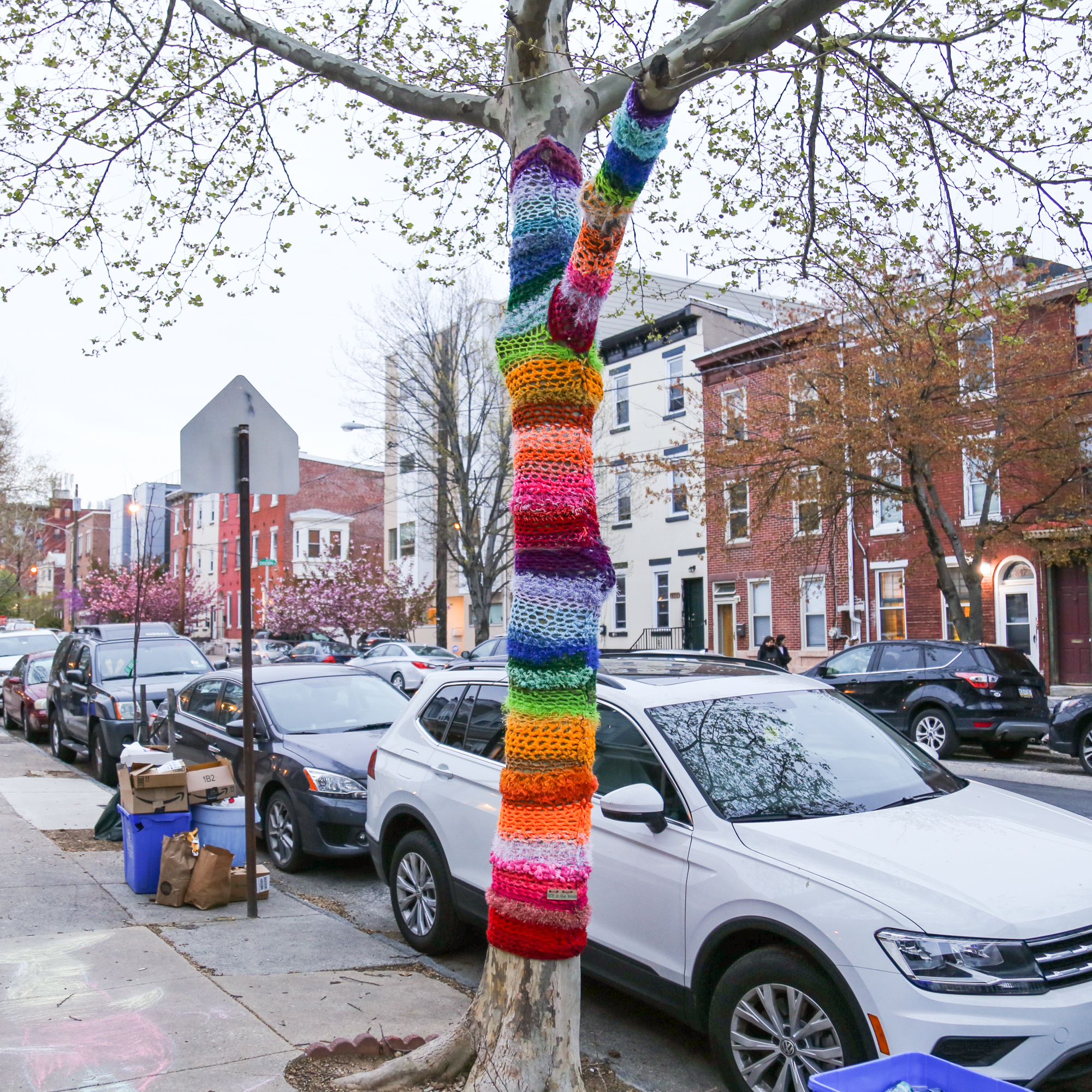 As Philadelphians across the city create rainbow art for their windows and paint rainbows in chalk on their sidewalks, one family in Fairmount hired a local street artist to yarnbomb a 12 ft. rainbow tree!