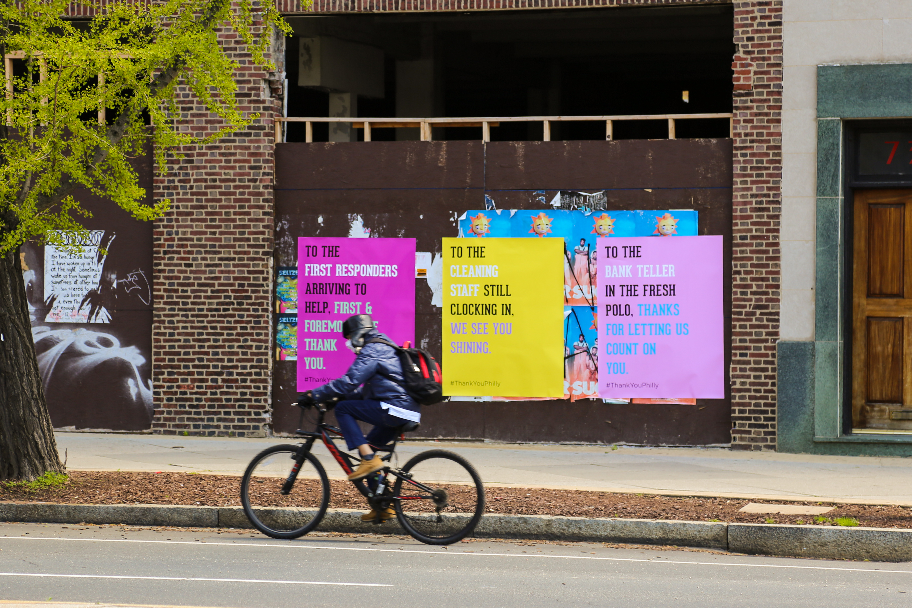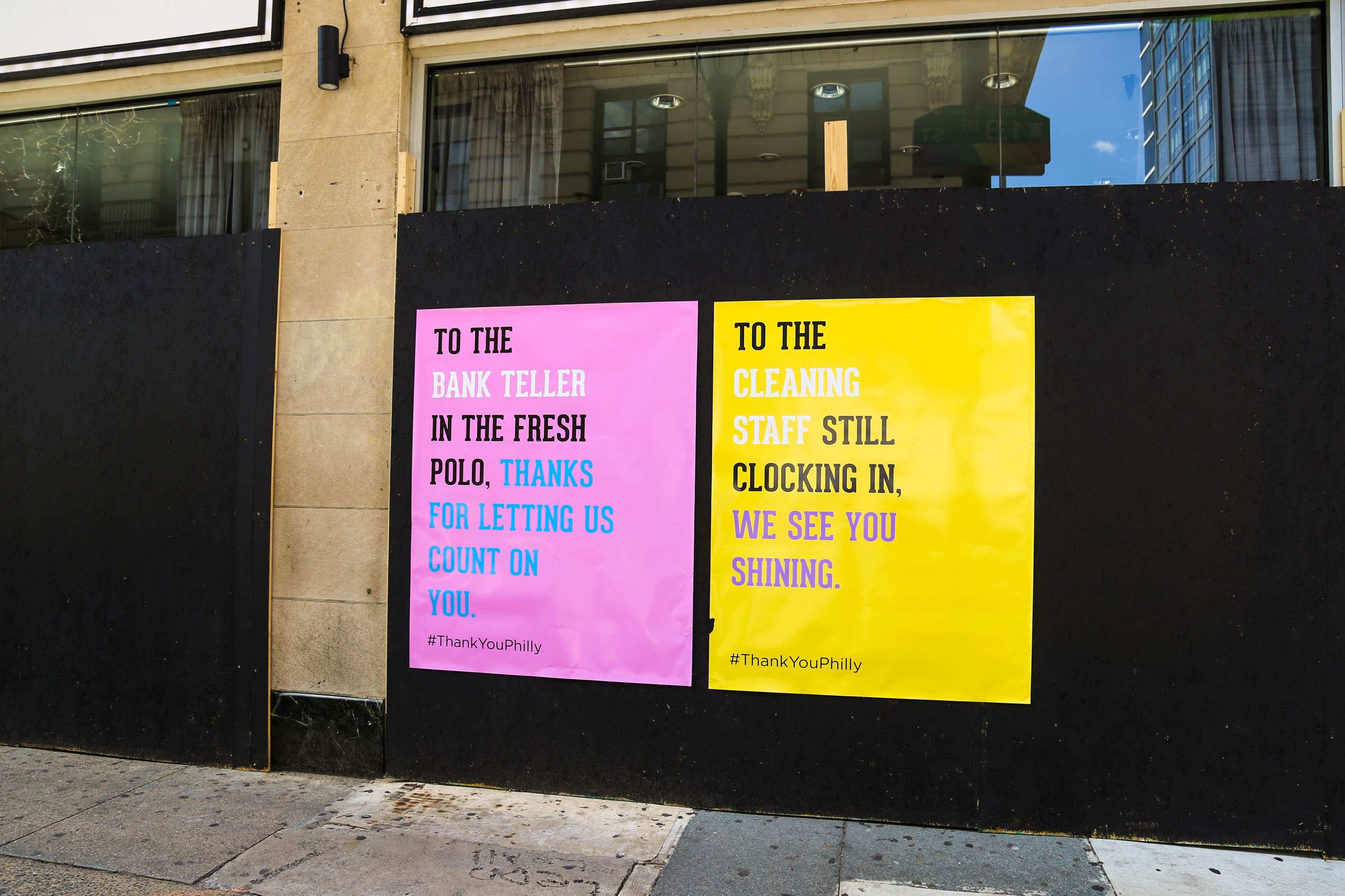 Today, Philadelphia used many of those plywood panels on some of the boarded up businesses around the city to send messages of thanks to Philly’s essential workers!