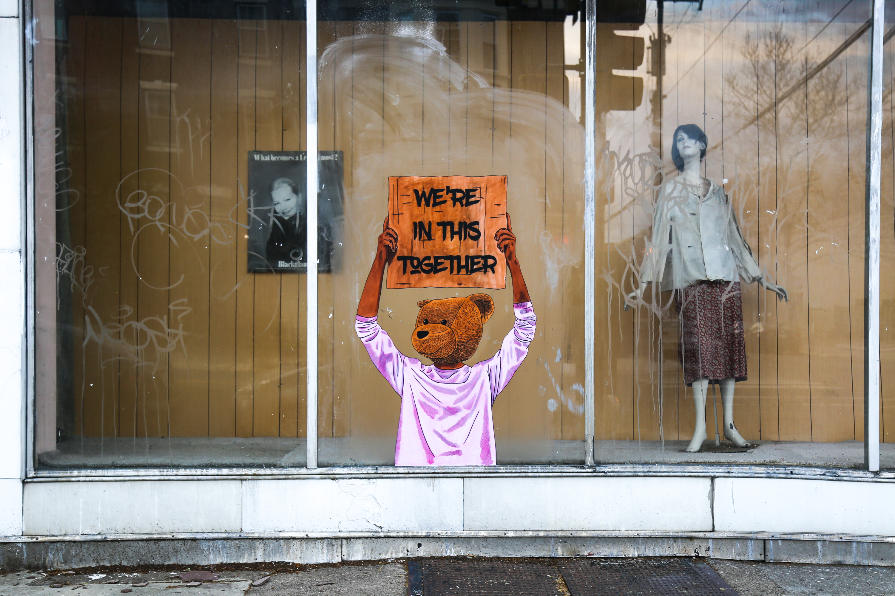 The new artworks feature one of Sean’s classic animal headed figures holding a cardboard protest sign with different text. And for this series the figure featured was inspired by @DudeWithASign, the viral Instagram meme generator that’s earned over 7 million followers. The wheatpastes photographed for this post are installed at Broad and Jackson Streets and Broad and Wharton Streets, respectively, in South Philly. And they read, “Thank you doctors, nurses, and medical staff,” and “We’re in this together.”