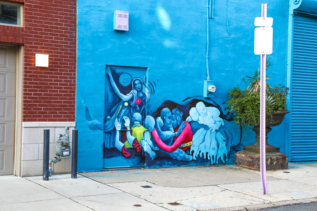 Curious about the new additions, I called Meg Saligman. With the working title of, Hugging Pile, Meg told that she was inspired to create the mural in response to how she was feeling in this moment as the entire city is under stay-at-home orders to help slow the spread of the Coronavirus pandemic. Meg’s studio, usually bustling with staff and projects, is a one-woman-workshop while all non-essential work is halted. She wanted to paint what she was longing for, Meg said: human touch, a hug, togetherness. So she got to painting for herself and for her neighbors to enjoy.