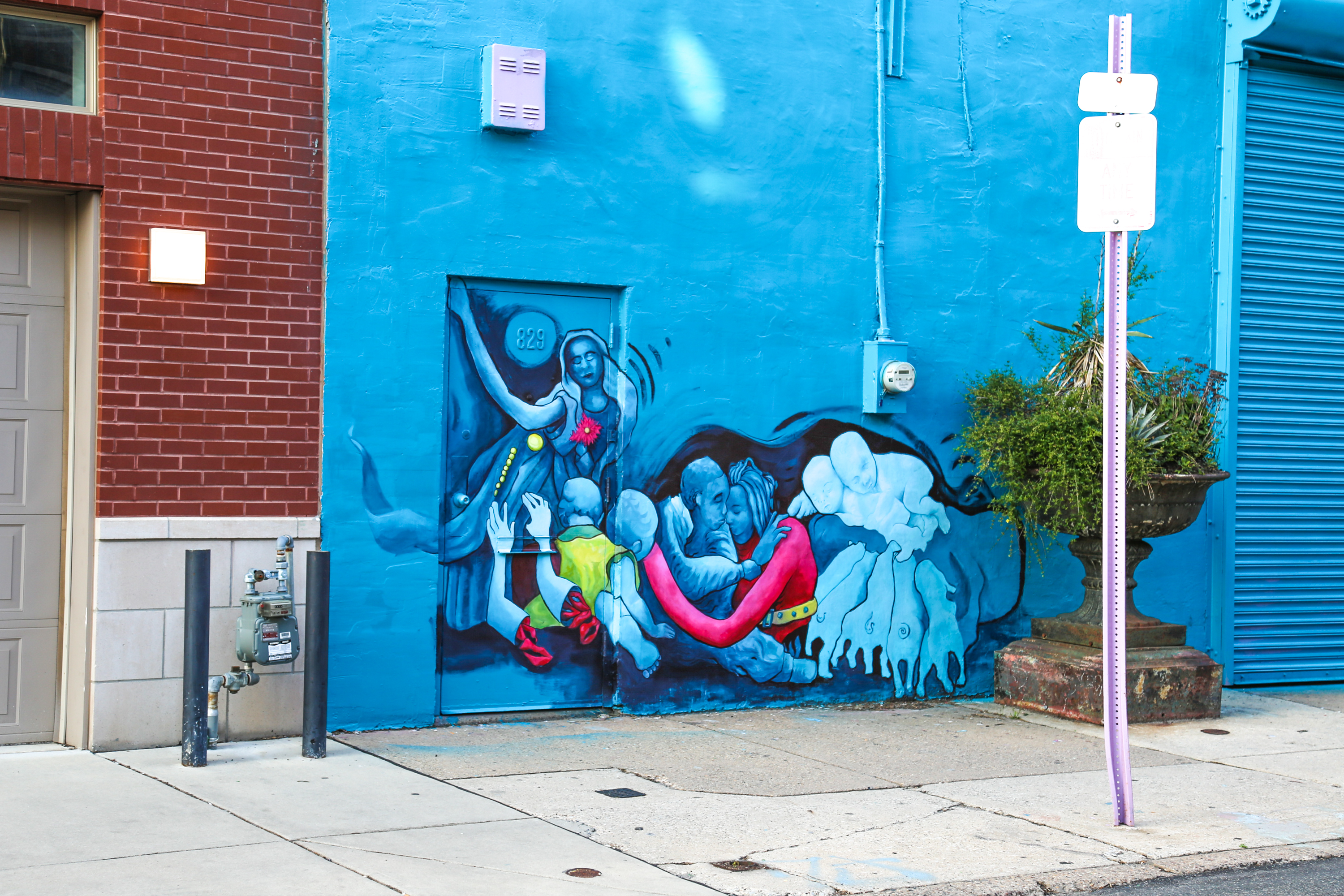 Meg is, of course, one of our city’s most legendary public arts makers, creating such iconic Philly murals as Common Threads (1998) and Philadelphia Muses (2001). Meg’s studio, which is located on Bainbridge Street between 8th and 9th Streets, has hosted a number of rotating murals over the year including this much beloved one predicting the Philadelphia Eagles 2018 Super Bowl victory. That Eagles mural, by the way, is still there! This wall is pretty long. But, closer to the 9th Street side of the building, a new work of art featuring people and animals huddled close together has started to be painted.