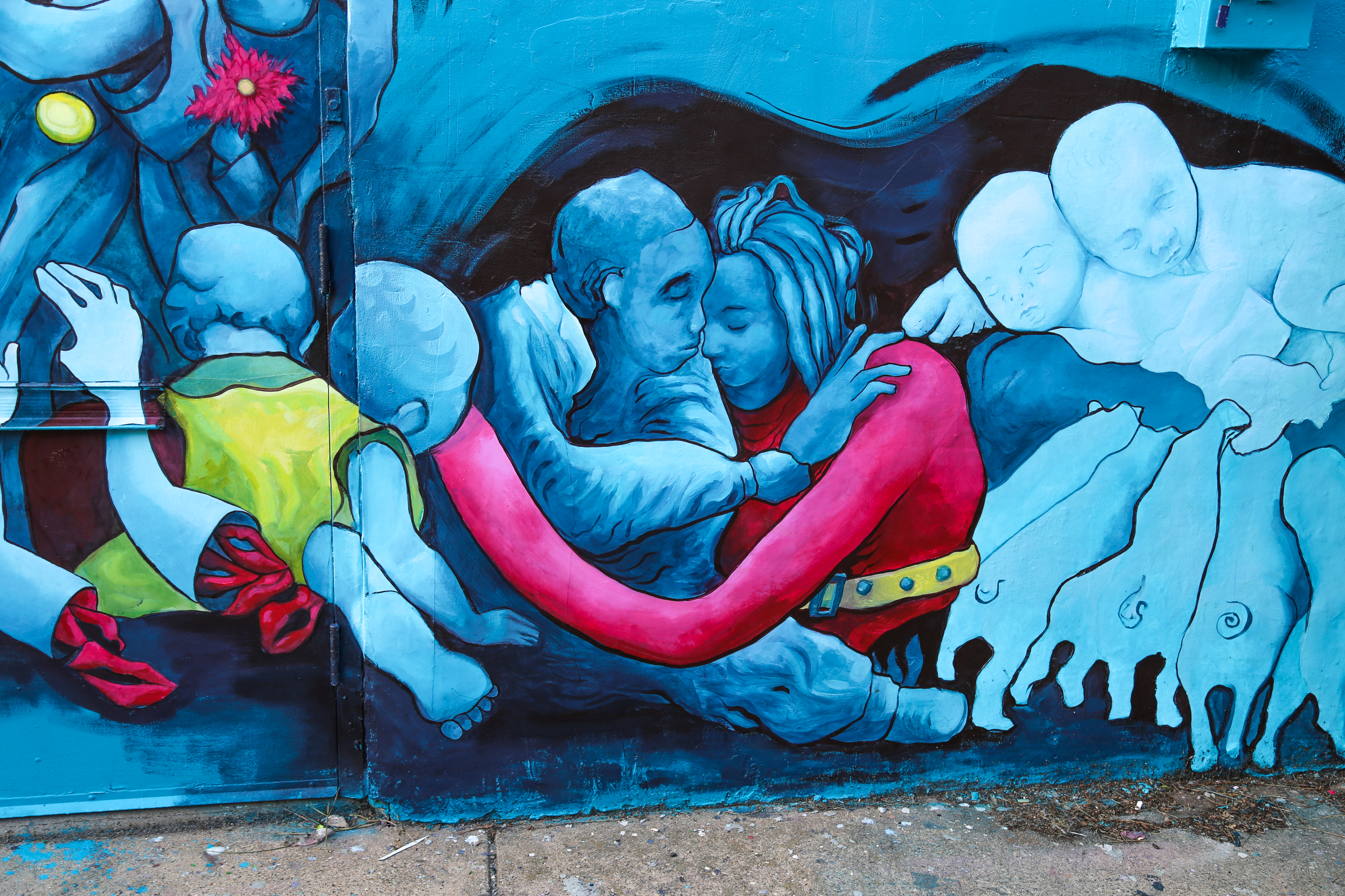 Curious about the new additions, I called Meg Saligman. With the working title of, Hugging Pile, Meg told that she was inspired to create the mural in response to how she was feeling in this moment as the entire city is under stay-at-home orders to help slow the spread of the Coronavirus pandemic. Meg’s studio, usually bustling with staff and projects, is a one-woman-workshop while all non-essential work is halted. She wanted to paint what she was longing for, Meg said: human touch, a hug, togetherness. So she got to painting for herself and for her neighbors to enjoy.