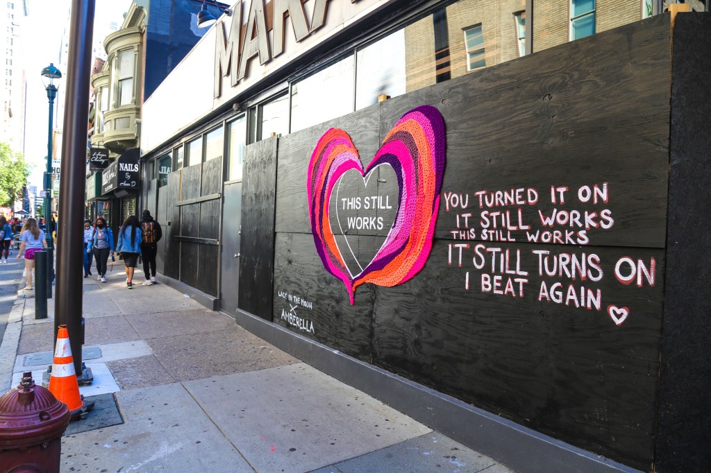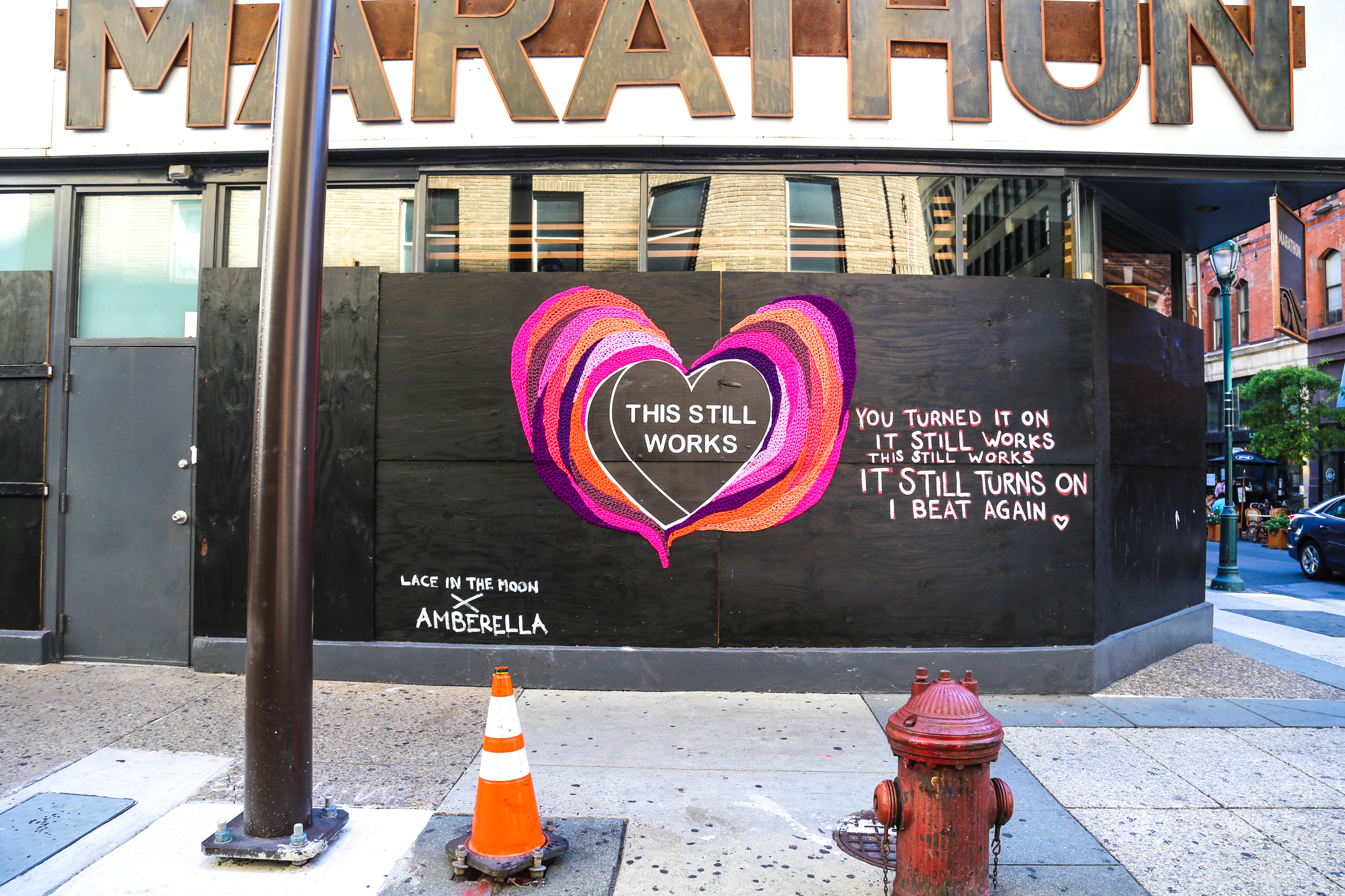 Love this new installation by Philly/LA-based artist Amberella and Philly-based artist Nicole Nikolich (aka Lace in the Moon), installed this weekend at 16th and Sansom Streets! The piece includes one of Amberella’s hearts that says “This Still Works” hugged by several layers of yarnbomb from Lace, next to text that reads: “You turned it on. It still works. This still works. It still turns on. I beat again <3”