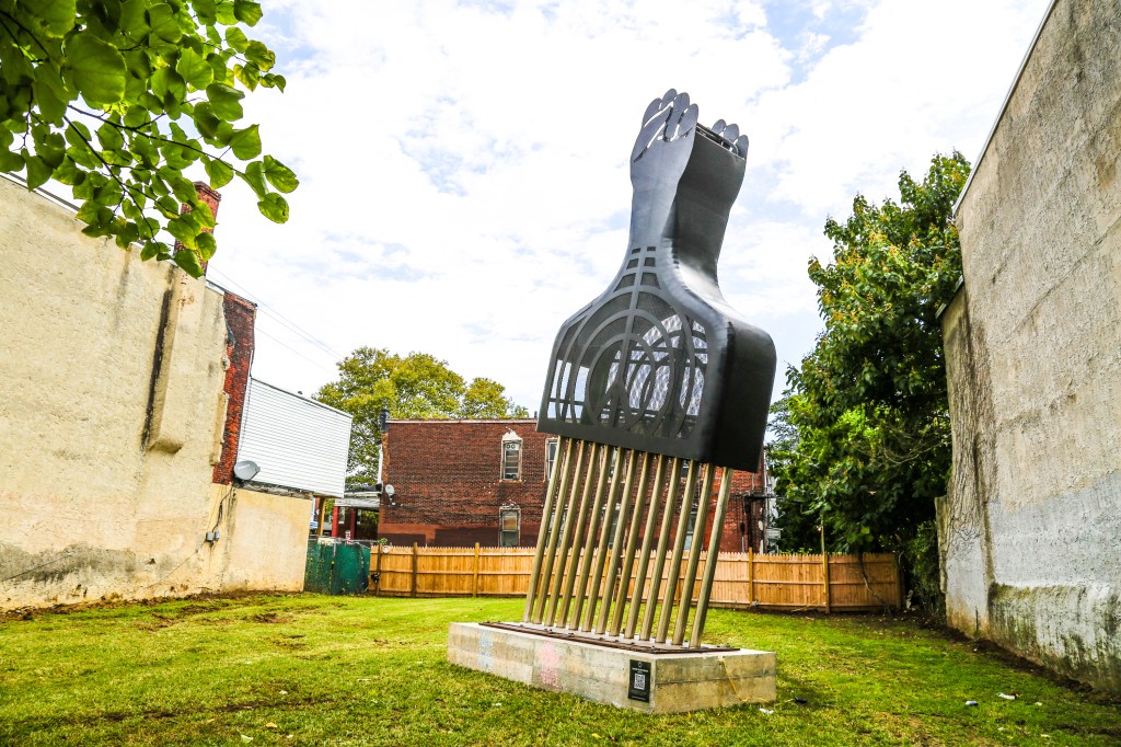 Love this! Many of y’all might remember back in 2017 when artist Hank Willis Thomas installed an 8-foot tall Afro Pick monument next to the former Rizzo statue at MSB Plaza in Center City, Philadelphia as part of the city-wide exhibition Monument Lab, and this week the artist is back with a 25-foot version of the sculpture installed on 52nd Street off Arch Street in West Philadelphia!